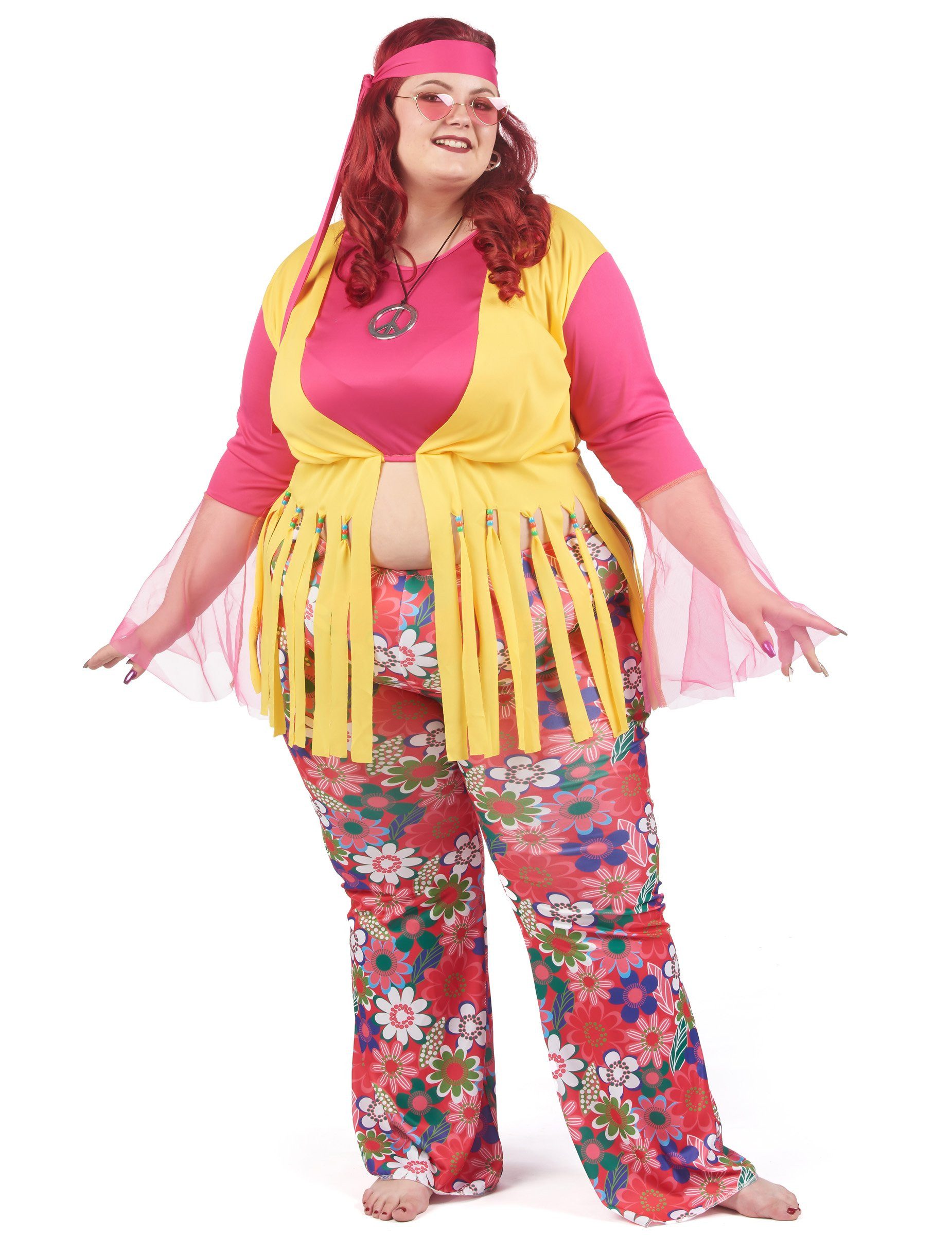 Dieses Plus Size Hippie-Kostüm ist für Damen. Dieses Kostüm-Set beinhaltet ein kurz geschnittenes rosafarbenes Oberteil, eine gelbe Weste mit langen Fransen und eine Hose mit elastischem Bund, die mit verschiedenen Blumenmustern verziert ist. Brille und Schmuck sind nicht im Lieferumfang enthalten. Das Oberteil zeichnet sich durch ausgestellte Netzstoffärmel aus und ist direkt mit der rosafarbenen Weste vernäht. Ein passendes Stirnband im Bandana-Stil rundet das Outfit ab. Es ist rosafarben und hat die Maße 150 x 5 cm. Das elastische Material der Hose gewährleistet einen bequemen und angenehmen Tragekomfort. Dieses Hippie-Kostüm ist ideal, um sich an Karneval oder Silvester in die 60er und 70er Jahre zurückversetzen zu lassen!