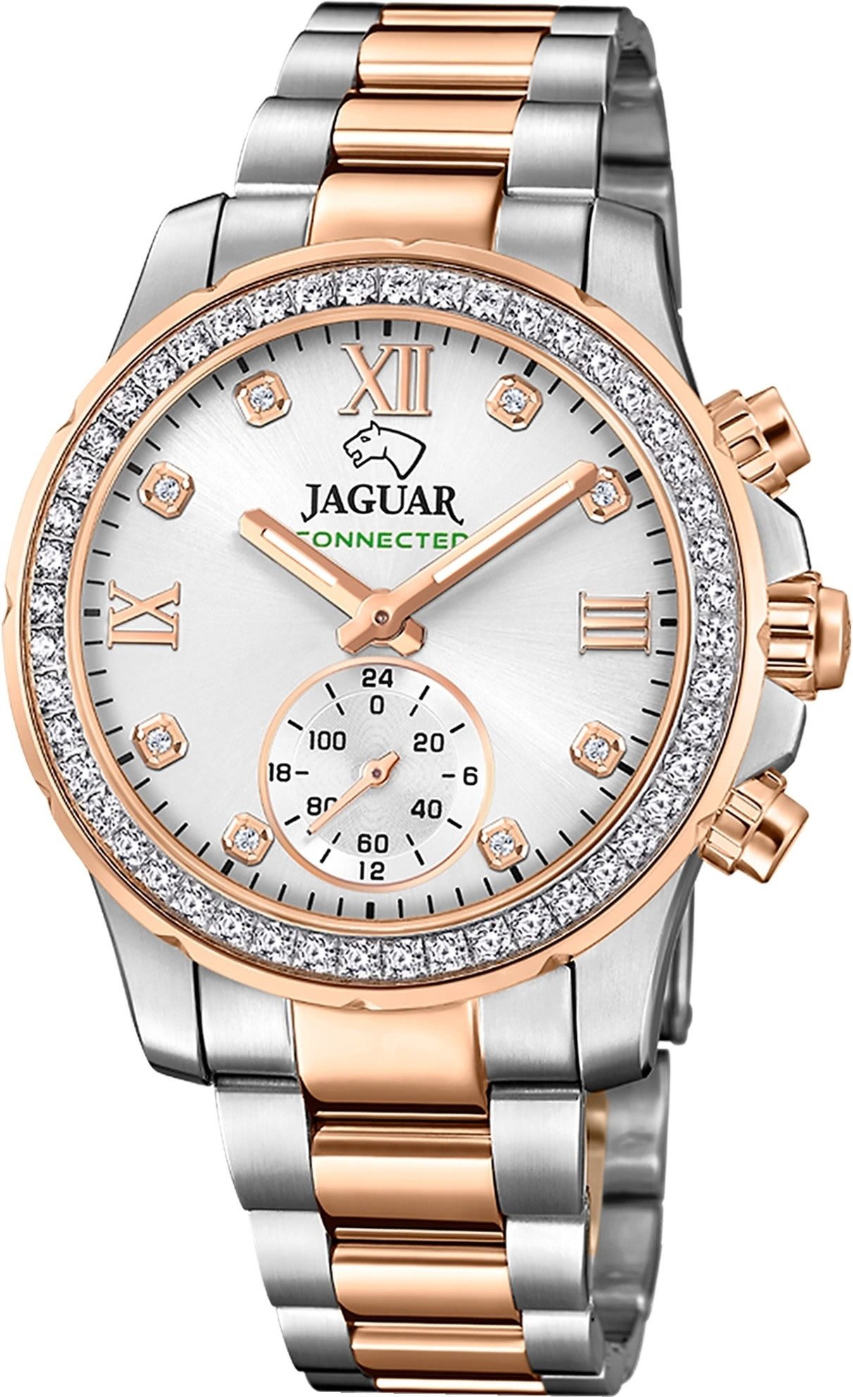 Die Sport Elegant Uhr der Marke Jaguar hat ein schönes Armband aus Edelstahl in silber rosegold mit Klappverschluss. Eine Uhr aus der Jaguar Connected Kollektion für Damen in der Gehäusefarbe silber rosegold mit Hybrid. Die Multifunktionuhr mit Saphirglas hat ein Zifferblatt in der Farbe silber. Die Form der Uhr ist rund und das Gehäuse ist mittel ca. 36,5mm.