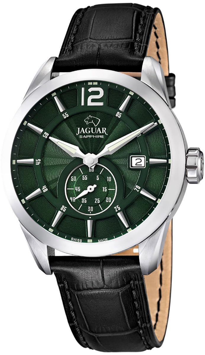 Die Elegant Uhr der Marke Jaguar hat ein schönes Armband aus Leder in schwarz mit Klappverschluss. Eine Uhr aus der Jaguar ACM Kollektion für Herren in der Gehäusefarbe silber mit Quarzwerk. Die Analoguhr mit Saphirglas hat ein Zifferblatt in der Farbe dunkelgrün. Die Form der Uhr ist rund und das Gehäuse ist groß ca. 43mm.
