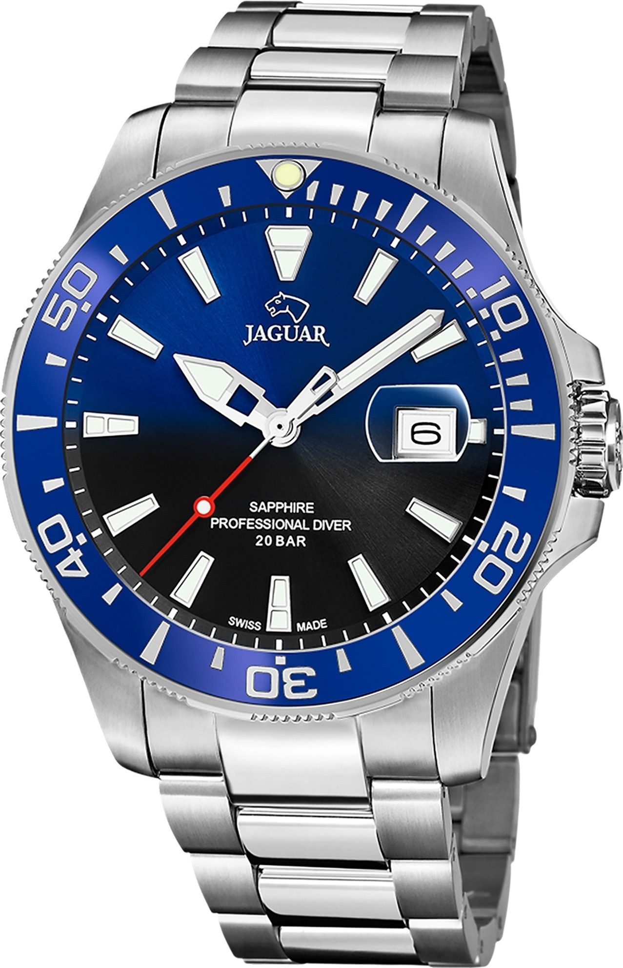 Die Luxus Uhr der Marke Jaguar hat ein schönes Armband aus Edelstahl in silber mit Faltschließe. Eine Uhr aus der Jaguar Pro Diver Kollektion für Herren in der Gehäusefarbe silber mit Quarzwerk. Die Analoguhr mit Saphirglas hat ein Zifferblatt in der Farbe blau schwarz. Die Form der Uhr ist rund und das Gehäuse ist groß ca. 43,5mm.
