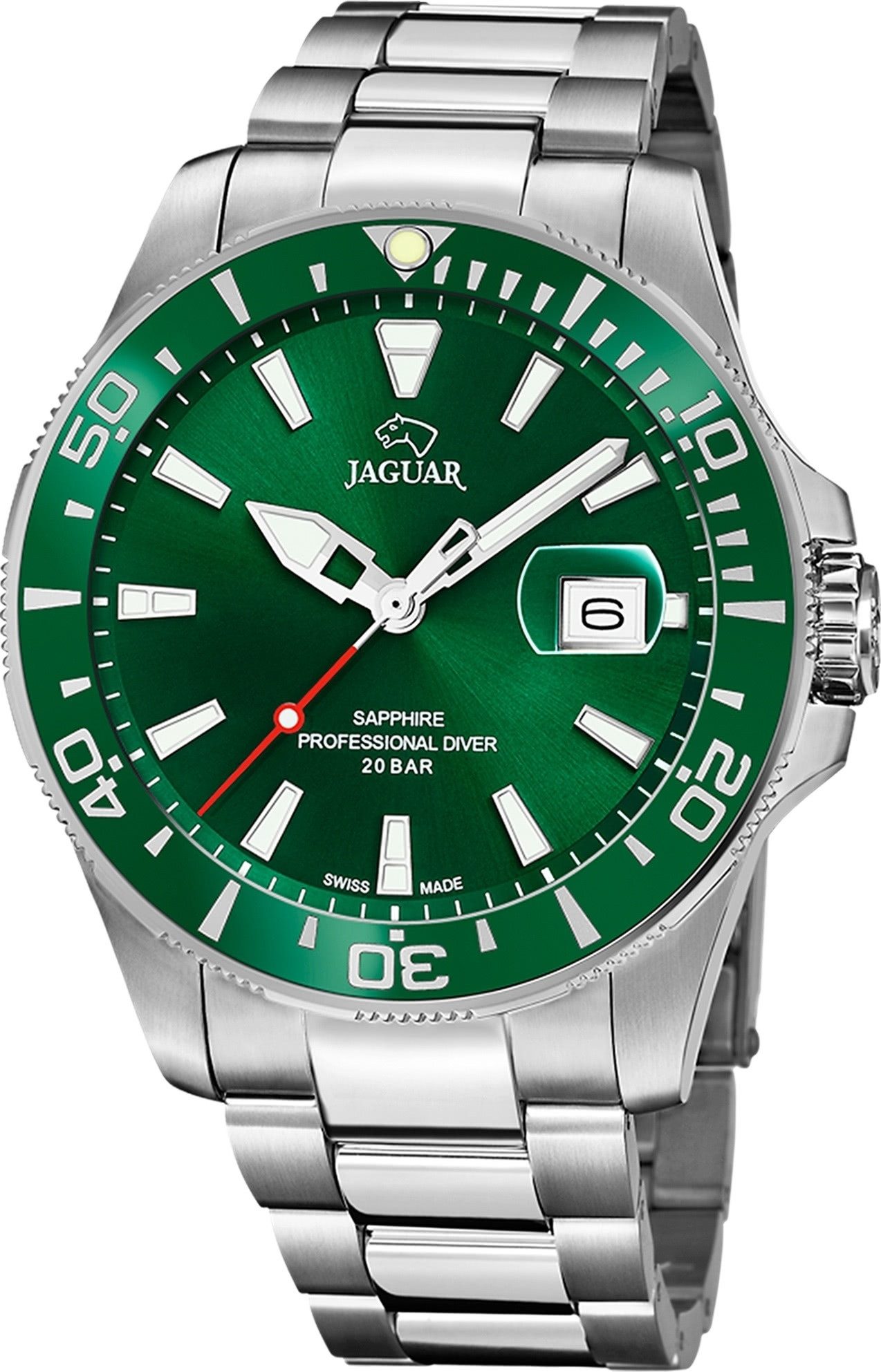 Die Luxus Uhr der Marke Jaguar hat ein schönes Armband aus Edelstahl in silber mit Faltschließe. Eine Uhr aus der Jaguar Pro Diver Kollektion für Herren in der Gehäusefarbe silber mit Quarzwerk. Die Analoguhr mit Saphirglas hat ein Zifferblatt in der Farbe grün. Die Form der Uhr ist rund und das Gehäuse ist groß ca. 43,5mm.