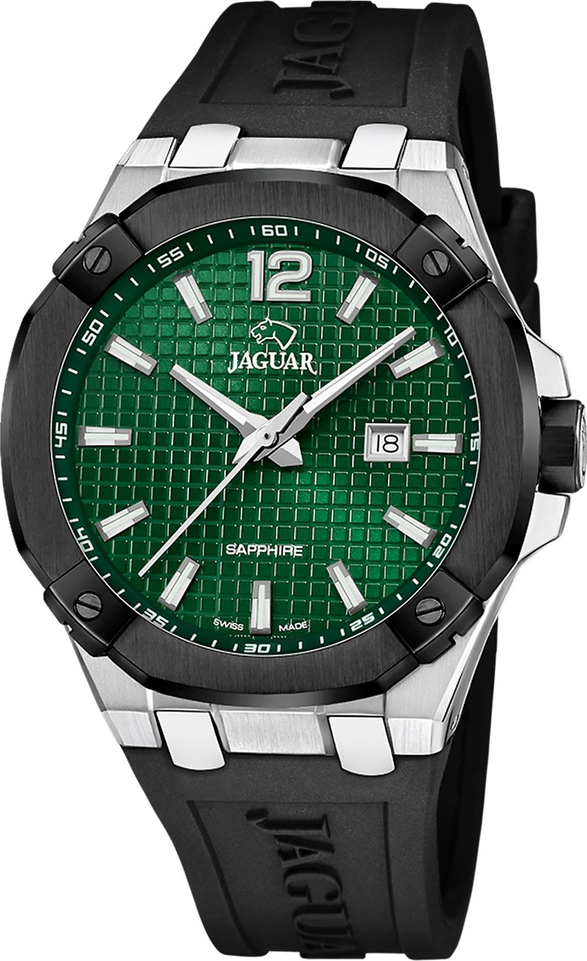 Die Luxus Uhr der Marke Jaguar hat ein schönes Armband aus Silikon in schwarz mit Dornschließe. Eine Uhr aus der Jaguar Diplomatic Kollektion für Herren in der Gehäusefarbe silber mit . Die Analoguhr mit Saphirglas hat ein Zifferblatt in der Farbe grün. Die Form der Uhr ist rund und das Gehäuse ist groß ca. 44mm.