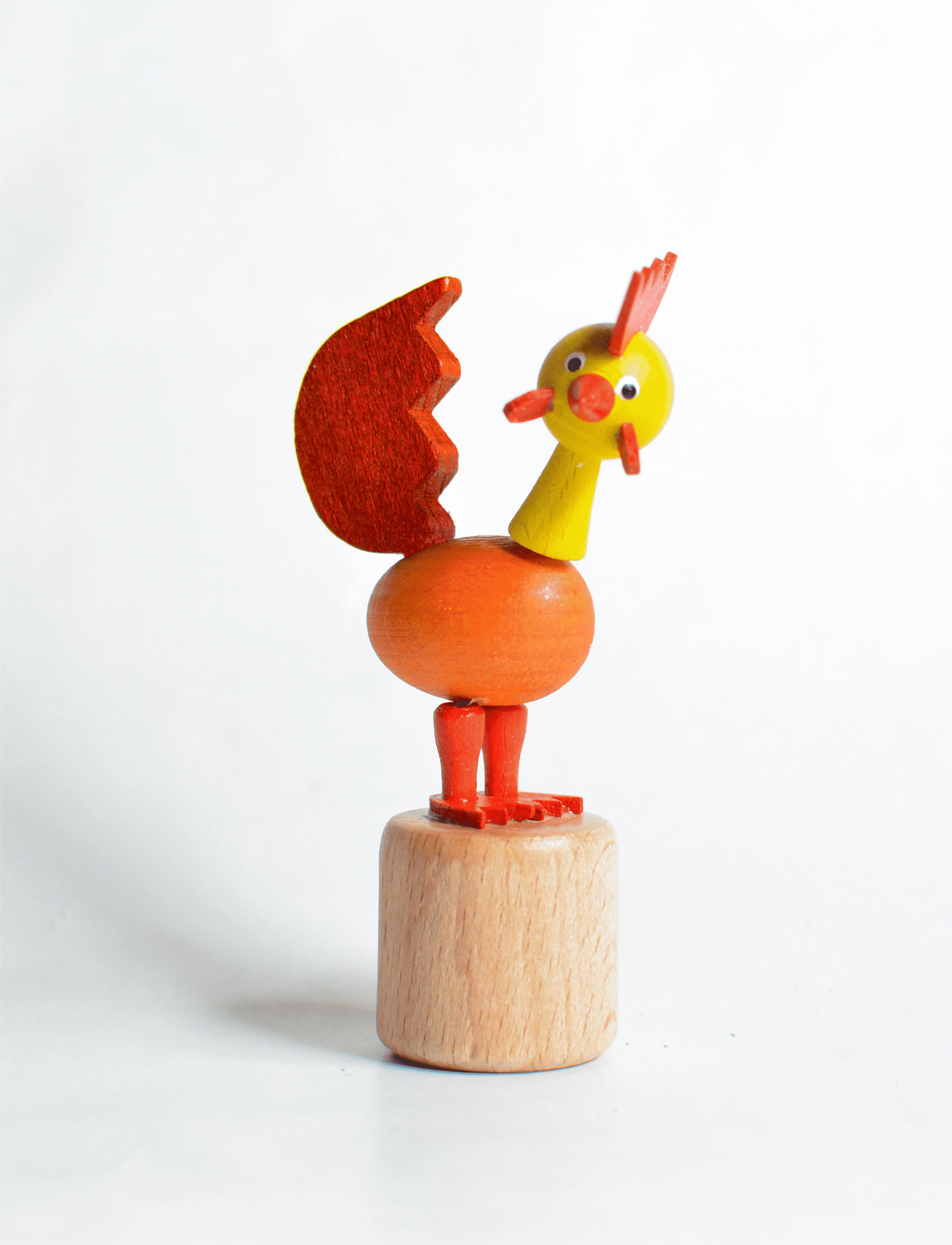 Holzspielzeug Wackelfigur Hahn rot Diese schöne Wackelfigur ist beliebt bei Alt und Jung. Die Kinder freuen sich über ein neues Spielzeug, bei den Älteren weckt es bestimmt Kindheitserinnerungen. Das Huhn kommt in vielen Geschichten und Märchen vor und ist gelb/ orange mit rotem Schwanz gestaltet. Wenn man den Boden nach innen drückt entspannt sich die Feder im Inneren und die Figur knickt nach vorn und Spaß kann beginnen. Всіs ist komplett aus Holz gefertigt, bunt gestaltet und wird in verschiedenen Arbeitsschritten komplett in Seiffen in einem Familienbetrieb mit langer Tradition gefertigt Höhe=8cm NEU |