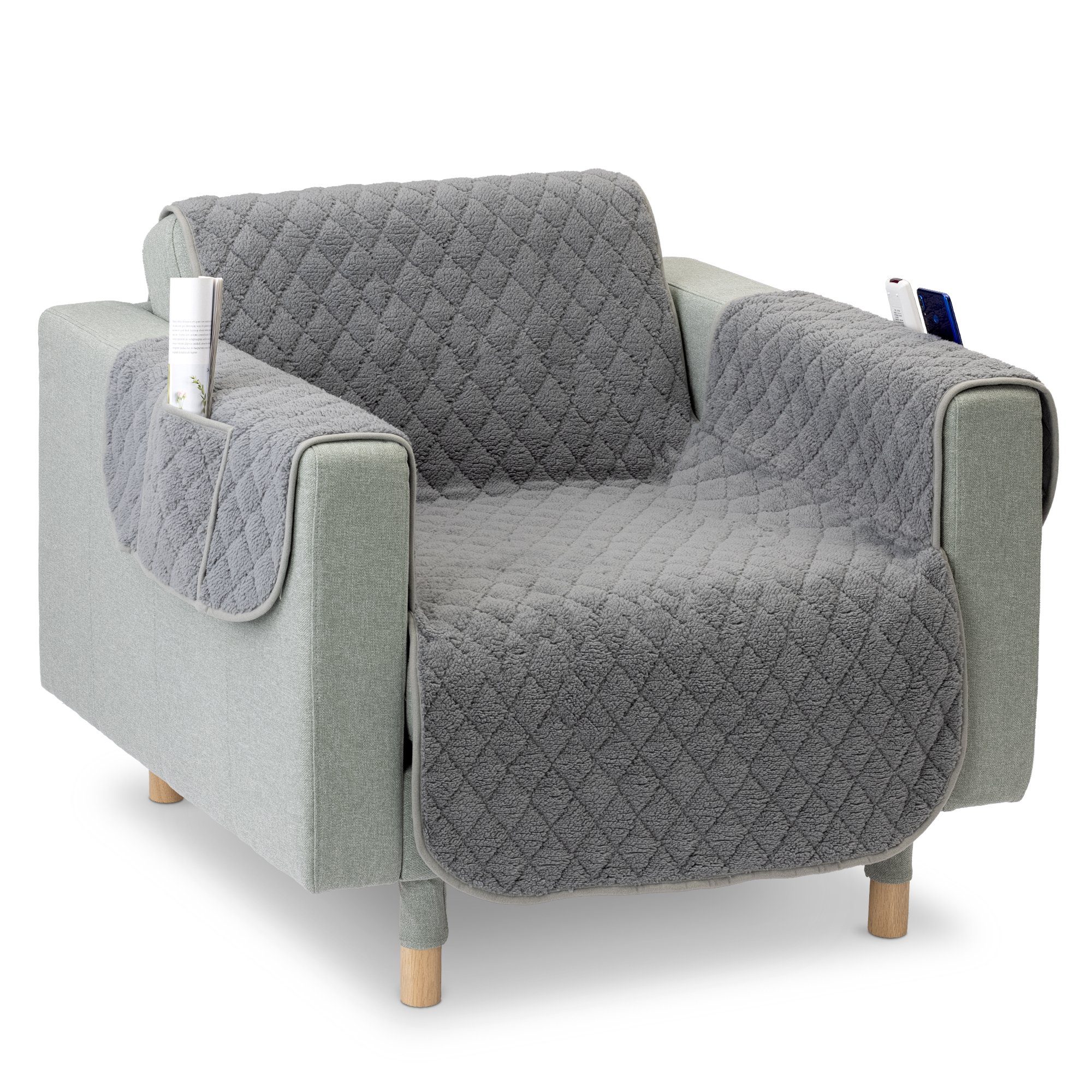 MIT TASCHEN: Die gemütliche Sessel Abdeckung kommt mit 3 Taschen in denen Du bspw. Deine Brille, die Zeitung, Magazine oder auch die Fernbedienung griffbereit aufbewahren kannst.