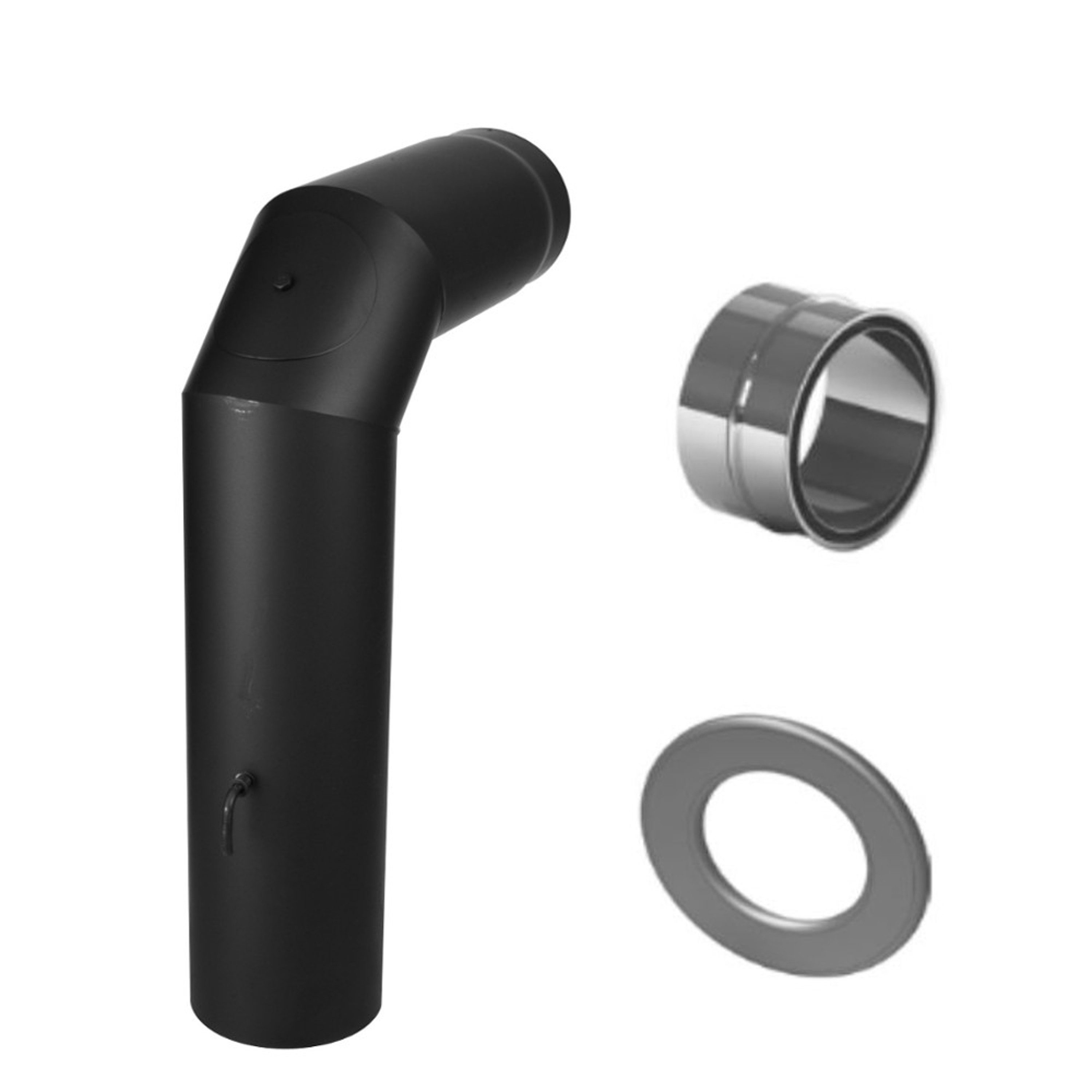 Jeremias Ofenrohr/Winkelrohr Set Ferro-Lux für Anschluss oben Winkelrohr Set Ferro-Lux vom Hersteller Jeremias ist zum Anschluss eines Kaminofens an einen Schornstein. Verbindungsleitung aus Stahlblech DC01 (ST12) mit eingezogener Steckverbindung, für den Einsatzbereich im Wohn- und Sichtbereich für den Anschluss an Kaminöfen. Material: Stahlblech Wandstärke: 2,00mm Schweißnaht: WIG ohne Zusatz Oberfläche: mit hitzefestem Senothermlack beschichtet Mittlere Rauhigkeit:1 mm  Winkelrohr SET Ferro-Lux besteht aus: Winkelrohr (Schenkellänge 450/700 mm) mit Tür Drosselklappe Wandrosette und Wandfutter