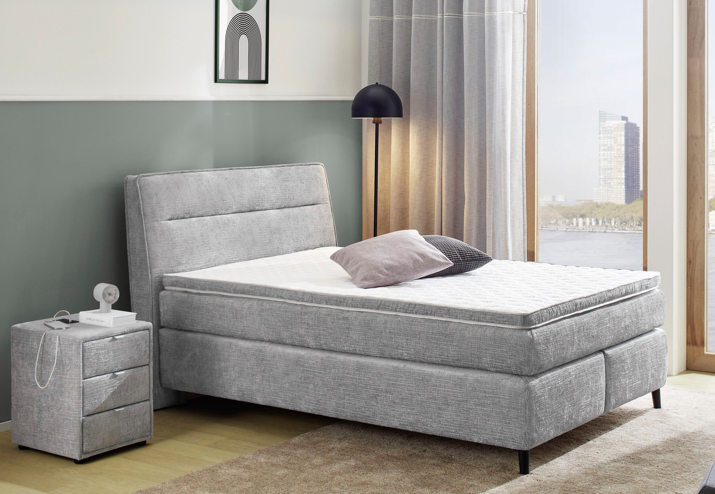 Wissenswertes | Harmonisch stilvolles Boxspringbett wird durch einen eleganten und interessanten Doppelkeder am Kopfteil verziert. Neben diesem optischen Hingucker kommt auch der Liegekomfort nicht zu kurz und wurde bewusst äußerst komfortabel gewählt. Auf einer Box mit Bonell-Federkernpolsterung, die als Unterfederung dient, liegt eine hochwertige 7-Zonen-Tonnentaschen-Federkernmatratze. Den Abschluss eines wunderbaren Schlaferlebnisses bildet der neue Dreamline-Kaltschaum-Topper, der sich optisch, ebenfalls wie das Kopfteil, durch einen ansehnlichen Keder auszeichnet. Die schwarzen Metallfüße runden das moderne Design ab. |