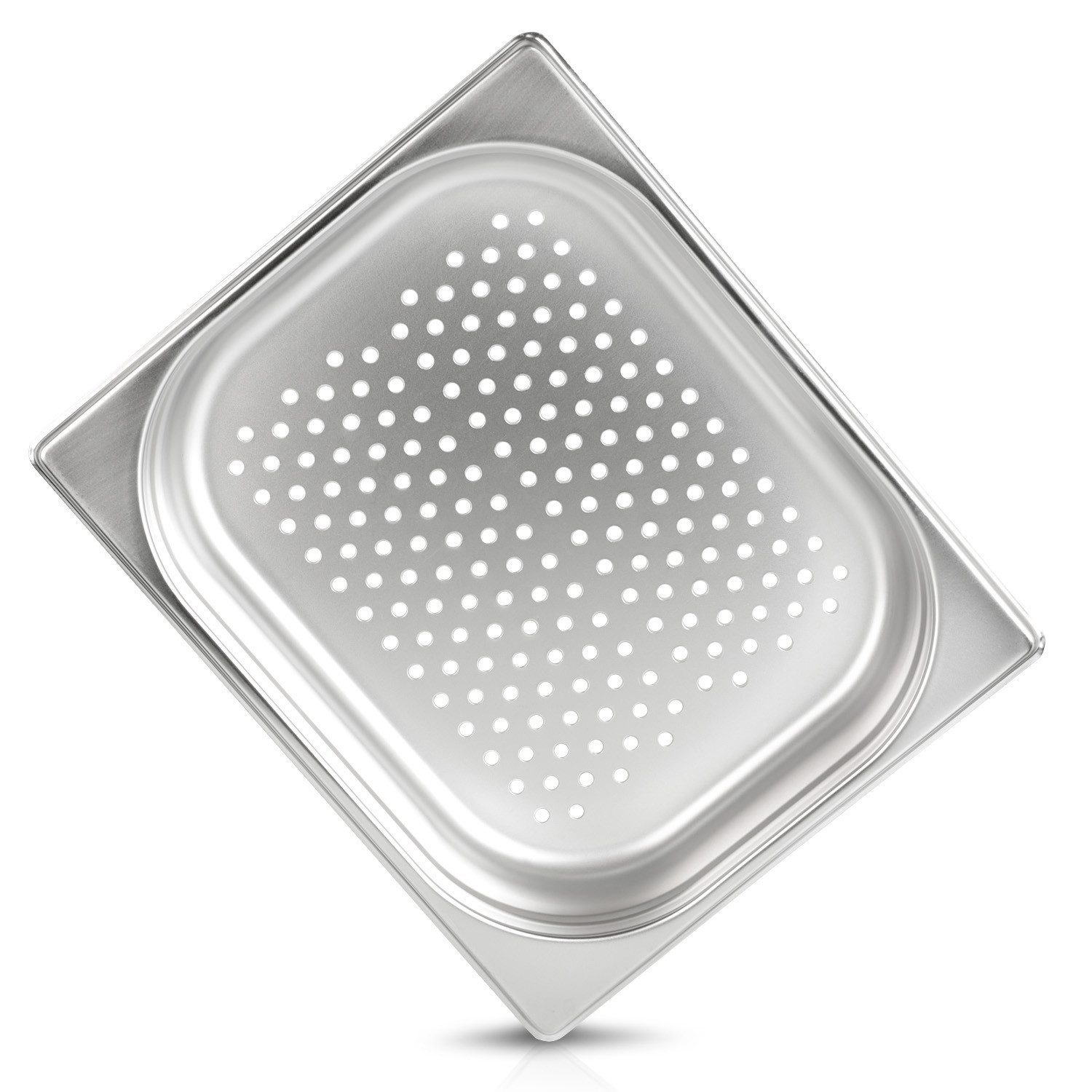 Lieferumfang | 1 Stück jokobela 1/2 40 mm Gastronorm-Behälter aus Premium rostfreiem Edelstahl mit Löchern (Spülmaschinenfest) / 1 Piece Stainless Steel 1/2 Gastronorm Pan 40 mm with Perforations (Dishwasher Safe) |