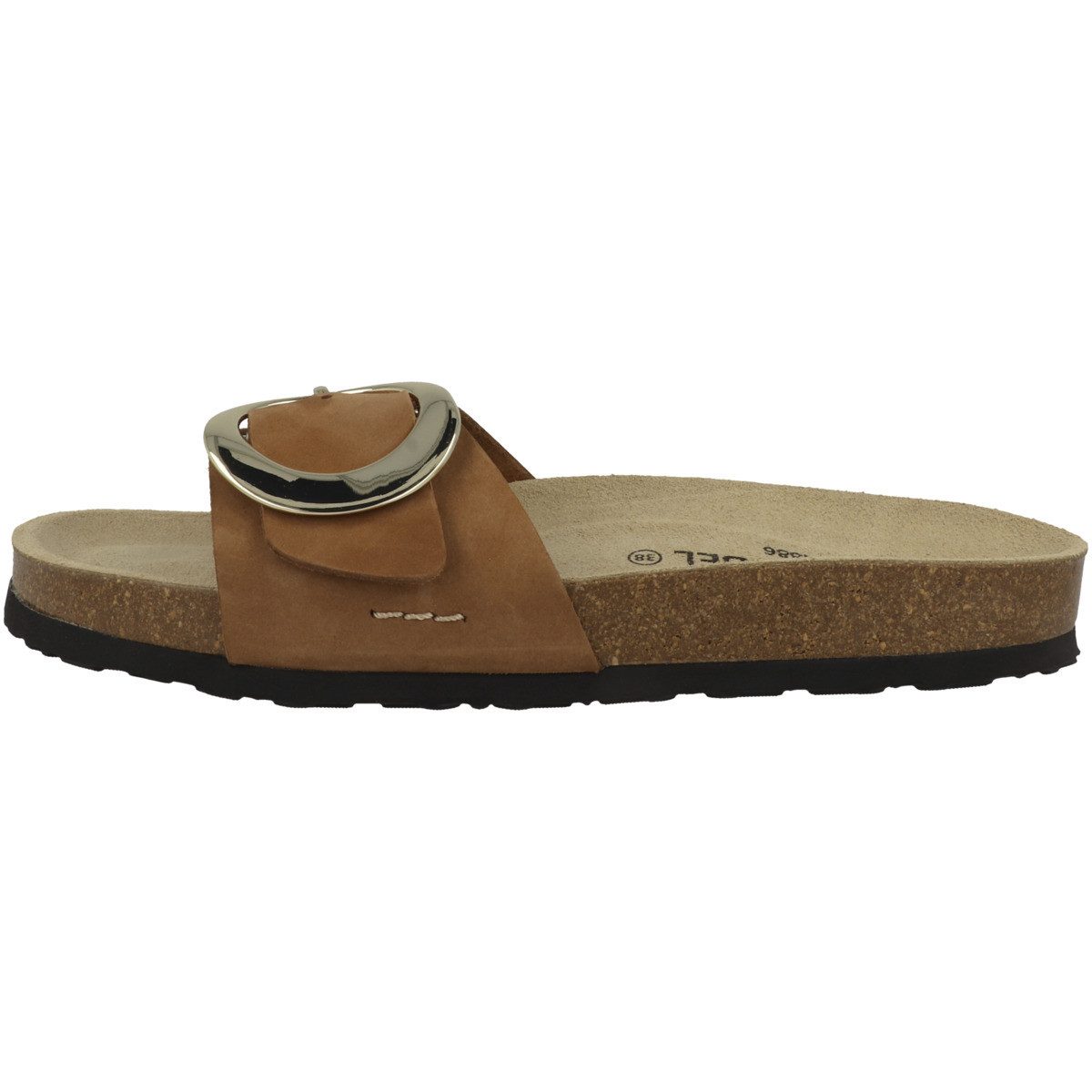 Mit dem Obermaterial aus Leder sind die Schuhe sehr langlebig und atmungsaktiv. Die EVA-Sohle der Pantoletten ist leicht profiliert und sorgt für mehr Rutschfestigkeit auf unebenem Untergrund. Damit das Softfußbett für ein angenehmes Trage- und Laufgefühl sorgt, ist die Schaumeinlage gepolstert und anatomisch vorgeformt. Dank dem Plateauabsatz wird mehr Stabilität und Balance gewährleistet. Diese Pantoletten in Weite F sind für schmale bis normale Füße geeignet.