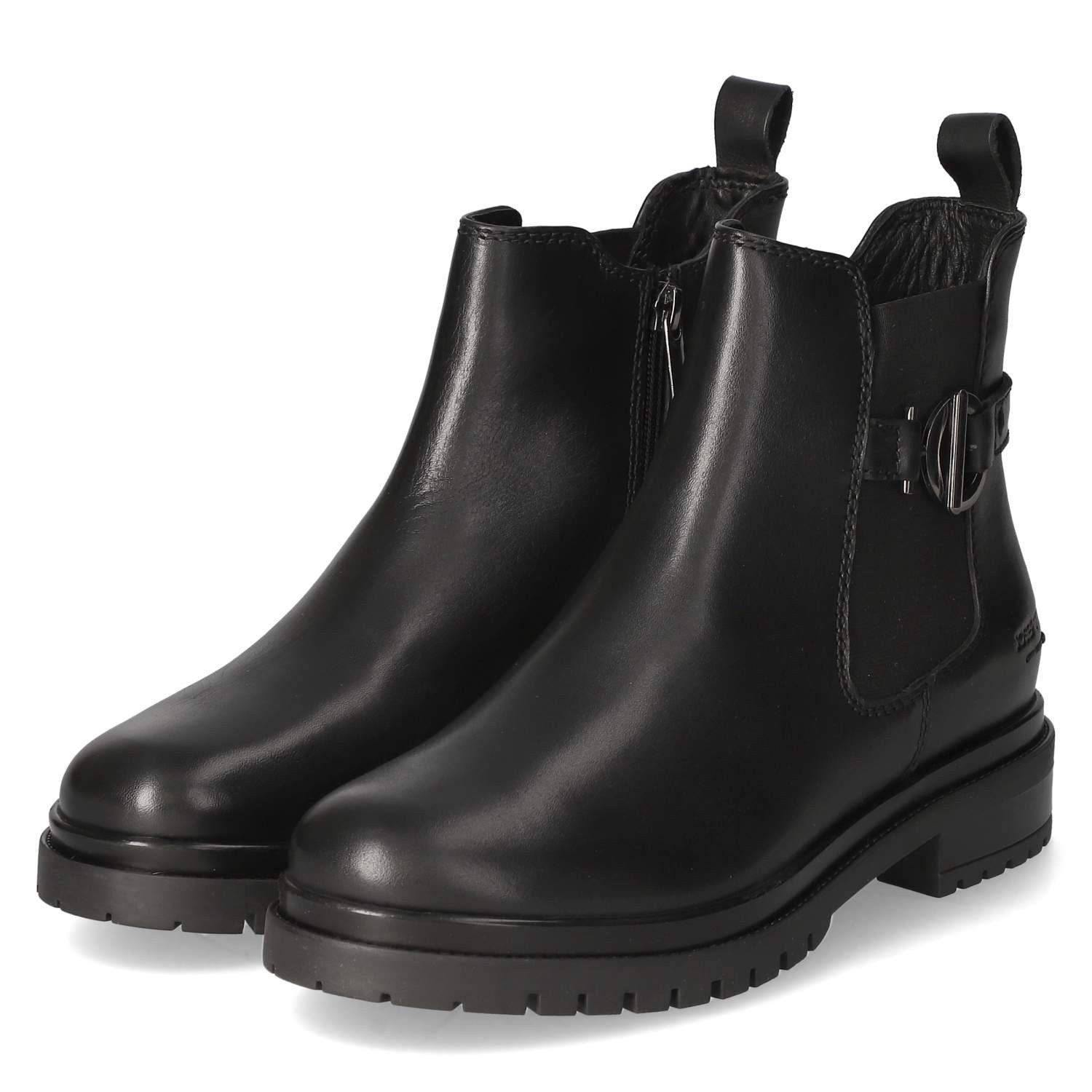 Das schwarze Glattleder verleiht den Boots eine hochwertige und zeitlose Optik, die sich vielseitig kombinieren lässt. Der seitliche Elastikeinsatz und der praktische Reißverschluss ermöglichen ein einfaches An- und Ausziehen und sorgen für eine flexible, komfortable Passform. Ein stilvoller Zierriemen mit einer titanfarbenen Schnalle verleiht dem Schuh eine besondere Note und unterstreicht das moderne Design.