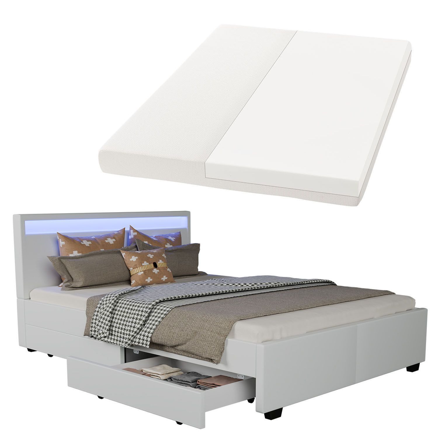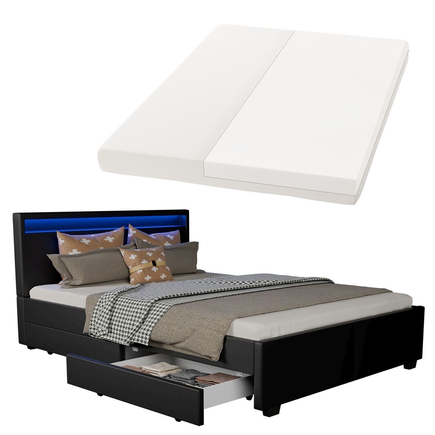 Eine im Kopfteil eingelassene LED-Leiste sorgt für eine stimmungsvolle Atmosphäre im Schlafzimmer. Es stehen Ihnen 16 verschiedene Farbeinstellungen zur Verfügung, die Sie bequem per Fernbedienung kontrollieren. Dank der indirekten Beleuchtung können Sie selbst auf eine Nachttischlampe verzichten.