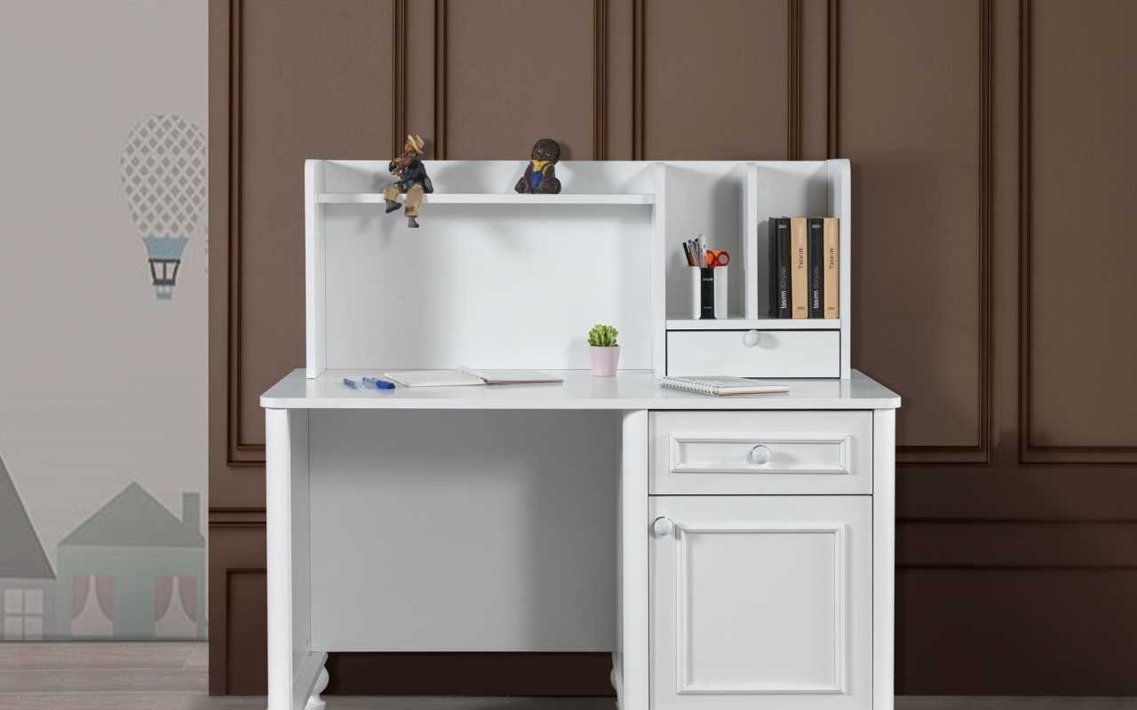 Entdecken Sie den exklusiven weißen Schreibtisch für das Kinderzimmer – das perfekte Möbelstück, das Funktionalität mit modernem Design vereint. Hergestellt in Europa, garantieren wir höchste Qualität und liebevolle Verarbeitung. Der Schreibtisch misst 116 cm in der Breite, 62 cm in der Tiefe und beeindruckt mit einer Höhe von 122 cm, ideal für kreative Köpfe jeden Alters. Mit zwei praktischen Schubladen und einem geräumigen Einlegeboden bieten Sie Ihrem Kind ausreichend Stauraum für Bücher, Stifte und weitere Utensilien. Die stabilen Holzfüße sorgen für einen sicheren Stand und machen den Schreibtisch zu einem langlebigen Begleiter. Die schlichte, rechteckige Form und die neutrale weiße Farbe passen in jedes moderne Kinderzimmer und fördern eine inspirierende Lernumgebung. Setzen Sie auf ästhetische Funktionalität und gewähren Sie Ihrem Kind einen Arbeitsplatz, der Kreativität und Konzentration fördert. Holen Sie sich jetzt diesen stilvollen Schreibtisch und verwandeln Sie das Kinderzimmer in eine kreative Oase!