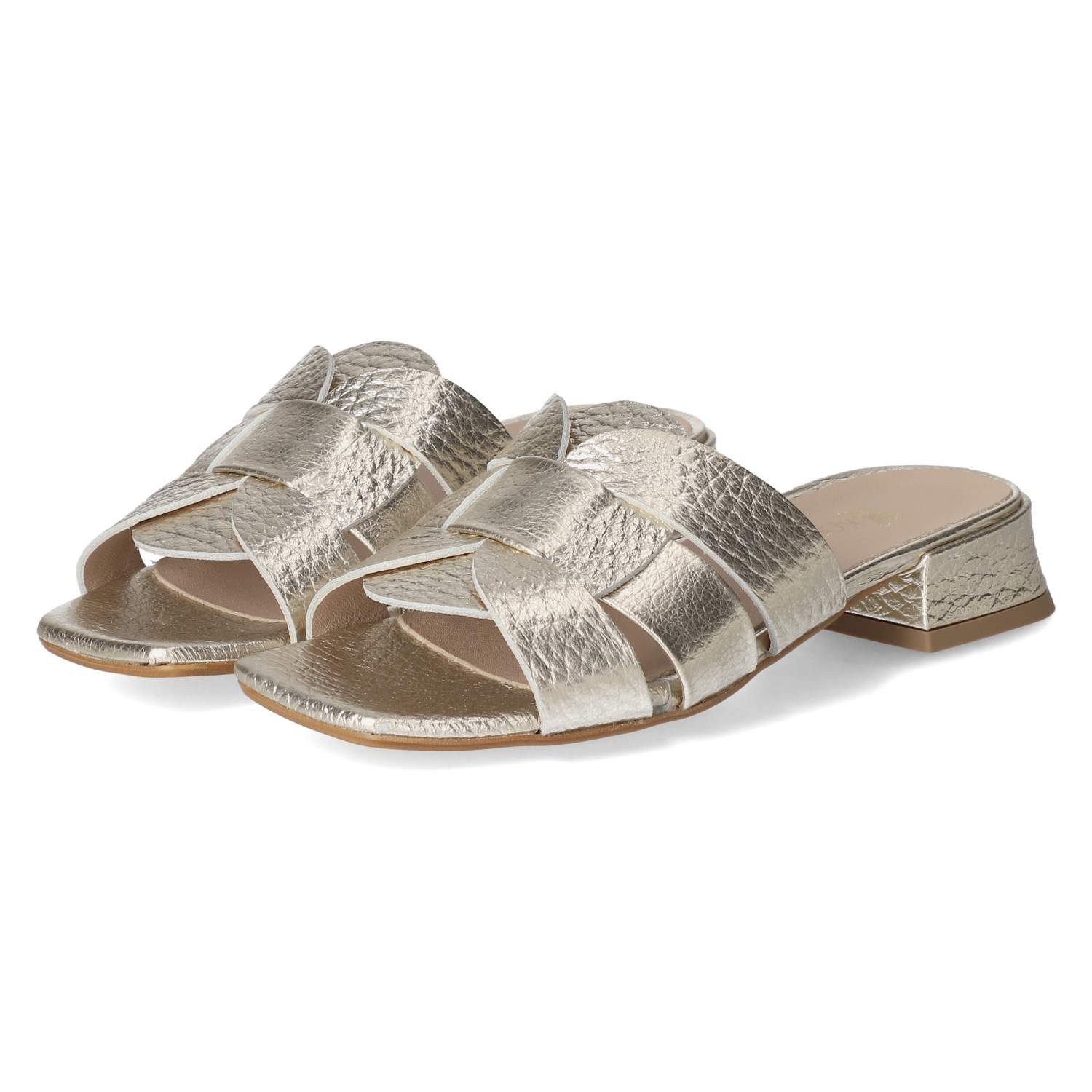 Die Kaerlek Damen Pantoletten in Gold aus edlem Glattleder überzeugen mit ihrem stilvollen Design und hohem Tragekomfort. Ein geflochtenes Zierelement mit drei Zierriemen verleiht den Schuhen eine elegante und moderne Optik. Das weiche Innenmaterial aus Leder sorgt für ein angenehmes Tragegefühl, während das gepolsterte Lederfußbett zusätzlichen Komfort bietet. Die flexible, rutschhemmende Laufsohle gewährleistet Stabilität und sicheren Halt auf verschiedenen Untergründen. Diese Pantoletten sind die ideale Wahl für sommerliche Outfits und lassen sich perfekt mit Kleidern, Röcken oder Hosen kombinieren. Ob für den Alltag oder besondere Anlässe – mit diesen Schuhen setzen Sie stilvolle Akzente.