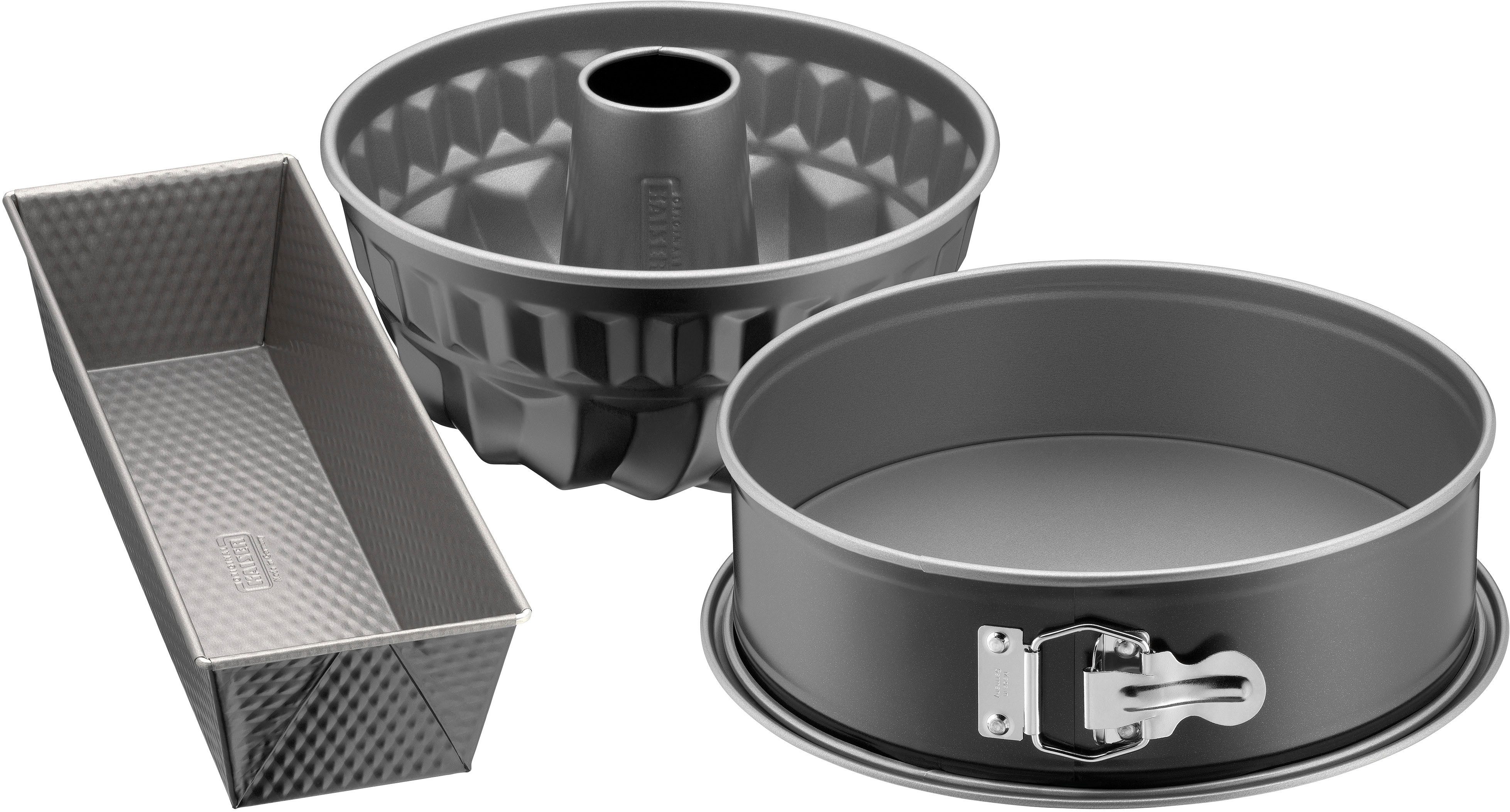 Lieferumfang | Kaiser Inspiration Backformen-Set bestehend aus 1x Springform mit Flachboden (Ø 26 cm, Füllmenge 1,45 l), 1x Königskuchenform (30 cm, Höhe 6 cm), 1x Bundform / Gugelhupf Backform (Ø 22 cm) |