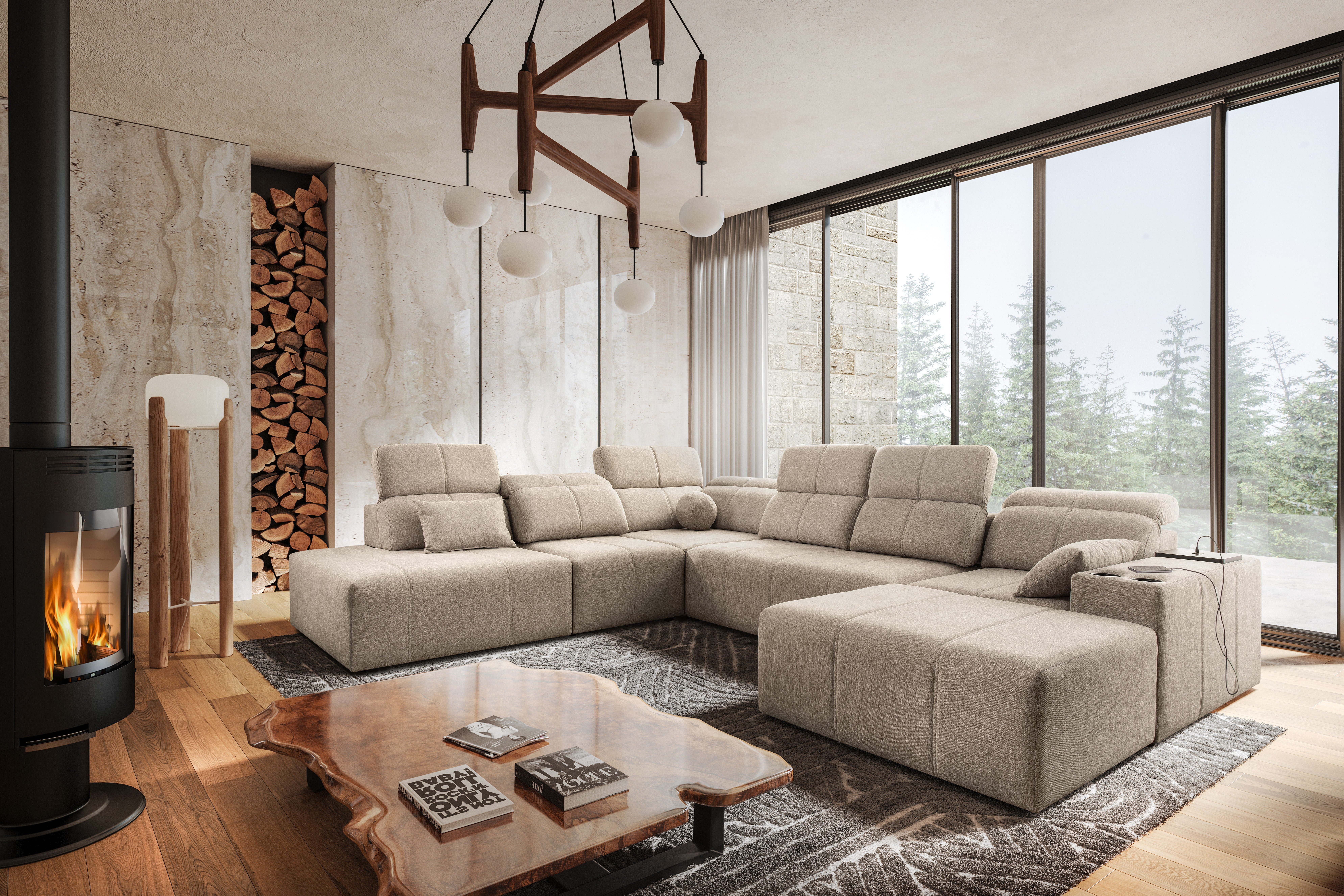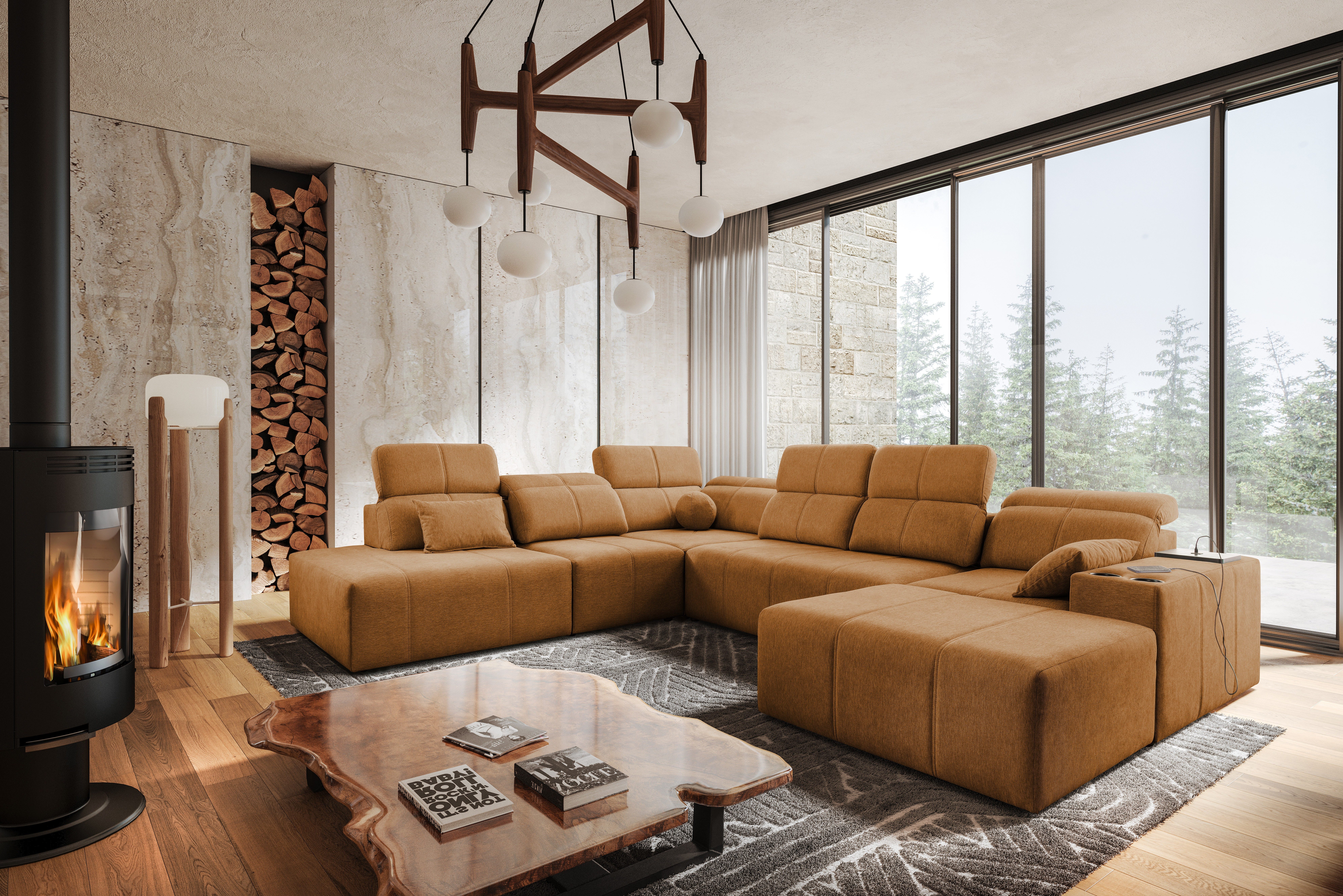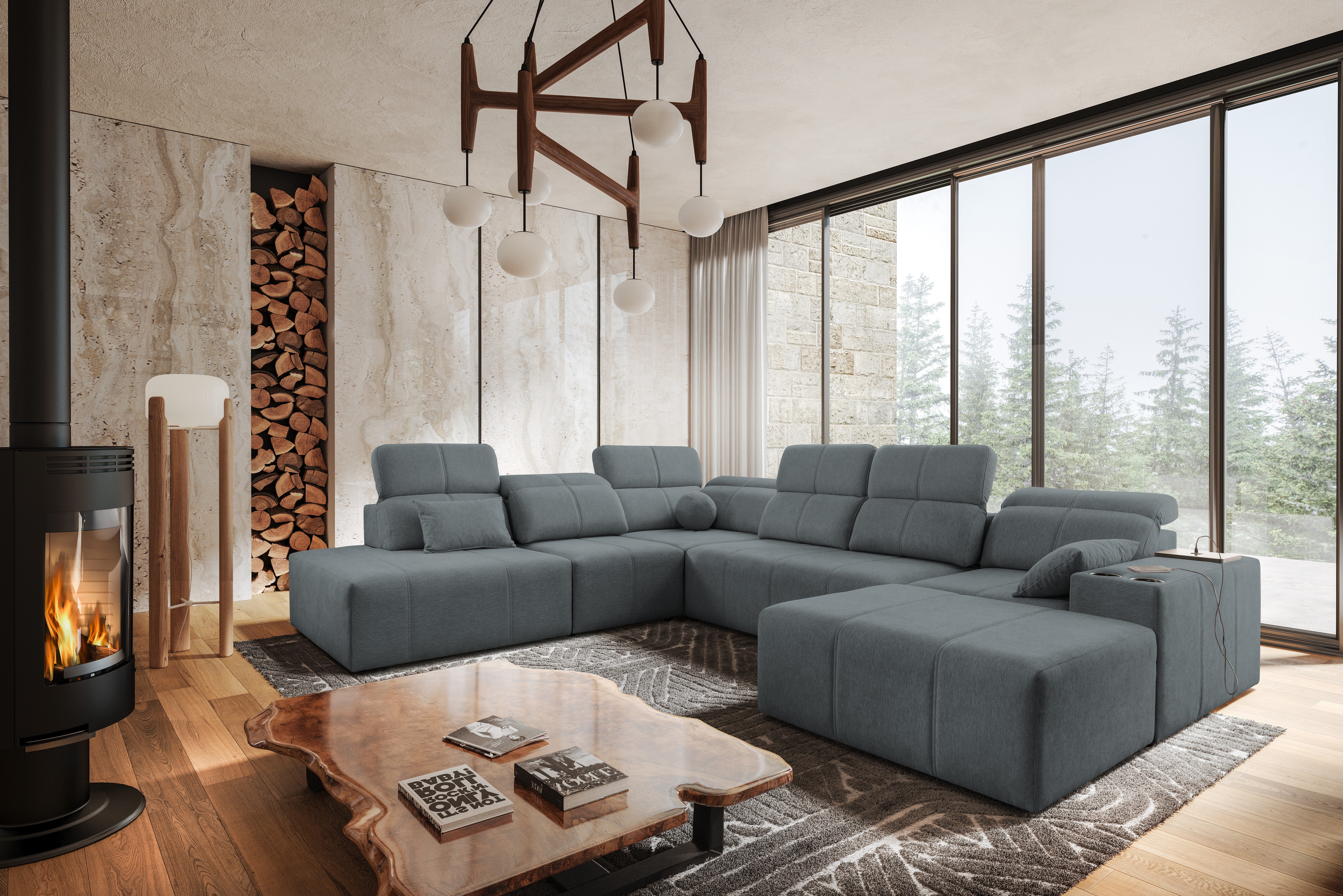 Das Ecksofa Mindy X ist ein äußerst funktionelles Ecksofa mit Bar-, USB- und Schlaffunktion und tollem Design. Dieses geräumige Ecksofa bietet viel Platz für komfortable Erholung und Entspannung mit der Familie oder geladenen Gästen. Ein großer Vorteil dieses Modells sind die verstellbaren Kopfstützen und die Konstruktion des Modells auf gewellten Federn und HR35-Schaumstoff - diese Art von Schaumstoff ist sehr bequem, und seine hohe Elastizität bedeutet, dass der Schwamm schnell in seine ursprüngliche Form zurückkehrt. Dank der Möglichkeit des Ausklappens können wir das Ecksofa sowohl tagsüber als auch nachts genießen, und die zusätzlichen bis zu drei Bettkästen ermöglichen es uns, Kissen, Decken oder viele andere Dinge, die unser Wohnzimmer ordentlich halten, einfach zu verstauen. Unter den zusätzlichen Annehmlichkeiten finden wir Dinge wie Tassen oder eine USB-Buchse, die es uns ermöglichen, unser Telefon oder unseren Laptop schnell aufzuladen, während wir uns entspannen oder unseren Lieblingsfilm oder unsere Lieblingsserie ansehen.