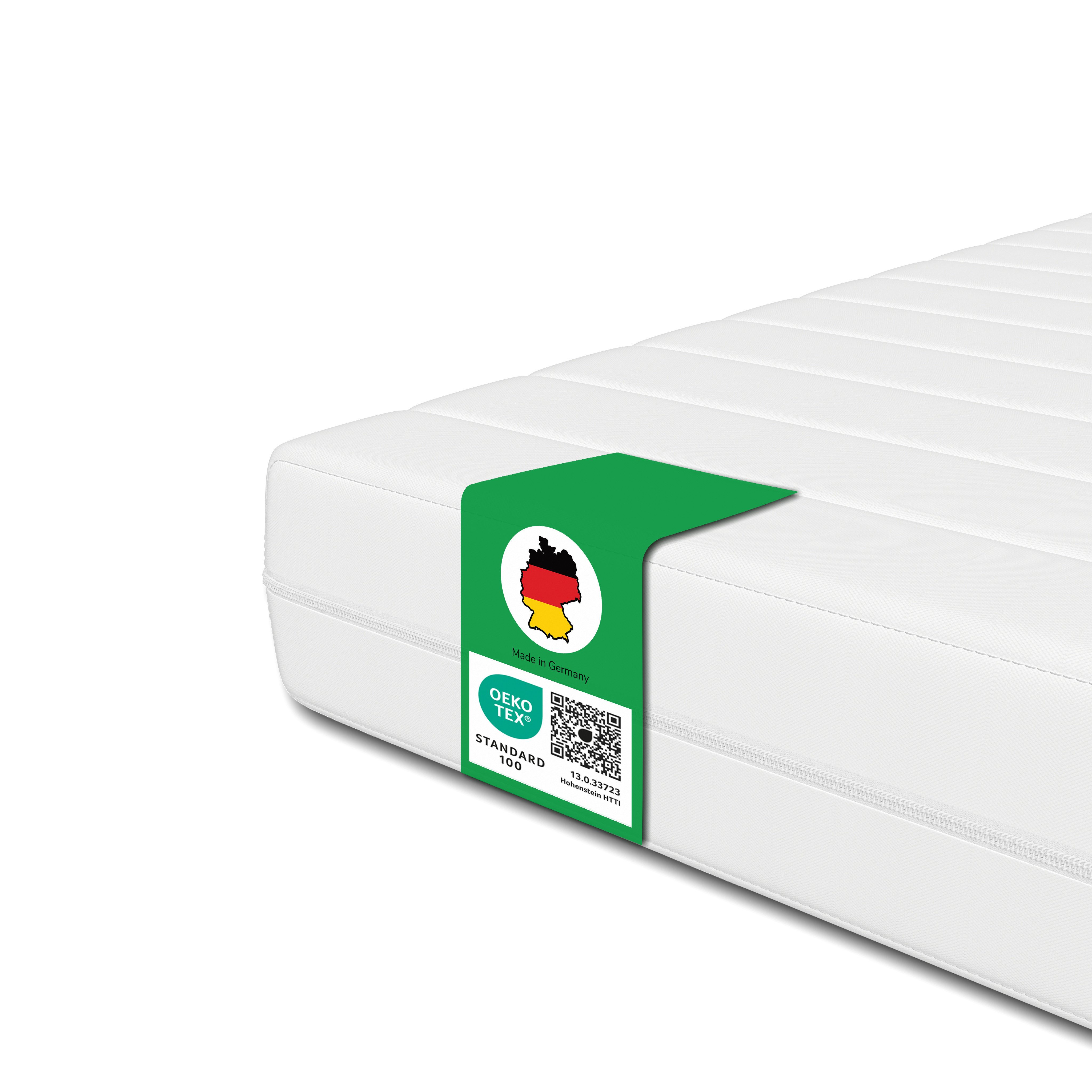 Qualität und Sicherheit aus DeutschlandDiese Kaltschaummatratze ist Made in Germany und trägt das OEKO-TEX® STANDARD 100 13.0.33723 Hohenstein HTTI Zertifikat. Die allergikerfreundliche Rollmatratze wird nachhaltig vakuumverpackt geliefert und erreicht schnell ihre volle Größe. Überzeuge dich selbst von maximalem Komfort!