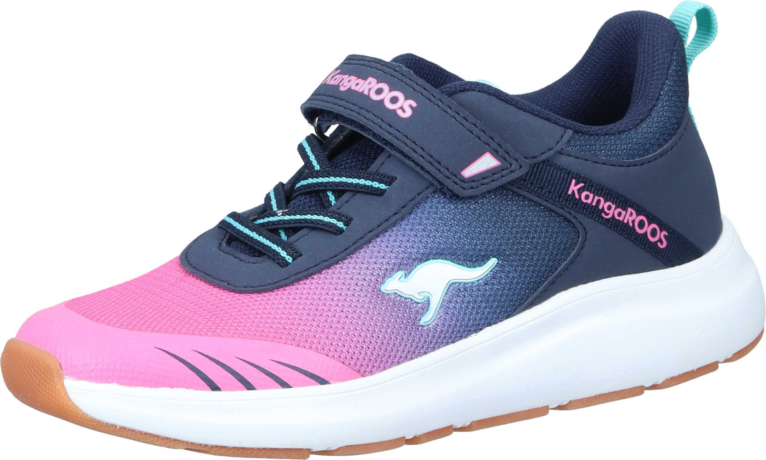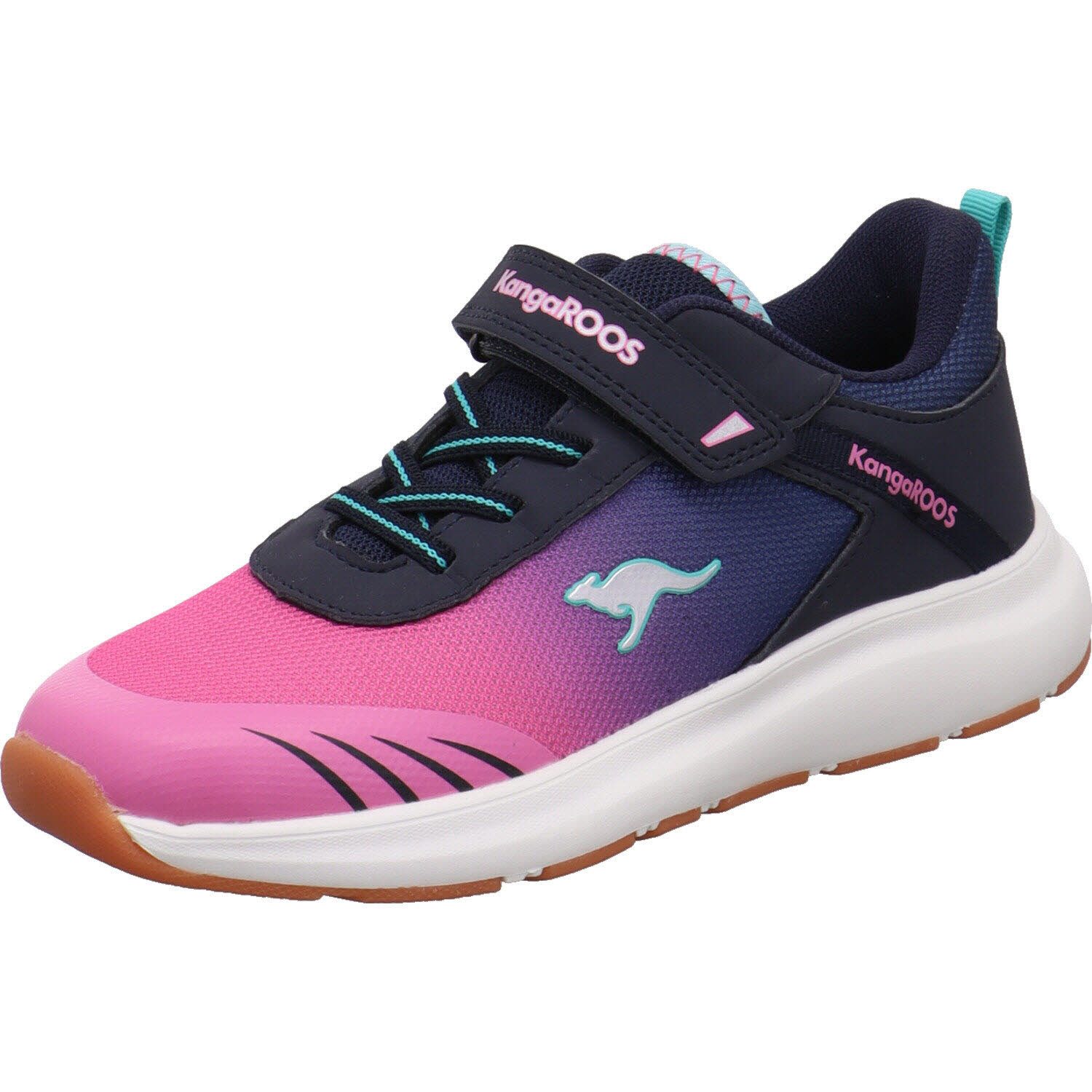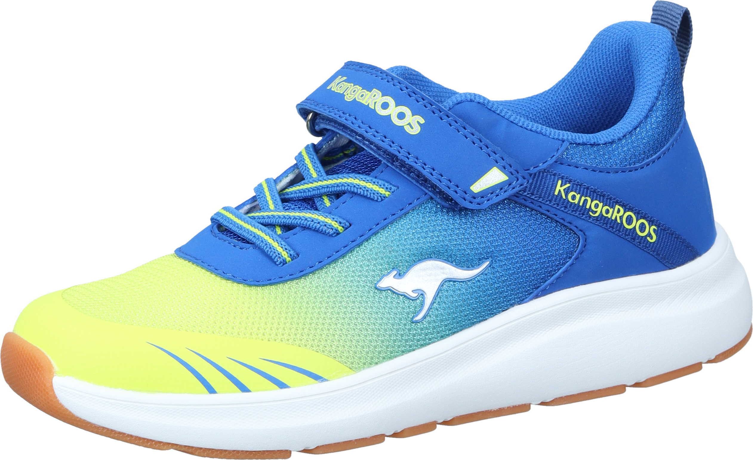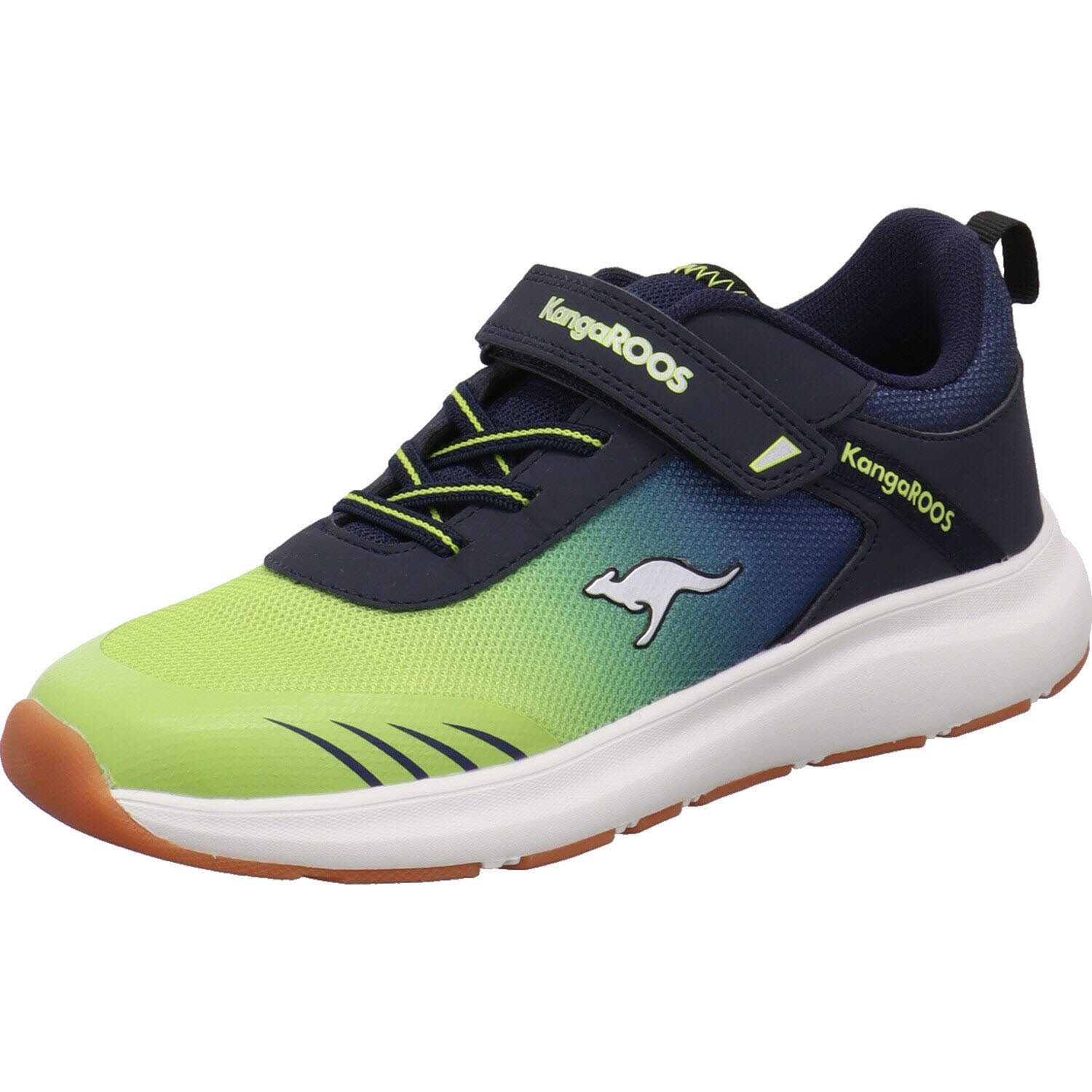 Der Kinder Hallensportschuh KB-Rida EV ist ein Highlight aus der neuen Kollektion von Kangoroos. Er wurde aus flexiblen Textil in Blau mit Neon Grün gefertigt und ist an der Schuhspitze und Ferse mit Einsätzen aus Synthetik versehen, diese machen ihn robust. Durch den Klettverschluss, die Gummischnürung und der Lasche am Schaft, ist der Einstieg kinderleicht. Der Schaft ist dabei angenehm weich gepolstert und die Innensohle ist mit der Roos Fit Kennzeichnung versehen. Damit kannst du die optimale Розмір für dein Kind ermitteln. Die Sohle ist als Wechselfußbett gearbeitet, damit der Schuh optimal gelüftet werden kann. Die non marking Laufsohle ist rutschhemmend und so optimal für den Schulsport oder Sport im Verein, in der Halle. Die coole Farbgebung wird Mädchen und Jungen gefallen.