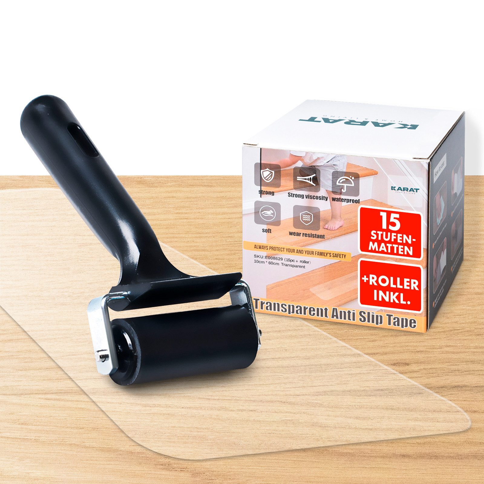 Das transparente Design fügt sich unauffällig in jede Umgebung ein und lässt Ihre Treppen in ihrer natürlichen Schönheit erstrahlen. Das Selbstklebeband auf der Rückseite der Streifen garantiert eine schnelle und einfache Montage ohne zusätzliches Werkzeug. Zum Set gehört auch ein praktischer Montageroller, der Ihnen hilft, die Streifen mühelos und blasenfrei anzubringen.
