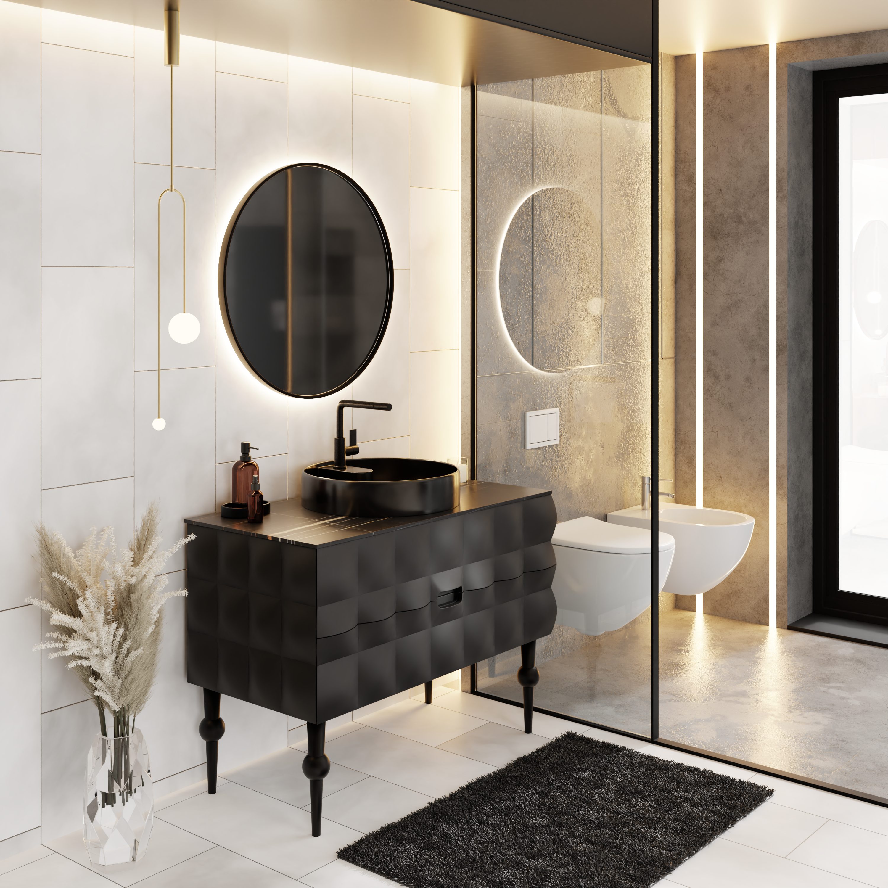 Das Herzstück eines jeden Badezimmer Set Möbel ist die Spüle. Bei dem Waschtisch mit Unterschrank 100 cm und Spiegel „Onyx“ liegt ein rundes Aufsatzwaschbecken mit unverwechselbarem Design vor, das passgenau für die Konsole des Waschbeckenunterschranks gebaut wurde. Ein solches Handwaschbecken in Kombination mit den außergewöhnlichen Badschränken verleiht den Badezimmern einen einzigartigen Charme.