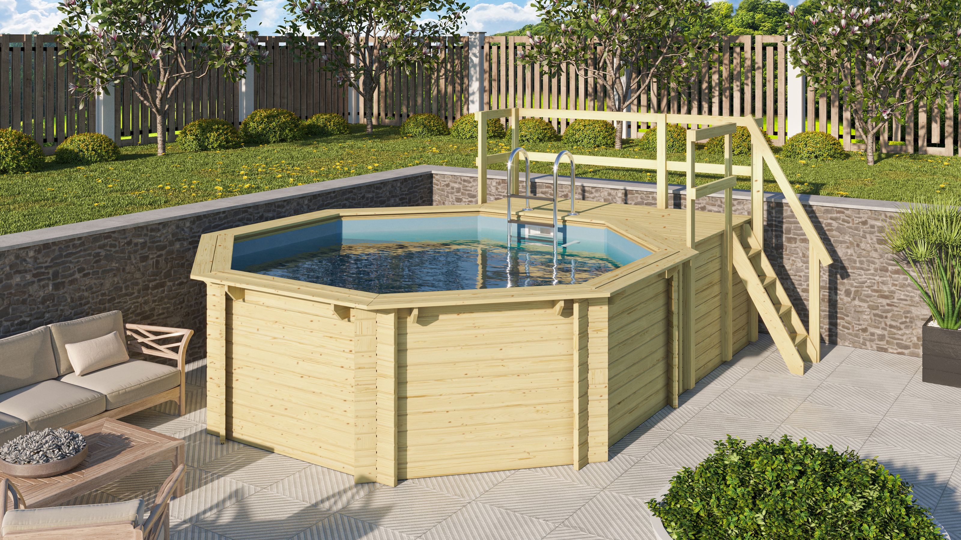 Was gibt es schöneres, als an einem heißen Sommertag eine Abkühlung im eigenen Pool zu holen? Anschließend entspannt auf der anliegenden Terrasse auf einem Liegestuhl einen Cocktail schlürfen und sich die Sonne auf dem Bauch scheinen lassen. Für die meisten klingt das nach einem perfekten Sommertag im eigenen Garten. Mit unserem Achteckpool Modell 1 können Ihre Träume Wirklichkeit werden.