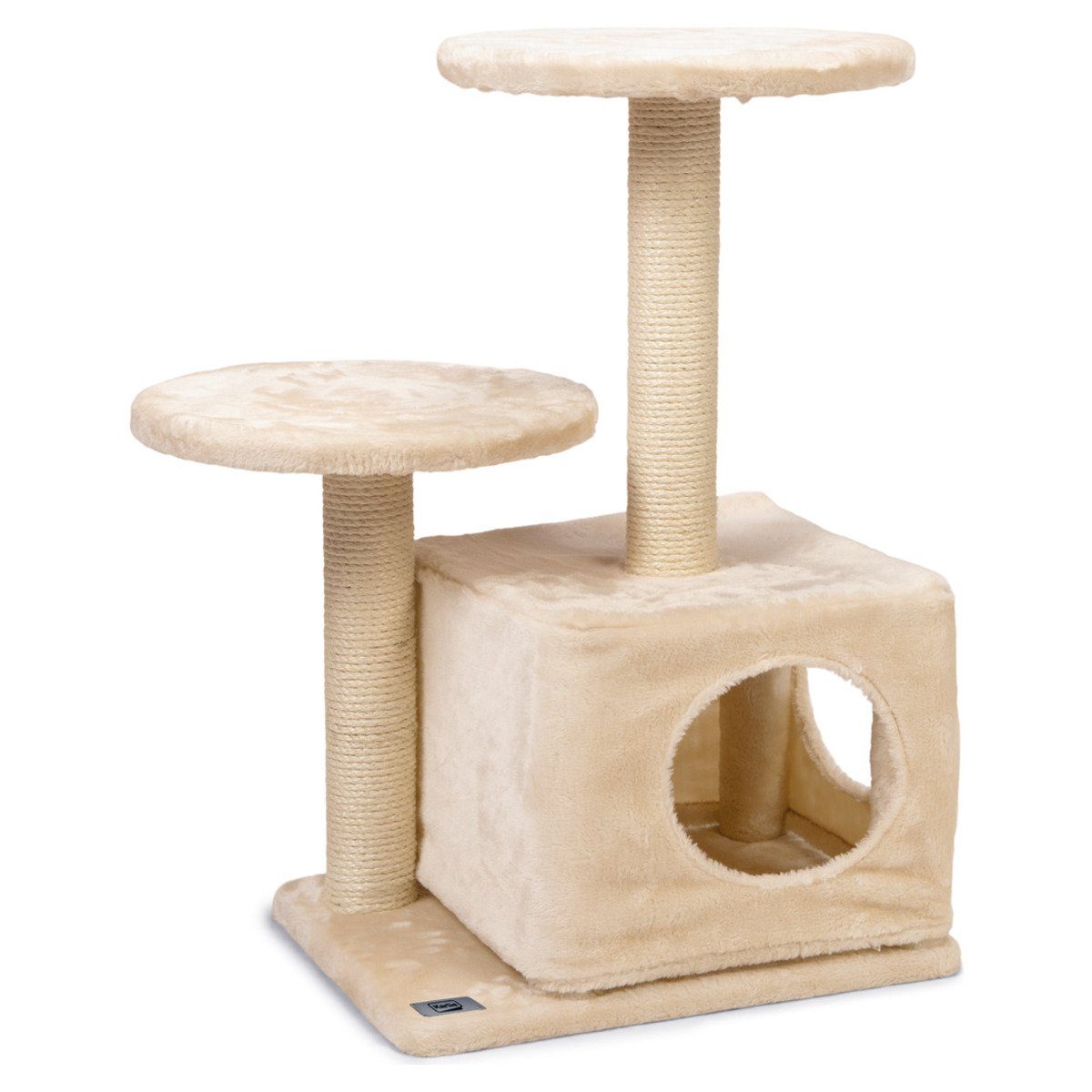 Der Karlie Kratzbaum Argo ist eine praktische Schlaf- und Kratzmöbelkombination. Auf drei Ebenen findet die Katze hier Raum zum Schlafen, Spielen und Beobachten. In der mit Plüsch bezogenen Schlafhöhle können sich Stubentiger ungestört ausruhen und die ebenfalls mit Plüsch gearbeiteten Podeste sind hervorragende Aussichtspunkte. Zwei mit Sisal umwickelte Säulen befriedigen das natürliche Kratzbedürfnis. Der Kratzbaum kommt in Beige und Grau.