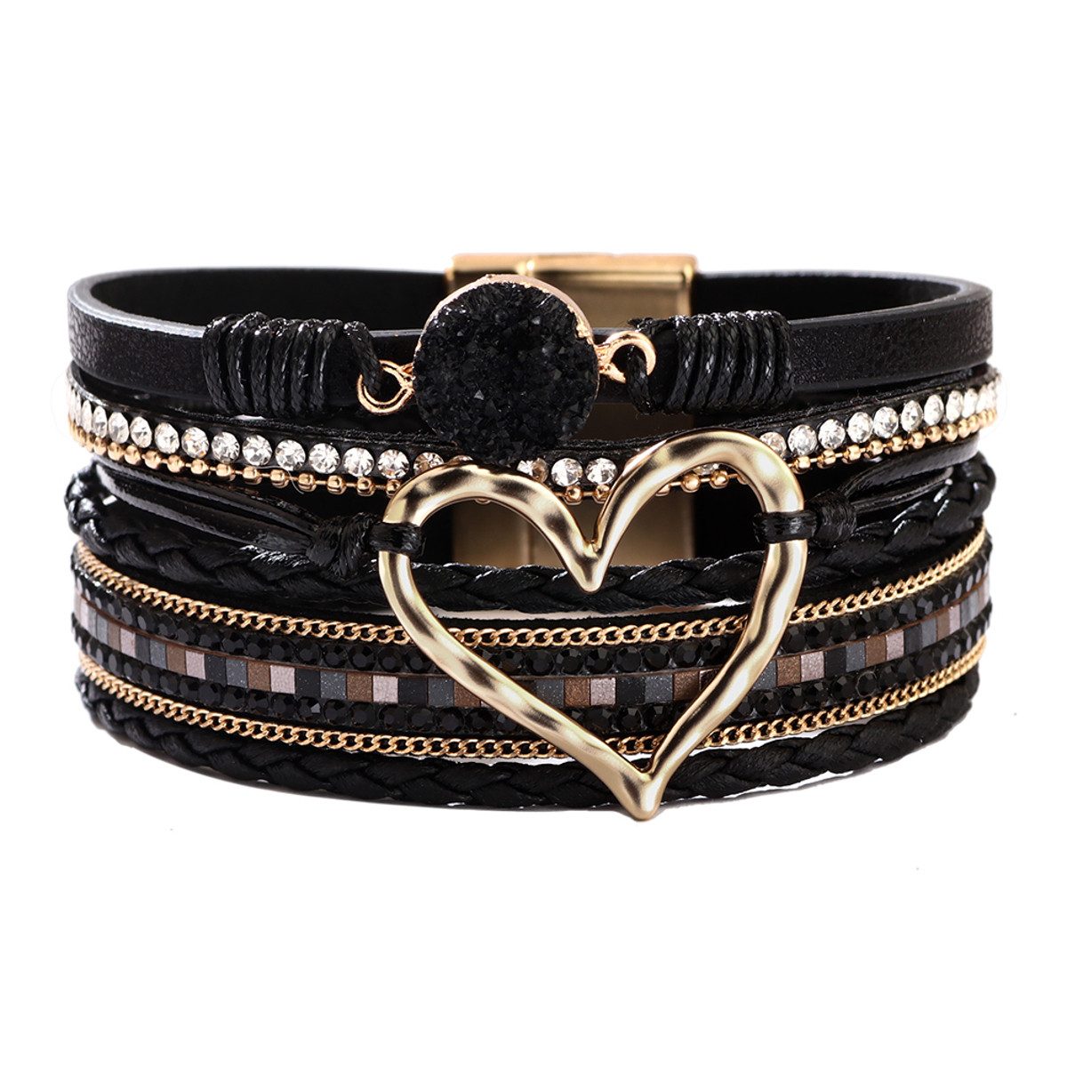 Jedes Lederarmband verfügt über ein großes Herz aus Metall in der Mitte, das in strahlendem Gold glänzt und das Design perfekt abrundet. Die verschiedenen Reihen des Armbands sind entweder mit funkelnden Schmucksteinen verziert oder kunstvoll geflochten, was dem Armband eine luxuriöse und zugleich verspielte Optik verleiht. Der praktische Magnetverschluss sorgt für sicheren Halt und einfaches Anlegen.