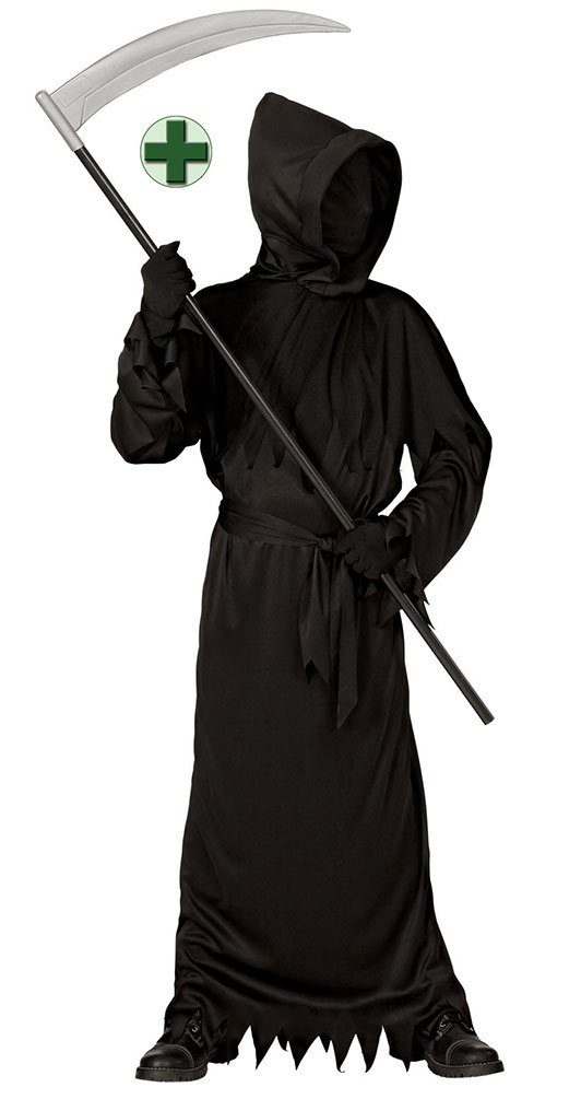 Ausstattung | Gewand mit Kapuze und unsichtbarer Gesichtsbedeckung, Gürtel, Sense |