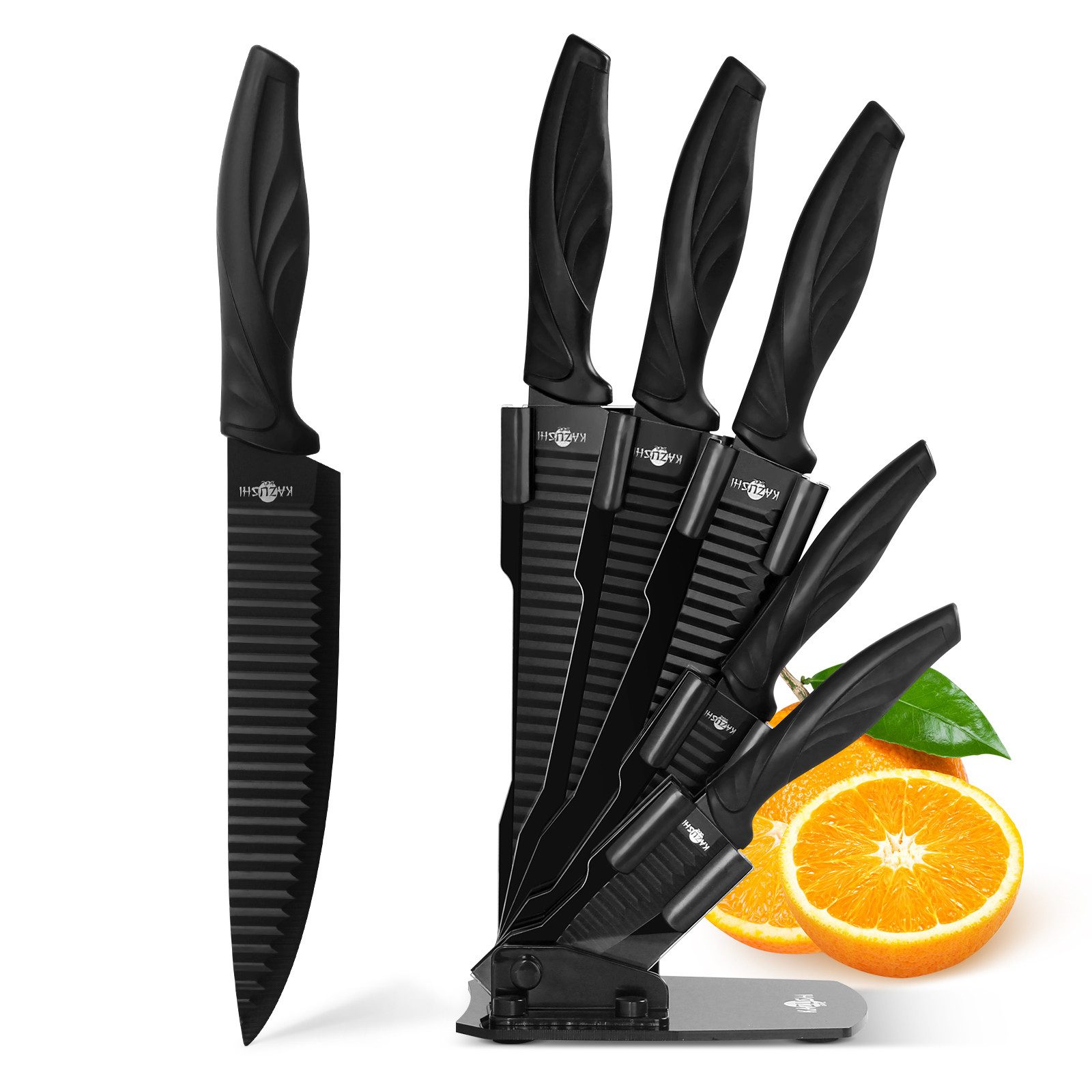 Lieferumfang | 1x Schneidemesser, 1x Kochmesser, 1x Brotmesser, 1x Allzweckmesser, 1x Schalmesser, 1x Küchenschere,1x Sparschaler,1x Spitzer, 360°drehbarer |