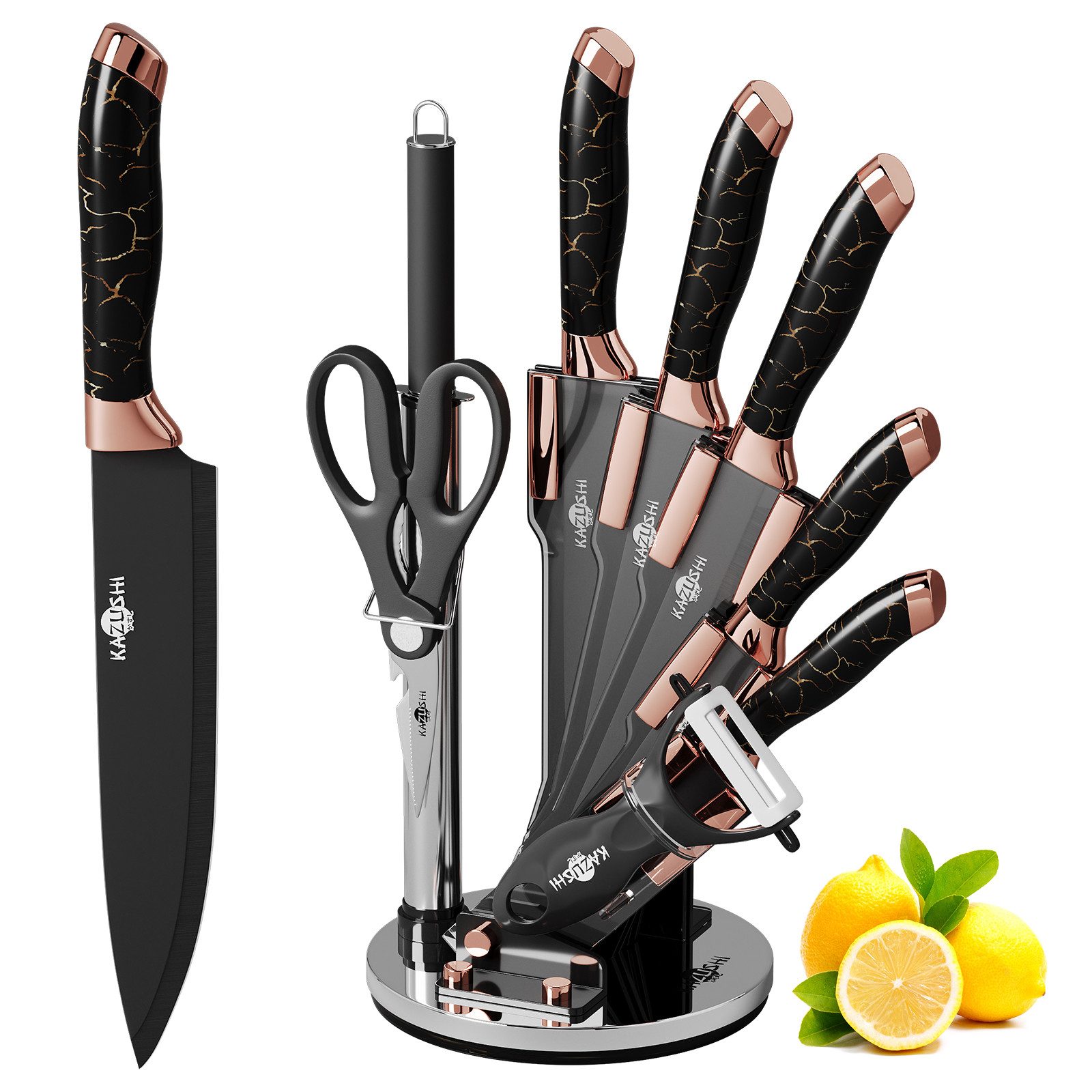 Edelstahl Material: Das KAZUSHI Küchenmesser-Set ist aus hochwertigem Edelstahl gefertigt, der rostfrei, korrosionsbeständig, leicht zu reinigen und zu pflegen ist. Es hat ausgezeichnete Schärfe, höhere Härte und Zähigkeit. das kann leicht Arten von Lebensmitteln schneiden.