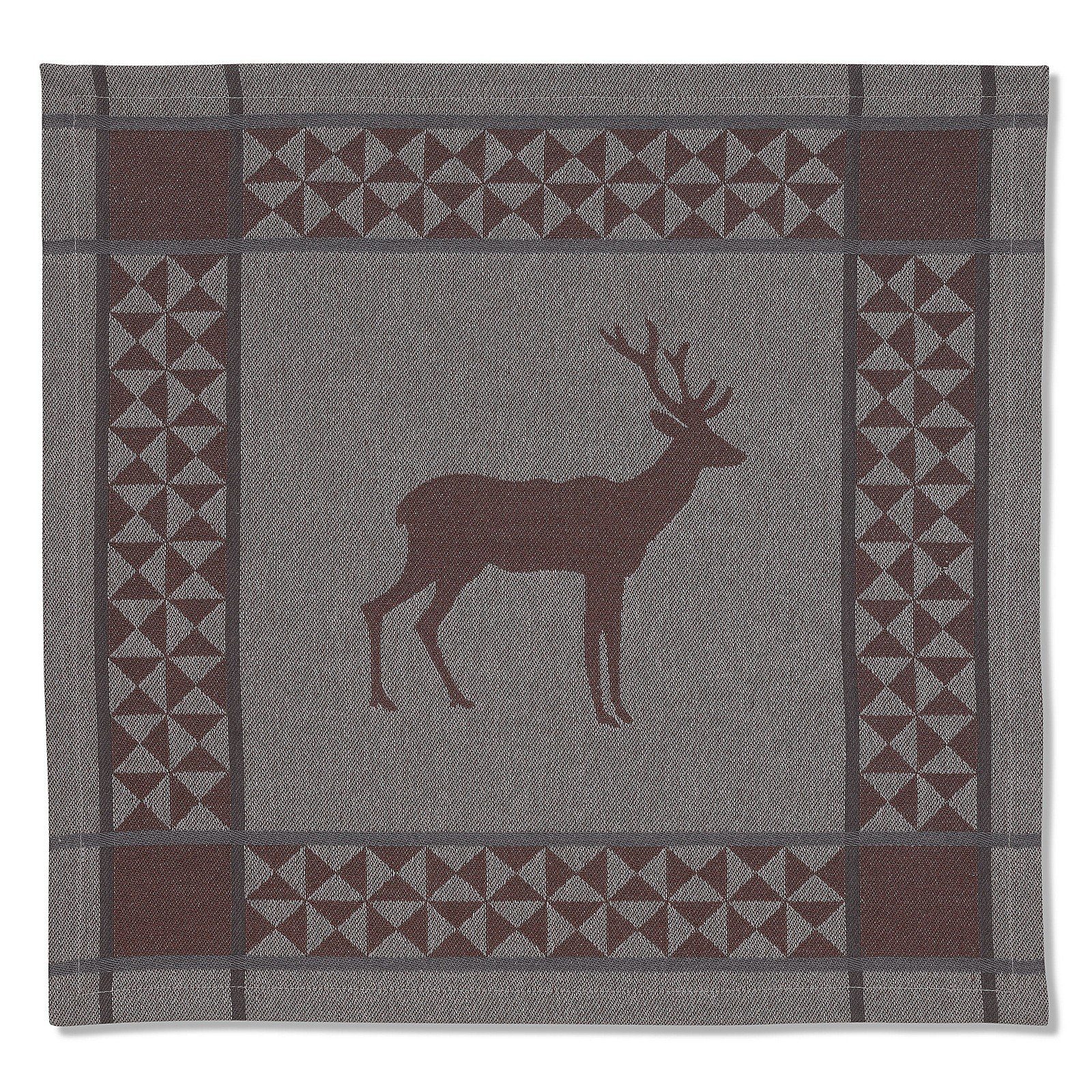Aus der schönen Küchen-Textilkollektion HENRIK: die Stoffserviette Henrik mit dezenter Hirsch-Silhouette, gehalten in Grau und Mahagonibraun. Die Stoffserviette Henrik ist aus 100% Baumwolle und in hochwertiger Qualität verarbeitet. Zudem ist es weich und fusselarm mit 195 g/qm. Maße: 40 x 40 cm.