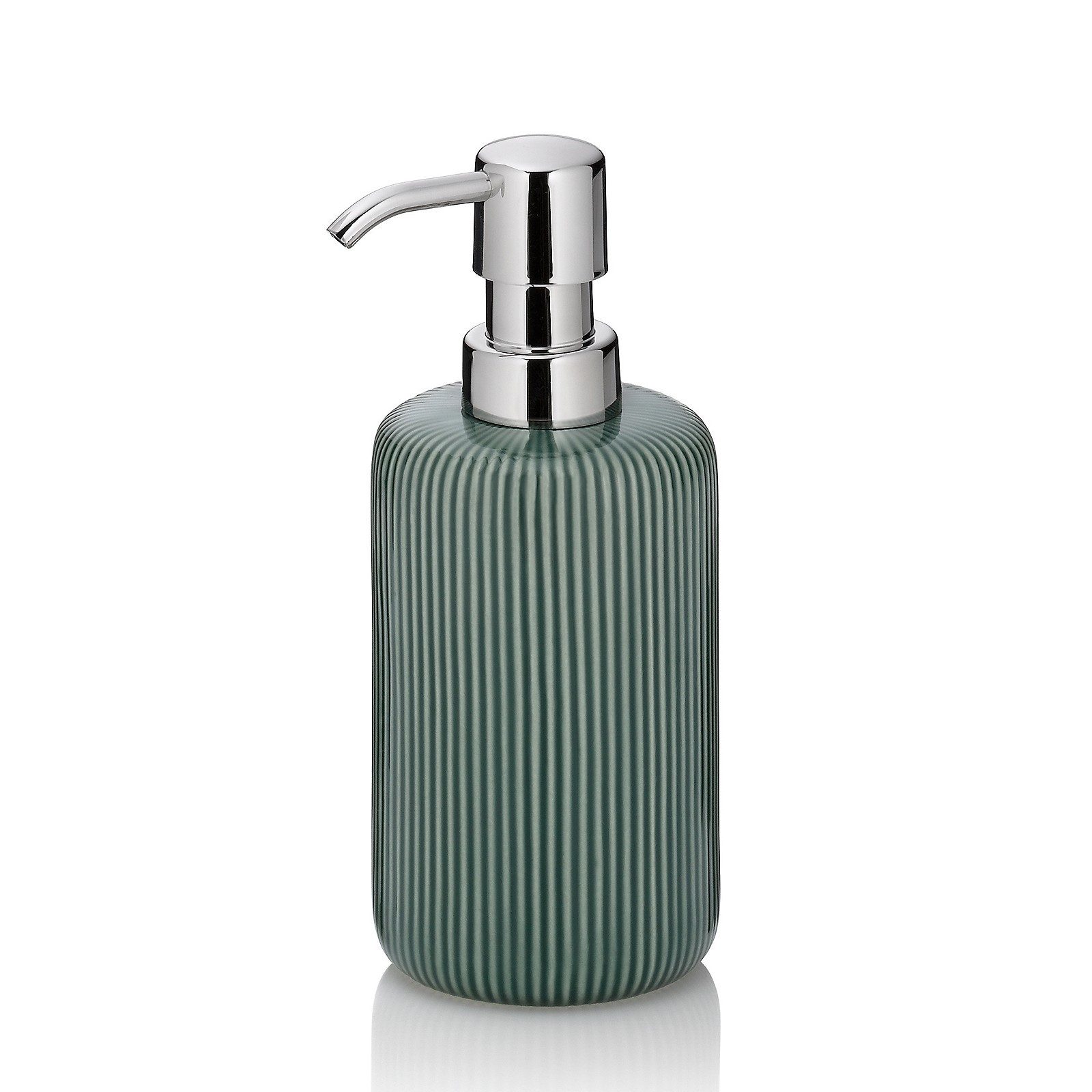 Farbe für Ihr Badezimmer: Großer, schöner Seifenspender Ava aus Keramik mit 350 ml Fassungsvermögen. Den Seifenspender erhalten Sie in den 5 trendigen Farbtönen Alpengrün, Himbeerrot, Steingrau, Rauchblau und Sonnengelb.