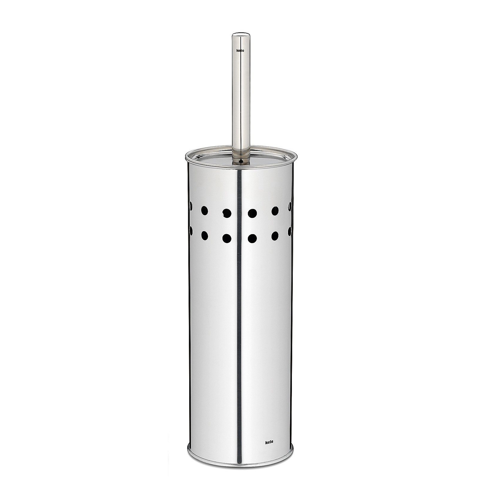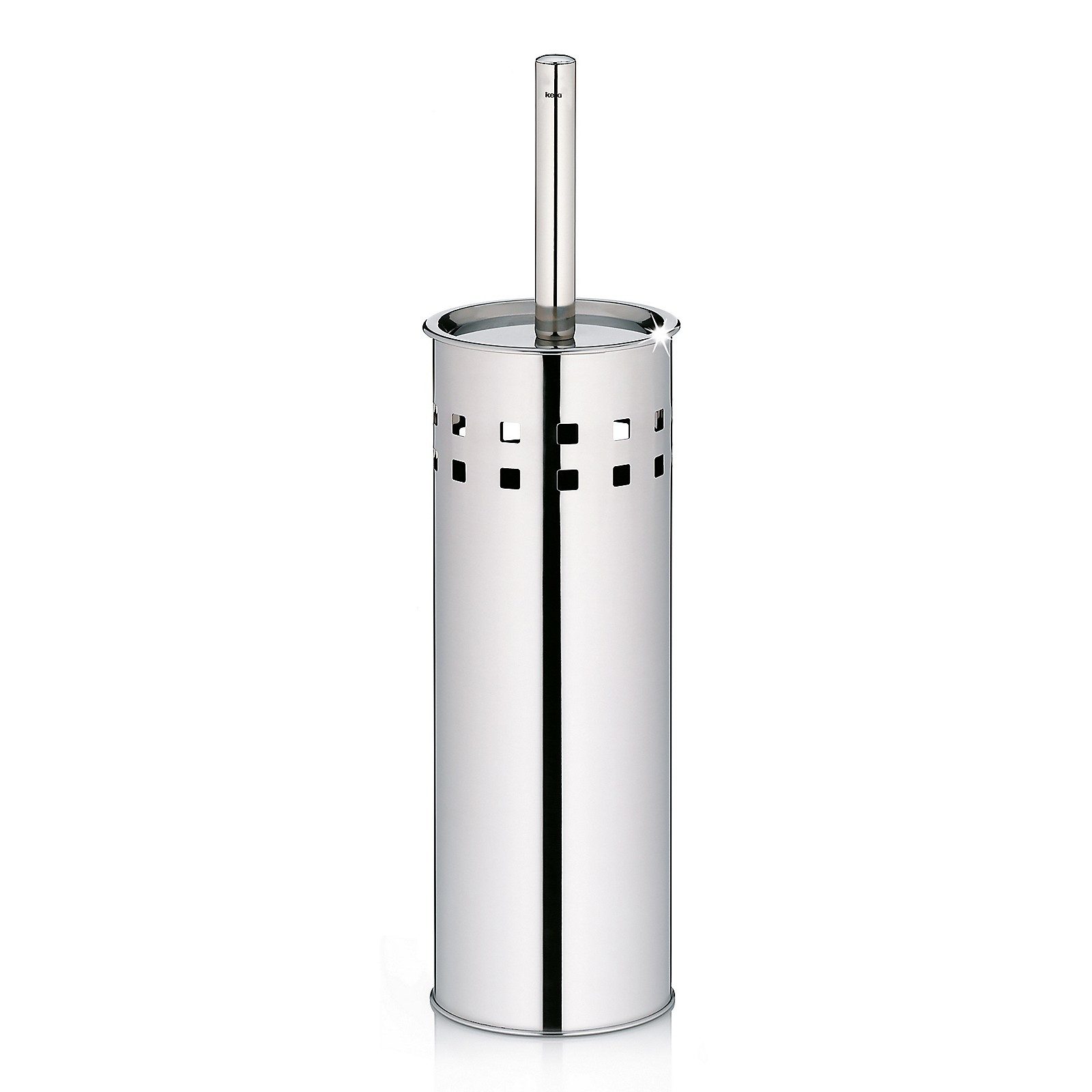WC-Garnitur aus mattem Edelstahl mit umlaufendem Karree-Muster. Der sichtbare Griff wie auch der Deckel der WC-Bürste sind aus Edelstahl. Der Bürstenstiel im Inneren ist aus weißem Kunststoff. Der Kunststoffstiel sowie der Bürstenkopf sind austauschbar. Mit einem herausnehmbaren Innenbehälter aus Kunststoff zum Auffangen des Tropfwassers. Die WC-Garnitur hat einen Durchmesser von 10 cm und ist 38 cm hoch.