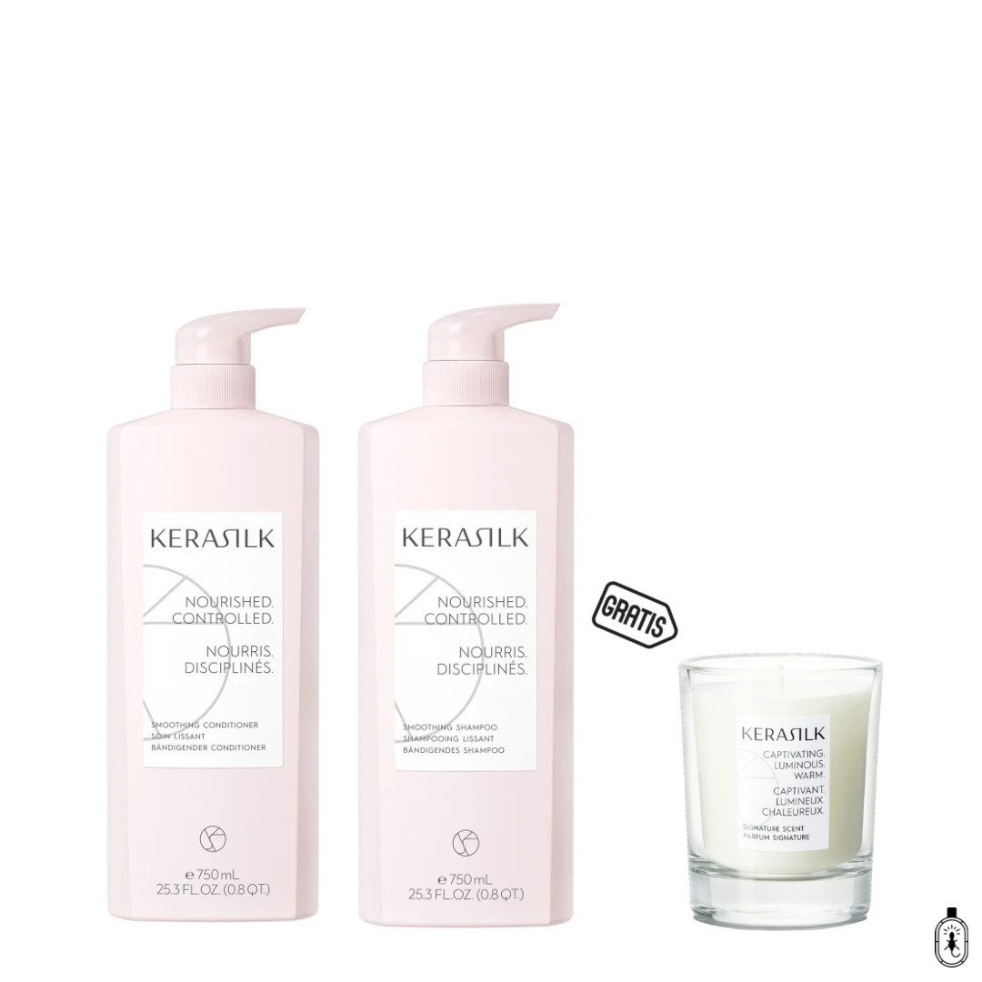 Produktinformationen Kerasilk Bändigendes Shampoo 750ml GENÄHRT. GESCHMEIDIG. Sanft reinigendes Shampoo mit Biomimetischer Seide und Shea- Öl. Unsere zu 100 % vegane Formulierung beruhigt Frizz und die gesamte Haarstruktur, während sie das Haar intensiv nährt für ein luxuriöses geschmeidiges Gefühl. LEISTUNG / VORTEILE: - Nährt das Haar intensiv und macht es vom Ansatz bis zu den Spitzen weich und geschmeidig - Beruhigt widerspenstige Partien, bekämpft Frizz und glättet die gesamte Haarstruktur - Verbessert die Kontrollierbarkeit - Entfernt Schmutz, Sebum, Öl, Schadstoffe und Produktrückstände und ist sanft zur Kopfhaut - Neutralisiert hartes Wasser und verhindert so mineralische Rückstände, das Haar bleibt in ausgeglichenem, neutralem Zustand Produktinformationen Kerasilk Bändigender Conditioner 750ml GENÄHRT. GESCHMEIDIG. Reichhaltiger Conditioner mit Biomimetischer Seide und Shea Öl. Unsere zu 100 % vegane Formulierung nährt intensiv, beruhigt die gesamte Haarstruktur und verbessert deutlich die Kontrollierbarkeit für luxuriöses geschmeidiges Haar. LEISTUNG / VORTEILE: - Nährt das Haar intensiv und macht es vom Ansatz bis zu den Spitzen glatt und geschmeidig - Beruhigt widerspenstige Partien, bekämpft Frizz und glättet die gesamte Haarstruktur - Verbessert die Kontrollierbarkeit und pflegt intensiv für einfacheres Entwirren Inklusive gratis Duftkerze