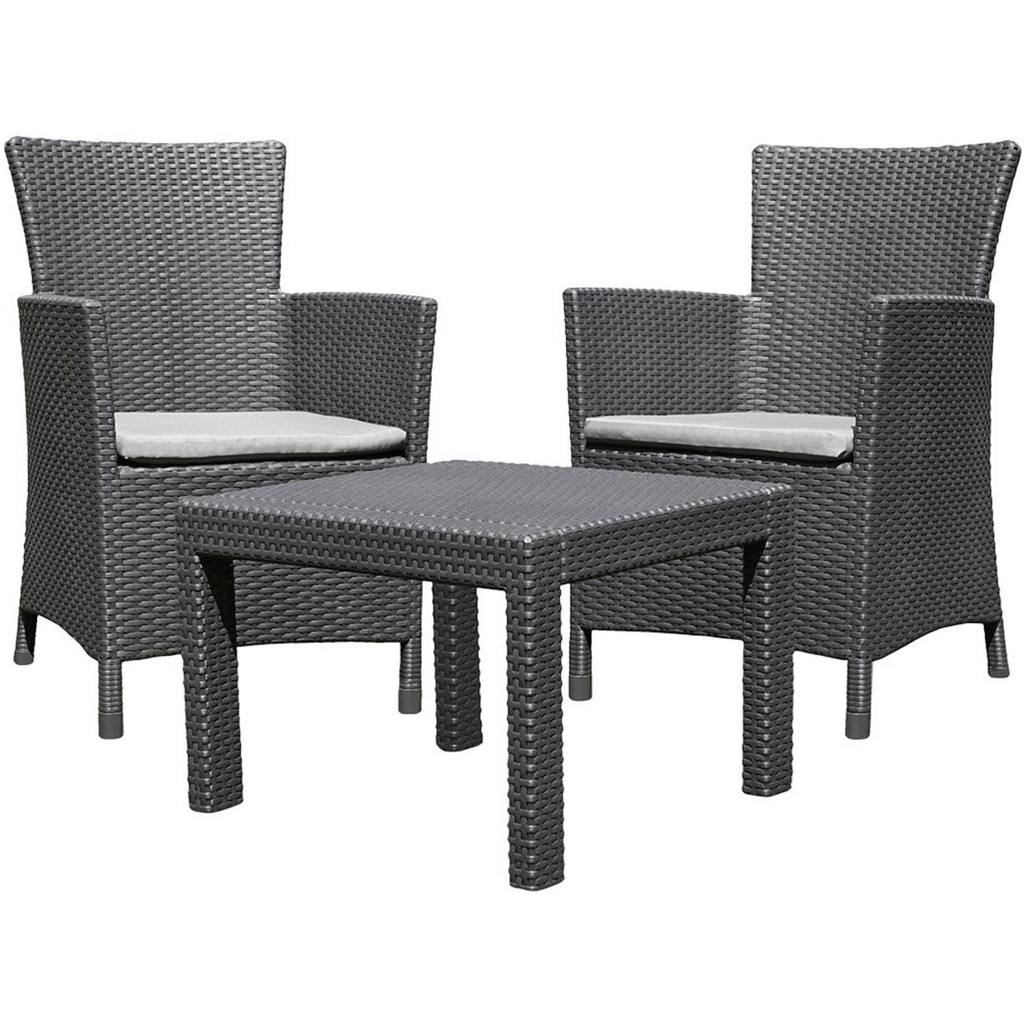 Klassiches und funktionalle Gartengarnitur in Rattan-Optik. Bestehend aus zwei Sesseln [inkl. Kissen] und einen Beisteltisch. Das Gartenset ist aus leichtem und plegeleichtem Kunstoff. Beständig gegen Wetterbedingungen und UV-Strahlung - die Farben werden nicht verblassen. Kompakte Abmessungen ermöglichen eine einfache und zudem werkzeuglose Montage sowie Lagerung. Ideal geeignet für die Einrichtung kleiner Balkonflächen, Terrassen oder Gärten.