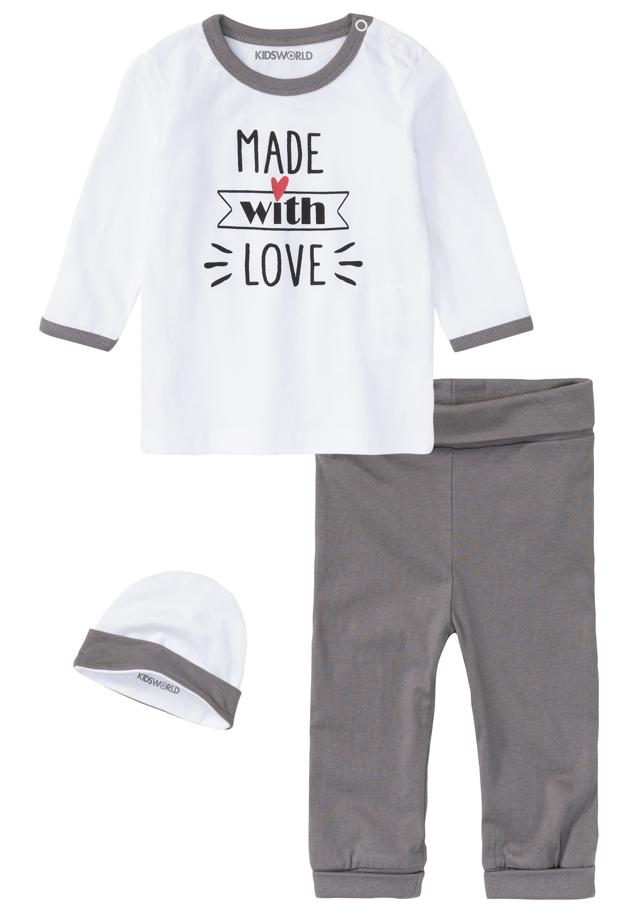 Niedliche Outfits kreieren ohne viel Zeit zu verlieren? Das klappt mit diesem Set », 3 teiliges Baby-Set - NEUE KOLLEKTION« von KIDSWORLD. Es besteht aus 3 Basic-Teilen — Strampler, Jäckchen und Mütze —, die zusammen eine hübsche Kombination ergeben. Vom Design mit Aufdruck kann man nie zu viel kriegen. Das Jersey schmiegt sich sanft an die Babyhaut und hinterlässt keine unangenehmen Druckstellen.