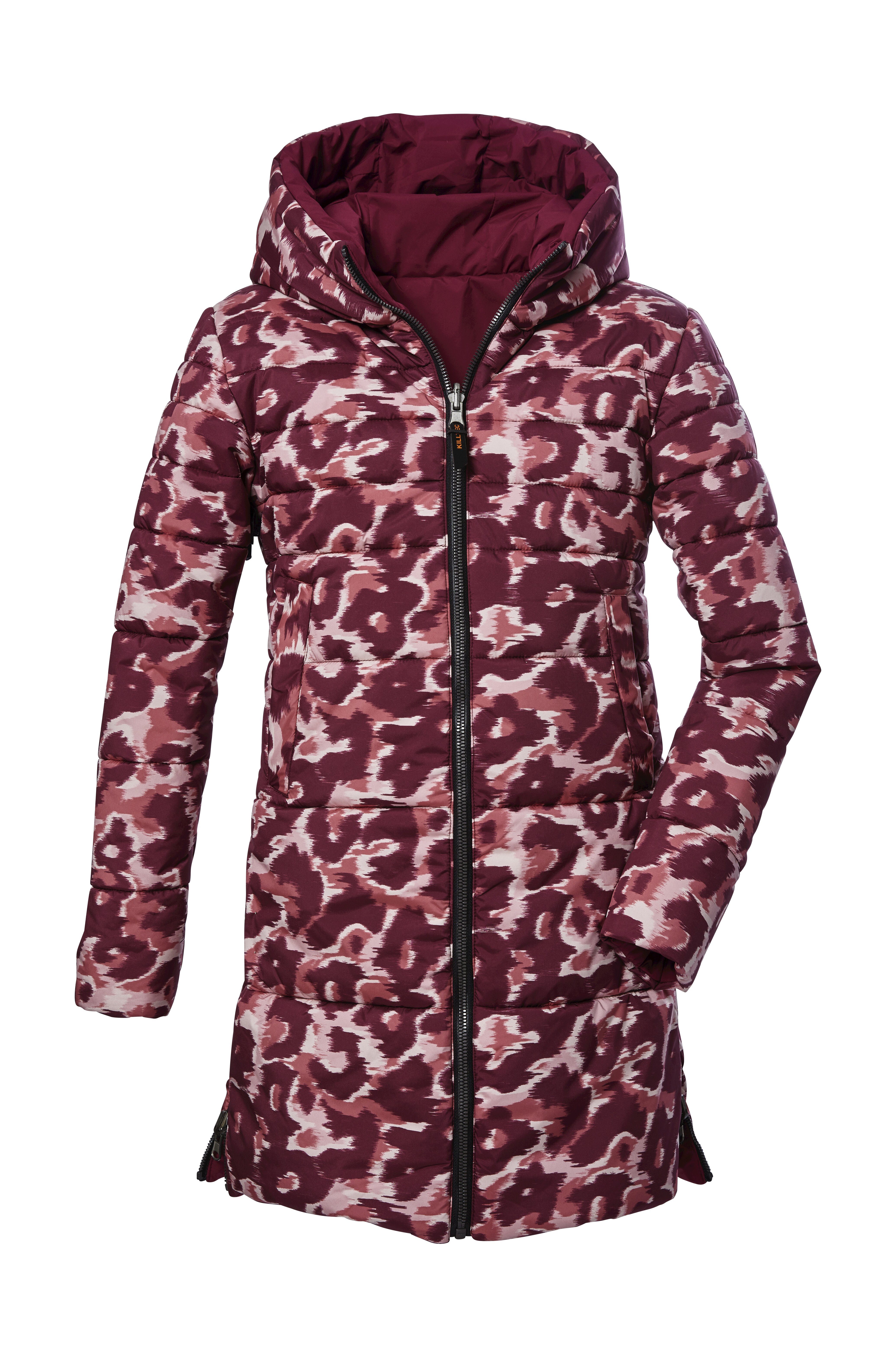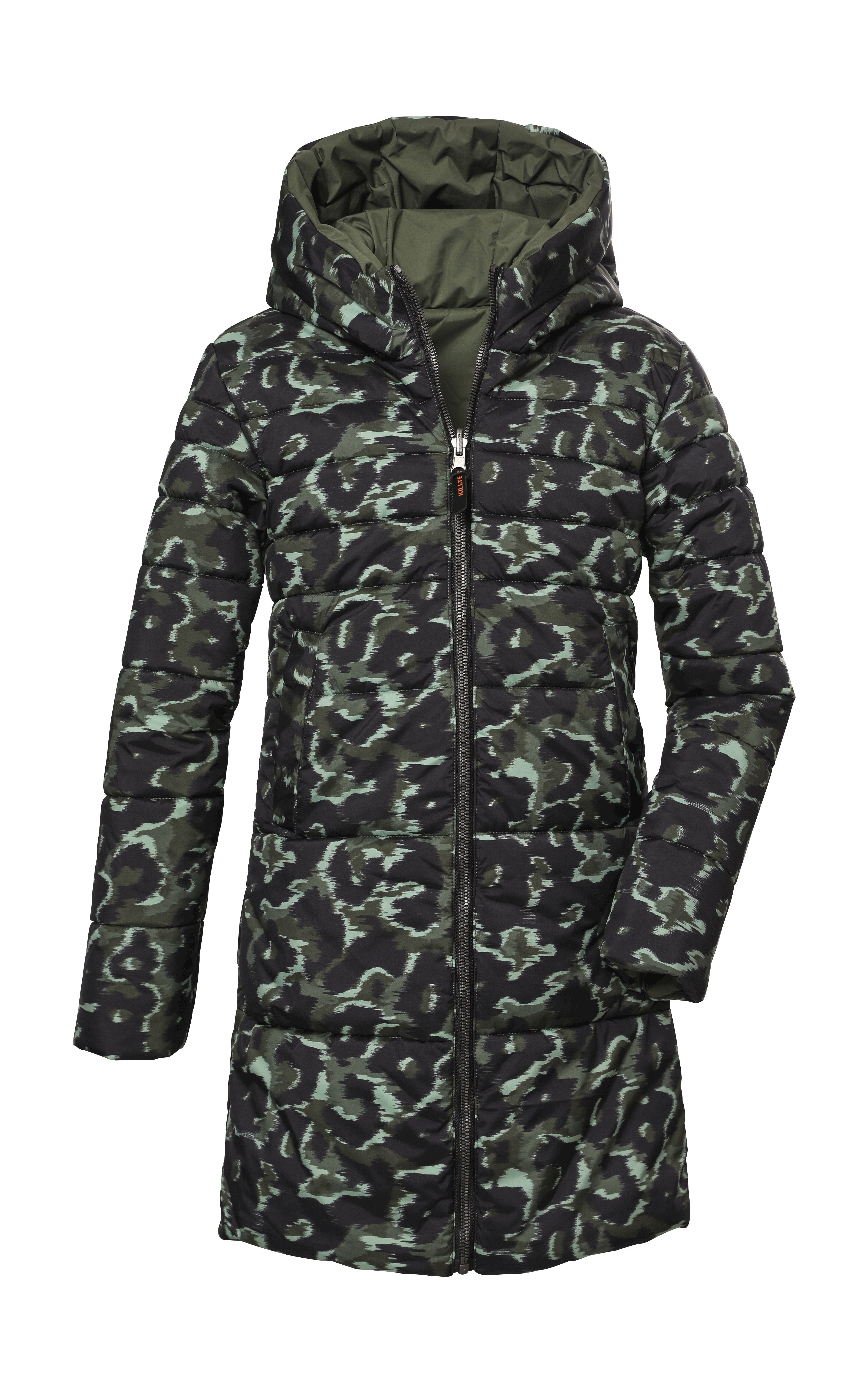 Der Mädchen Steppmantel mit Kapuze von killtec ist wendbar und überzeugt durch den lässigen Allover-Print auf der einen und die schlichte Optik auf der anderen Seite. Auf beiden Seiten befinden sich seitliche Eingrifftaschen. Der Mantel ist wasser- und windabweisend mit einer 10.000 mm Wassersäule. Gleichzeitig ist er atmungsaktiv. Der 2-Wege-Reißverschluss sowie seitliche Zipper sorgen für viel Bewegungsfreiheit trotz des langen Schnittes. Der Front-Reißverschluss ist außerdem mit einem praktischen Kinnschutz ausgestattet. Dieser Wintermantel wurde mit fluorfreien Mitteln imprägniert.