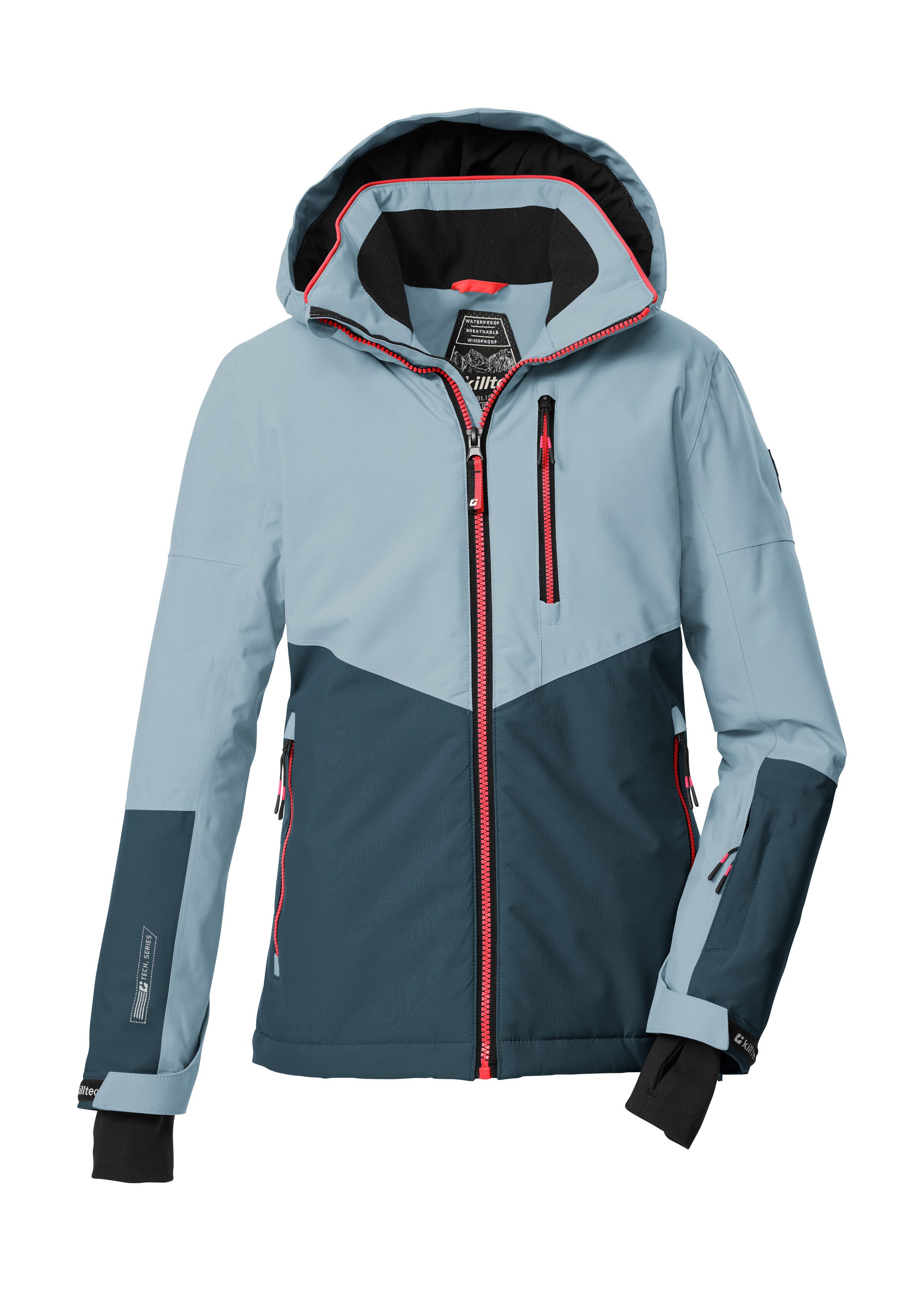 Die killtec Kids Funktionsjacke kombiniert angesagtes Design mit cleveren Features. Colourblock in angesagter Farbkombination und reflektierende Elemente machen die Skijacke zu einem echten Hingucker. Die Jacke hat verschweißte Nähte und ist wasser- und winddicht (10.000 mm, unser Tipp: ab und zu sollte die Jacke neu imprägniert werden). Gleichzeitig ist sie atmungsaktiv (3.000 g/m²/24 h). Die Kapuze und der Saum sind regulierbar. Der Reißverschluss ist mit einem praktischen Kinnschutz ausgestattet. Der rutschfeste Schneefang, elastische Ärmelbündchen mit Daumenschlaufen sowie Handy- und Skipasstasche tragen zum Spaß beim Wintersport bei. Diese Jacke wurde PFAs-frei imprägniert.