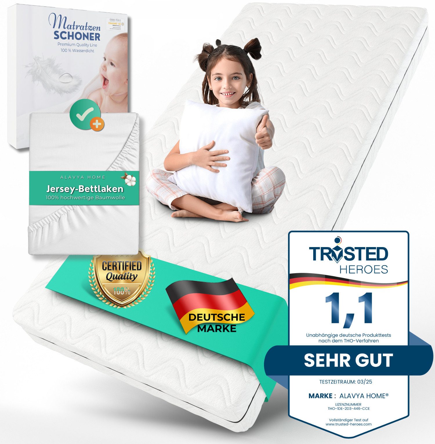 Materialzusammensetzung | Kindermatratze : Kaltschaum (Dichte ca. 25 kg/m3), Spannbettlaken : 100 % Baumwolle, Matratzenschoner : Oberseite: 70% Baumwolle 30% Polyester Unterseite: 100% wasserabweisendes TPU |