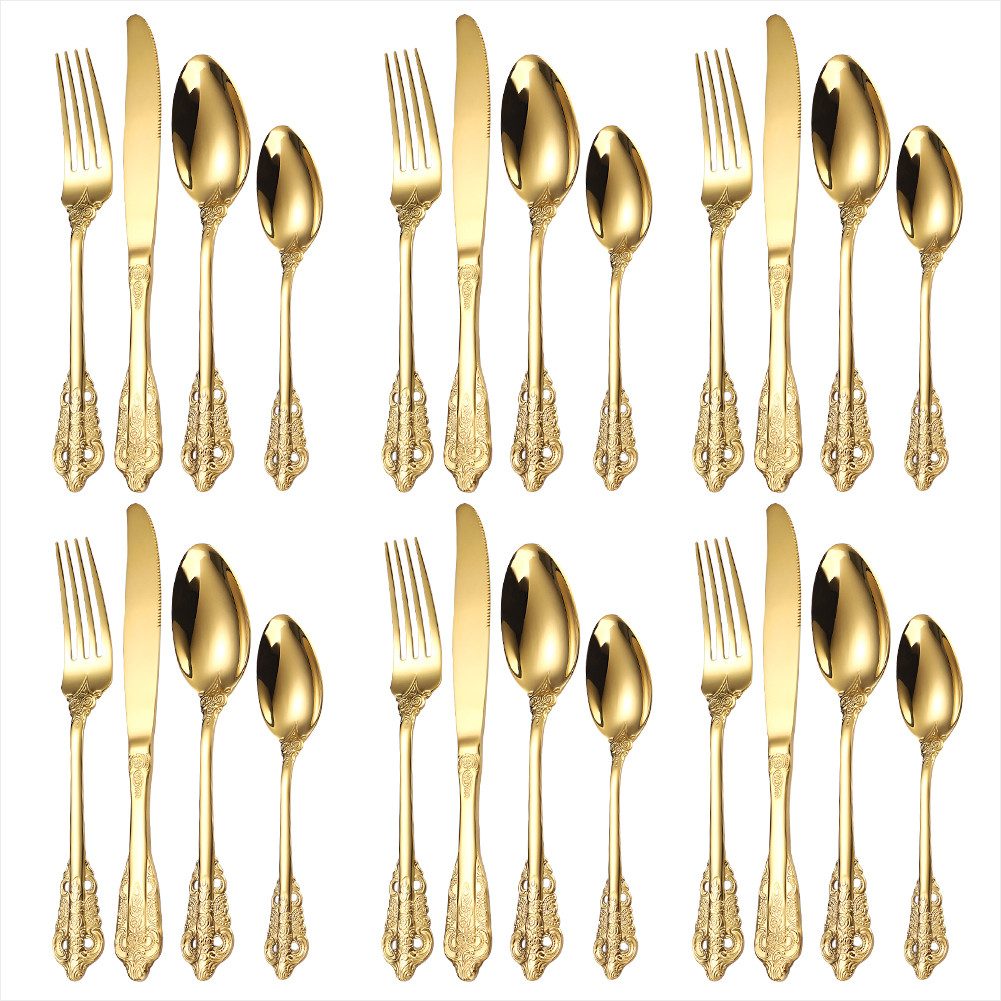 Der geprägte Griff unterstreicht den Sinn für Adel, die Palast-Elemente machen das 24-teilige besteck, voll von Eleganz und Adel, die sorgfältig geschnitzten Konturen und seidigen Linien zeigen Eleganz, während der geprägte Design-Griff einen Hauch von Adel in Ihr Leben bringt. Wenn Sie das Besteck benutzen, fühlen Sie sich wie bei einem bedeutenden Bankett im Palast, und es ist ein eleganter Rahmen für Ihren Tisch, wenn Sie Ihre Gäste bewirten
