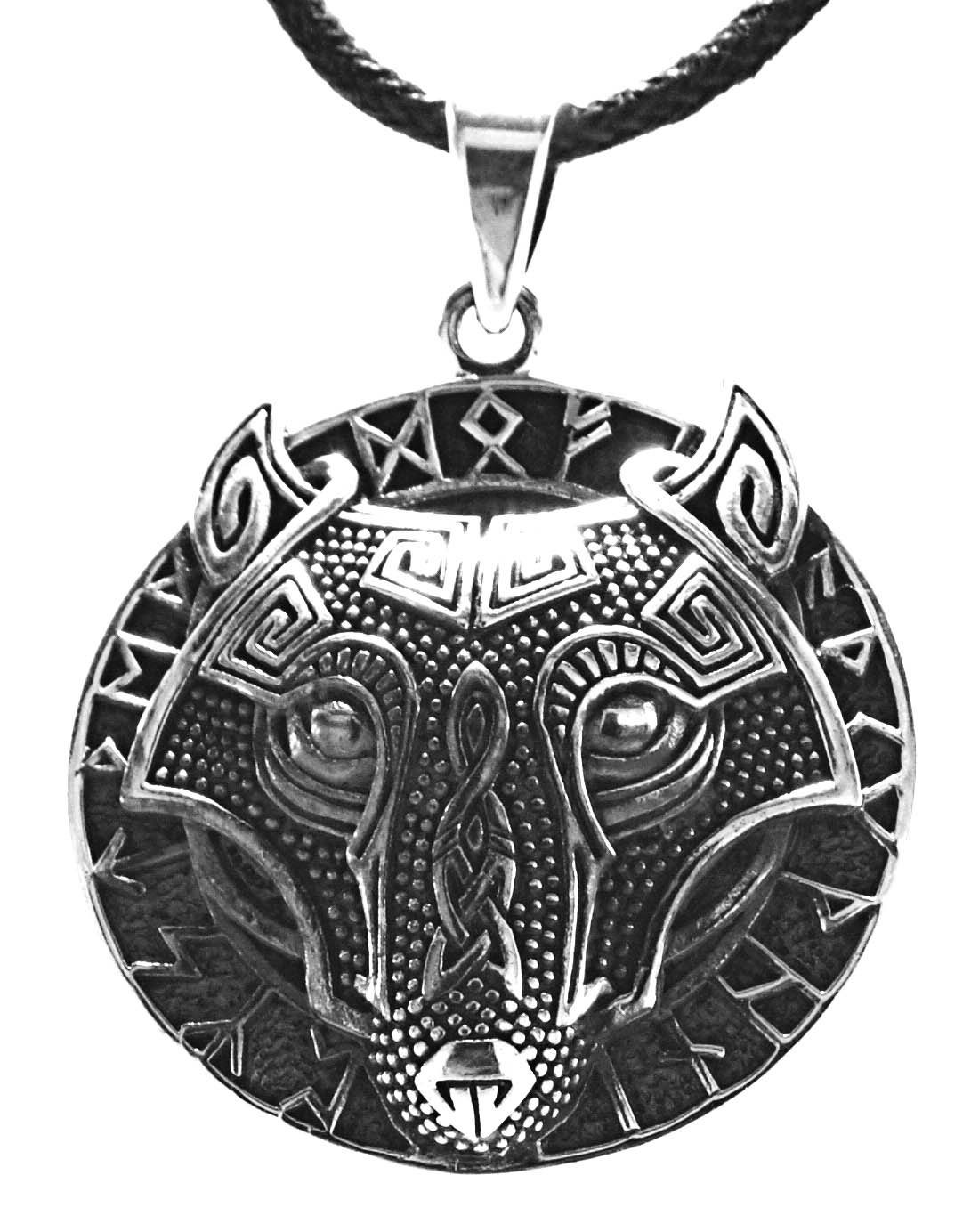 Kunstvoll gestalteter stilisierter Wolfskopf mit Runenkreis aus 925 Sterling Silber. Die Vorderseite des Kettenanhängers ist teilweise geschwärzt.
