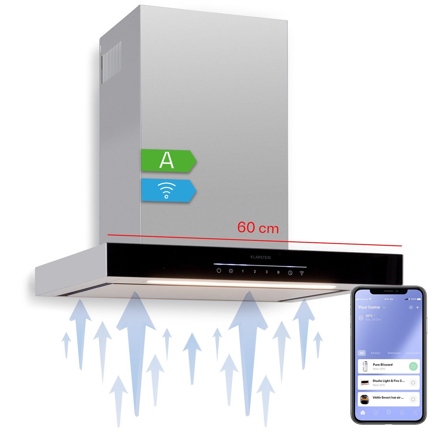 Mit 60 cm Breite ist die Klarstein Alinea Dunstabzugshaube für kleine und mittlere Kochflächen und Küchenzeilen bestens geeignet. Technisch überzeugt sie nicht nur mit bis zu 500 Kubikmeter Abluftleistung, sondern auch mit ihrer besonders einfachen Bedienung. Unkompliziert funktioniert das entweder über WiFi mit der Klarstein-App oder direkt über die Red Line Touch-Bediensektion an der Frontseite. Hier kannst du nicht nur die drei Ventilationsstufen, eine Hochleistungs-Boosterfunktion oder den Nachlüfttimer auswählen. Sie ermöglicht dir auch, mittels integrierter LED-Kochflächenbeleuchtung sowohl Helligkeit als auch Lichtwärme zu steuern.