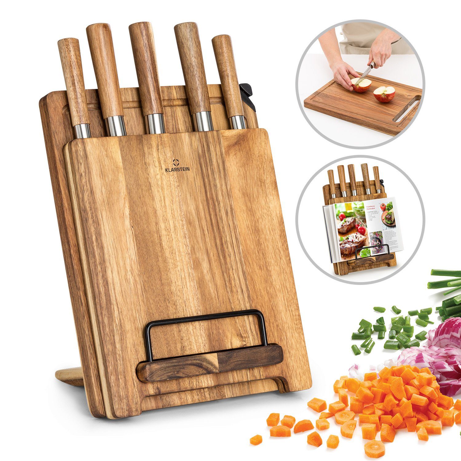 In der Küche sind scharfe Messer ein absolutes Muss: Mit dem Klarstein Komaki Messer-Set kommen 5 verschiedene Präzisionsklingen aus rostfreiem, gehärtetem Stahl zu dir nach Hause. Und sie bringen direkt 3 Schneidbretter mit sich. Doch das Komaki Messerset hat einen besonderen Pfiff: Die drei Schneidbretter lassen sich ineinander stecken und bilden auf diese Weise direkt einen Messerblock. Das mittlere Brett hat dafür direkt 5 Einschübe in denen die Klingen sicher und ordentlich aufbewahrt sind. Das ist aber nicht der einzige Clou: zwei der Schneidbretter bilden zusammen auch direkt eine praktische Halterung für Kochbücher, Smartphones oder Rezeptbücher. Damit nicht genug, verfügt das große Schneidbrett noch über einen praktischen, integrierten Messerschärfer.