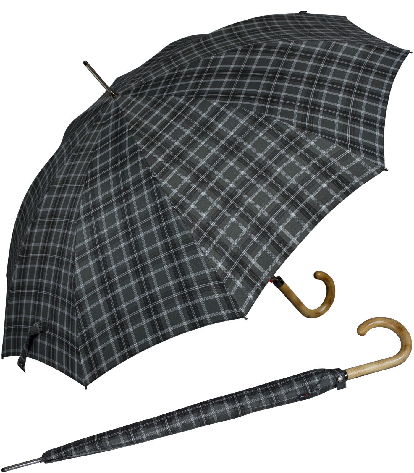 Dieser Stockschirm ist ein eleganter, klassischer Langschirm mit Automatikfunktion für Herren von Knirps. Er besitzt einen handgefertigten Rundhakengriff aus echtem Ahornholz.