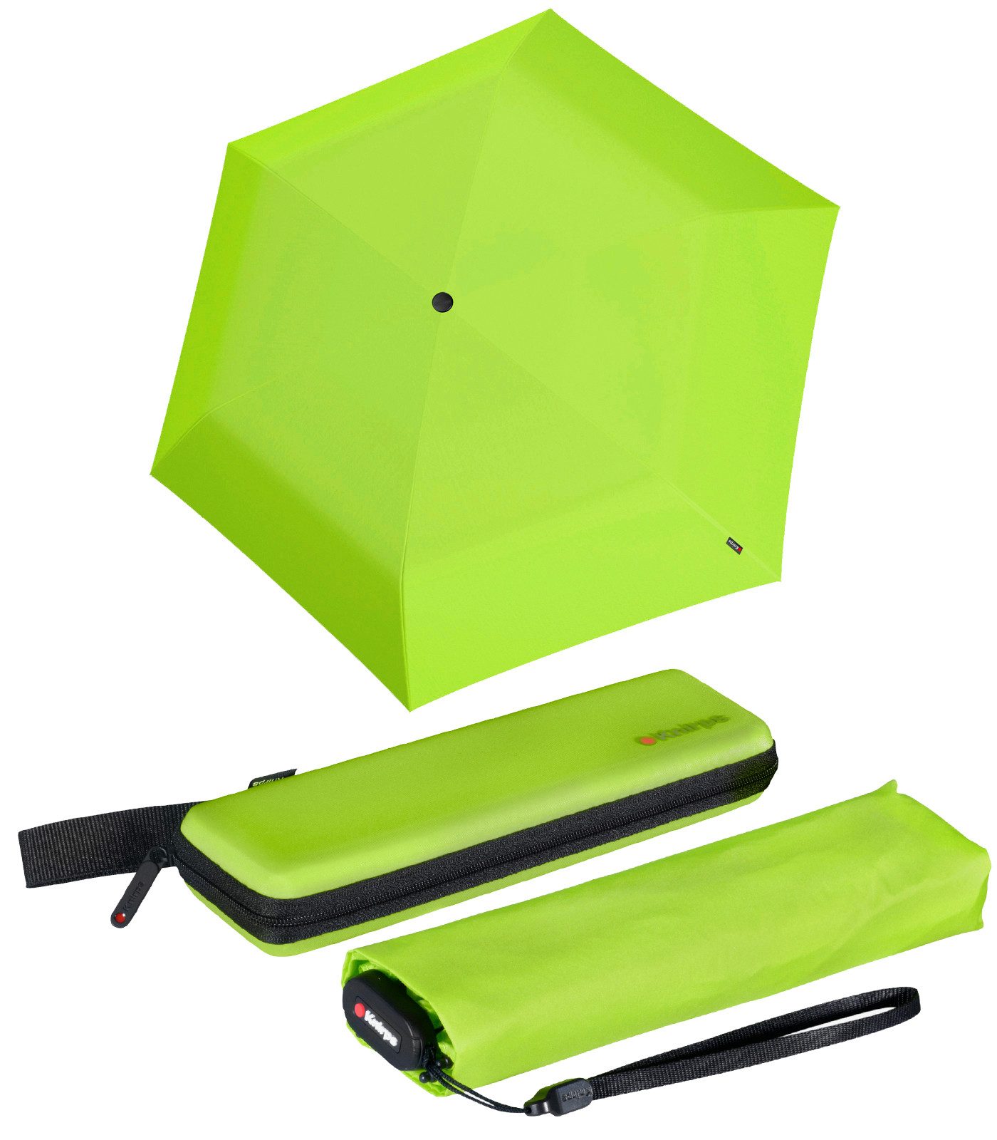 Der Taschenschirm verfügt über ein modernes schwarzes Gestell. Bedient wird er manuell leicht durch Tastenschieber. Das ausreichend große 6-teilige Dach bietet guten Schutz gegen plötzliche Regenschauer. Ein besonderes Highlight ist das auf dem EVA-Case angebrachte erhabene Knirps-Logo.