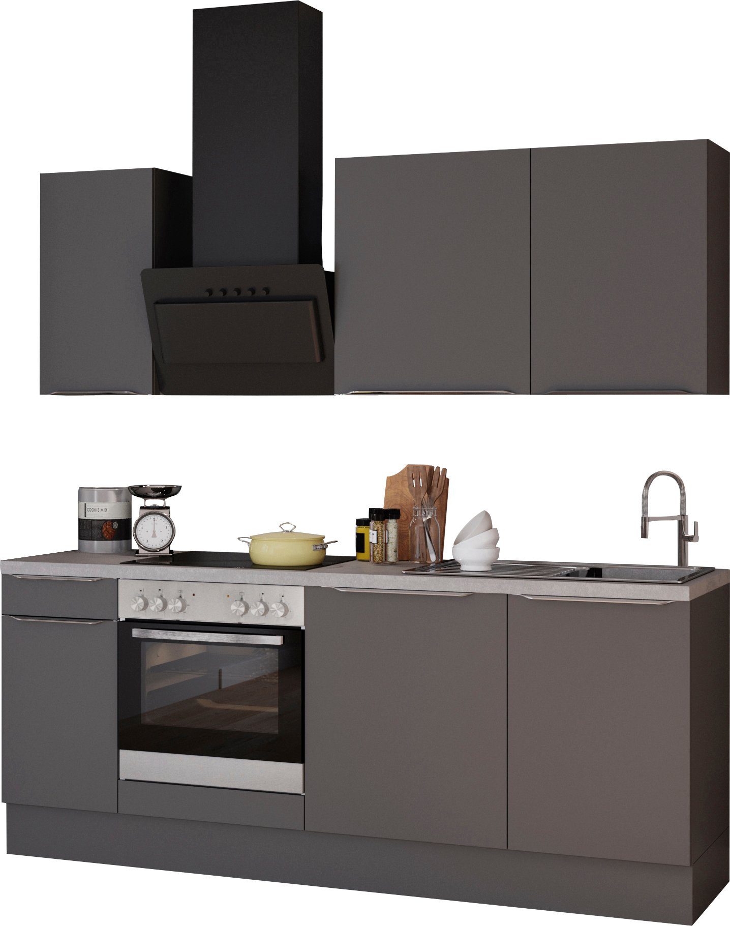 Ausstattung | Durchgehende Arbeitsplatte Schubkästen und Türen mit Soft-Close-Funktion Stabile Metallauszüge Wandabschlussleiste inkl. Edelstahl-Einbauspüle, mit Abtropffläche |