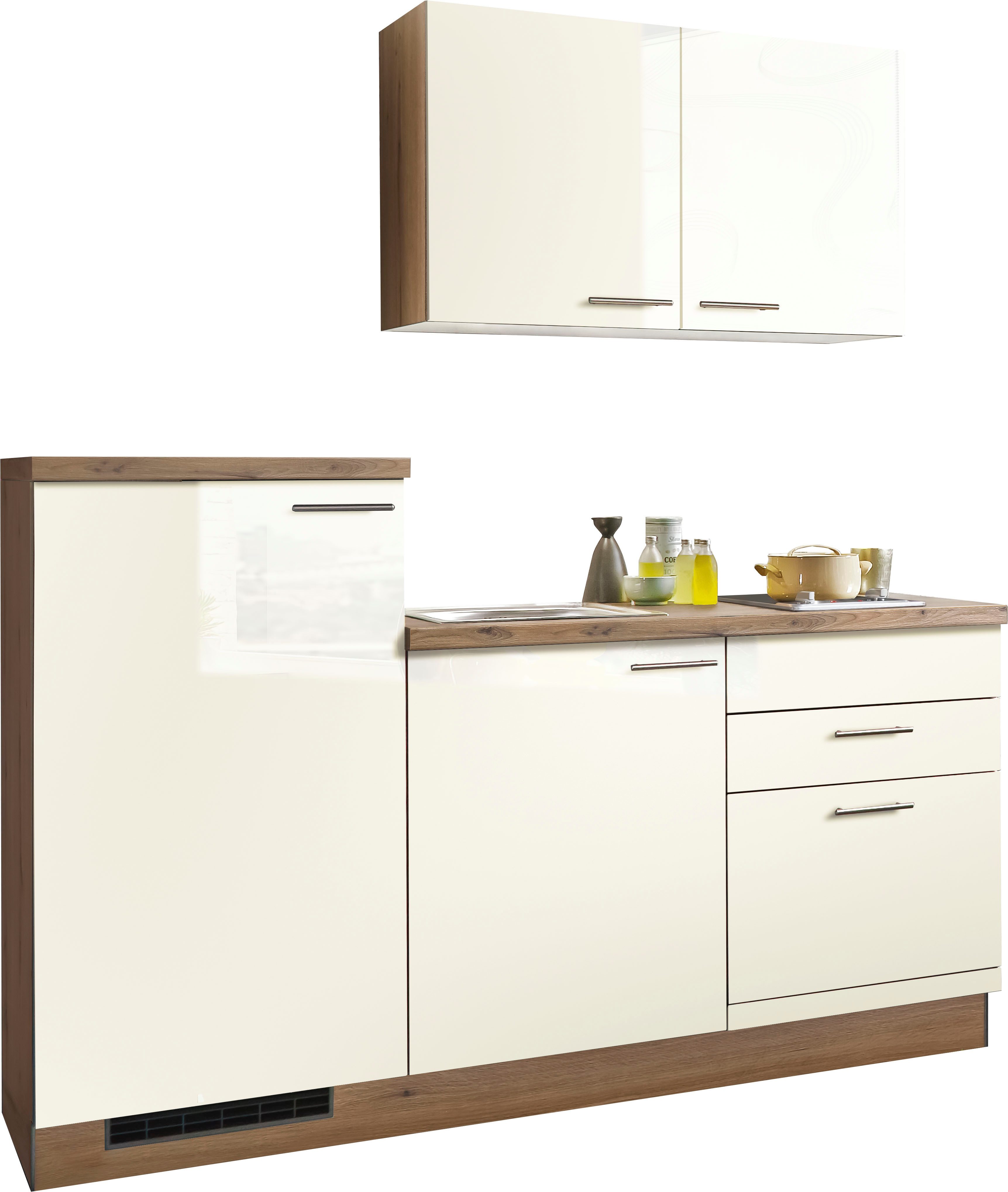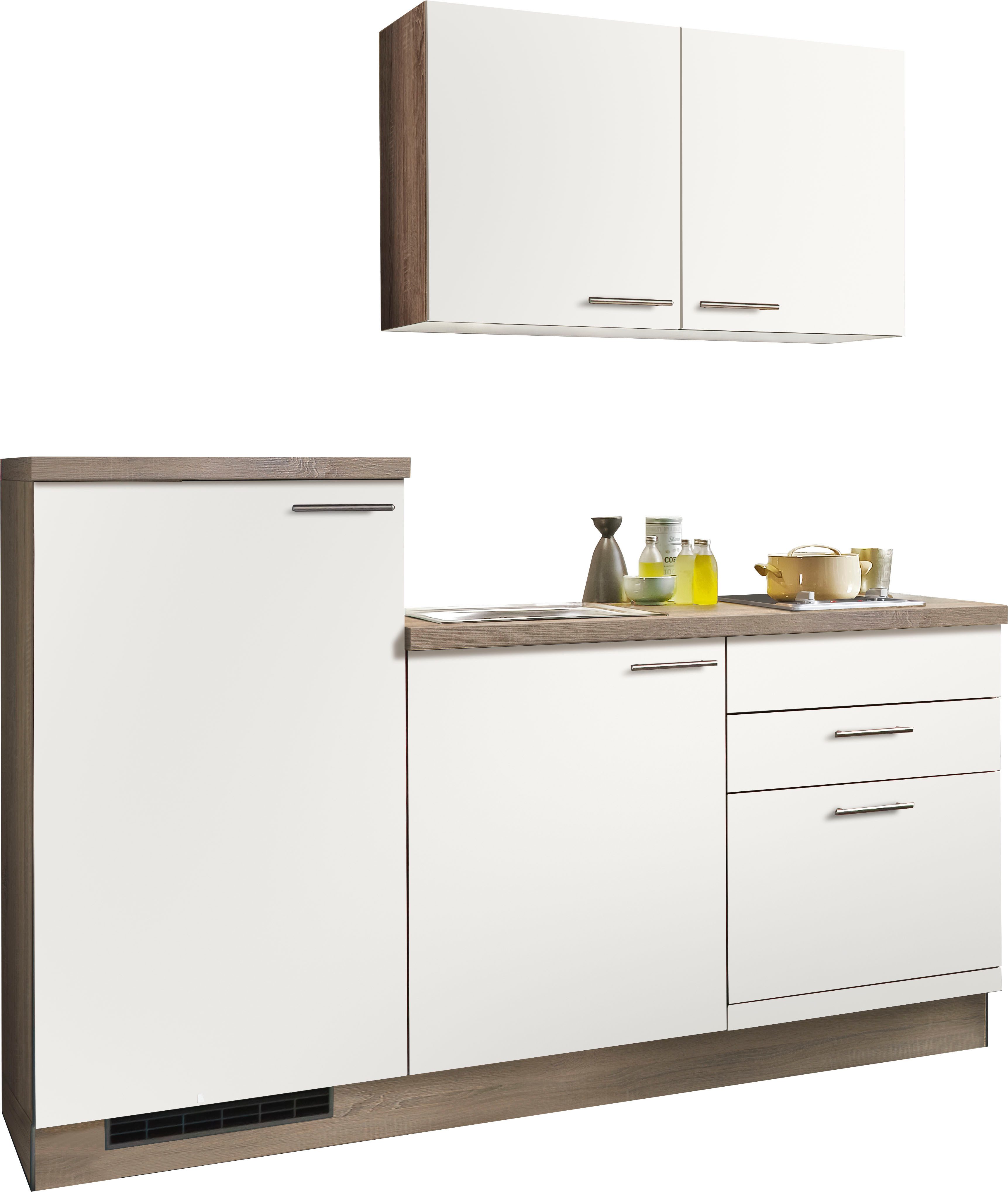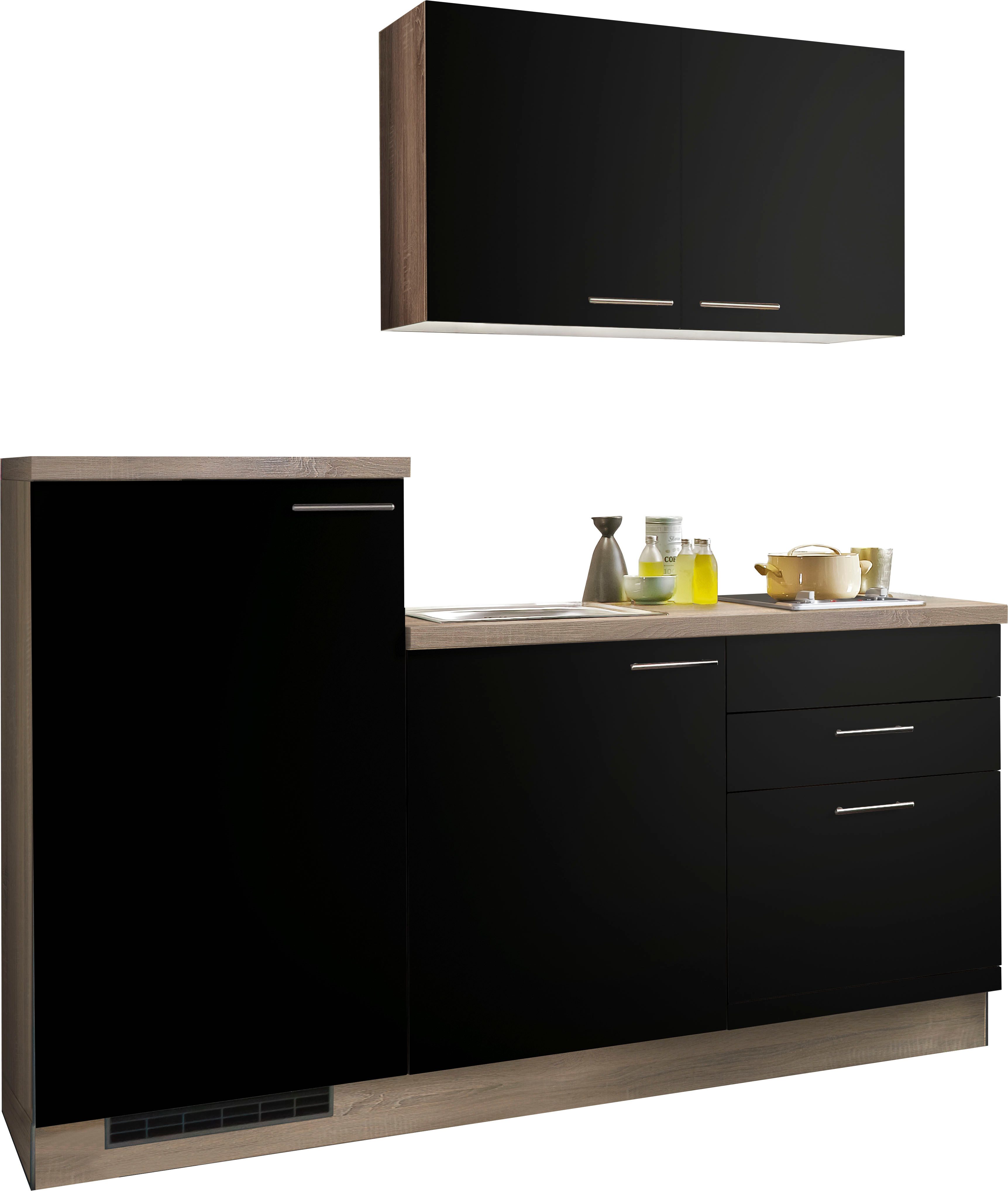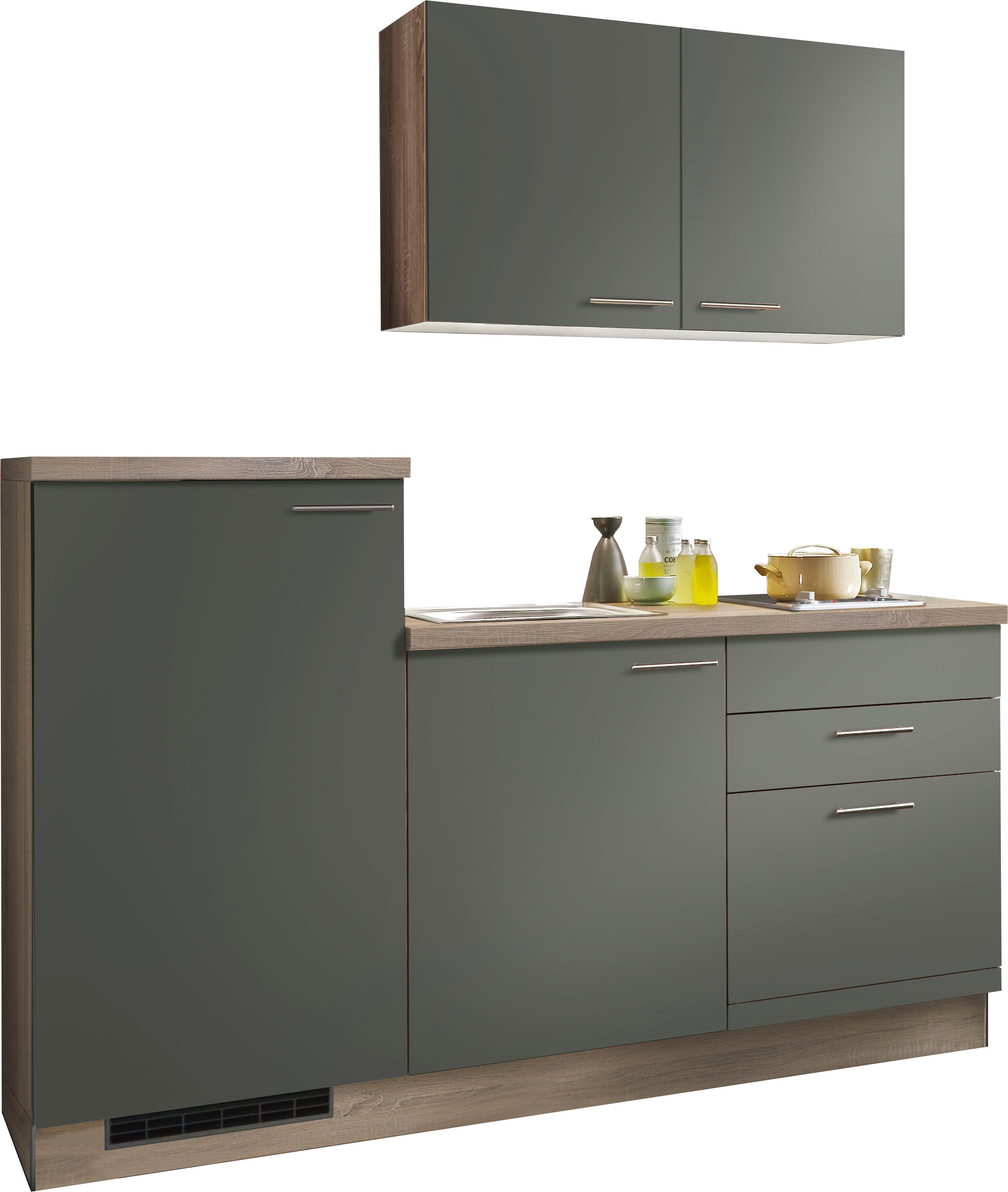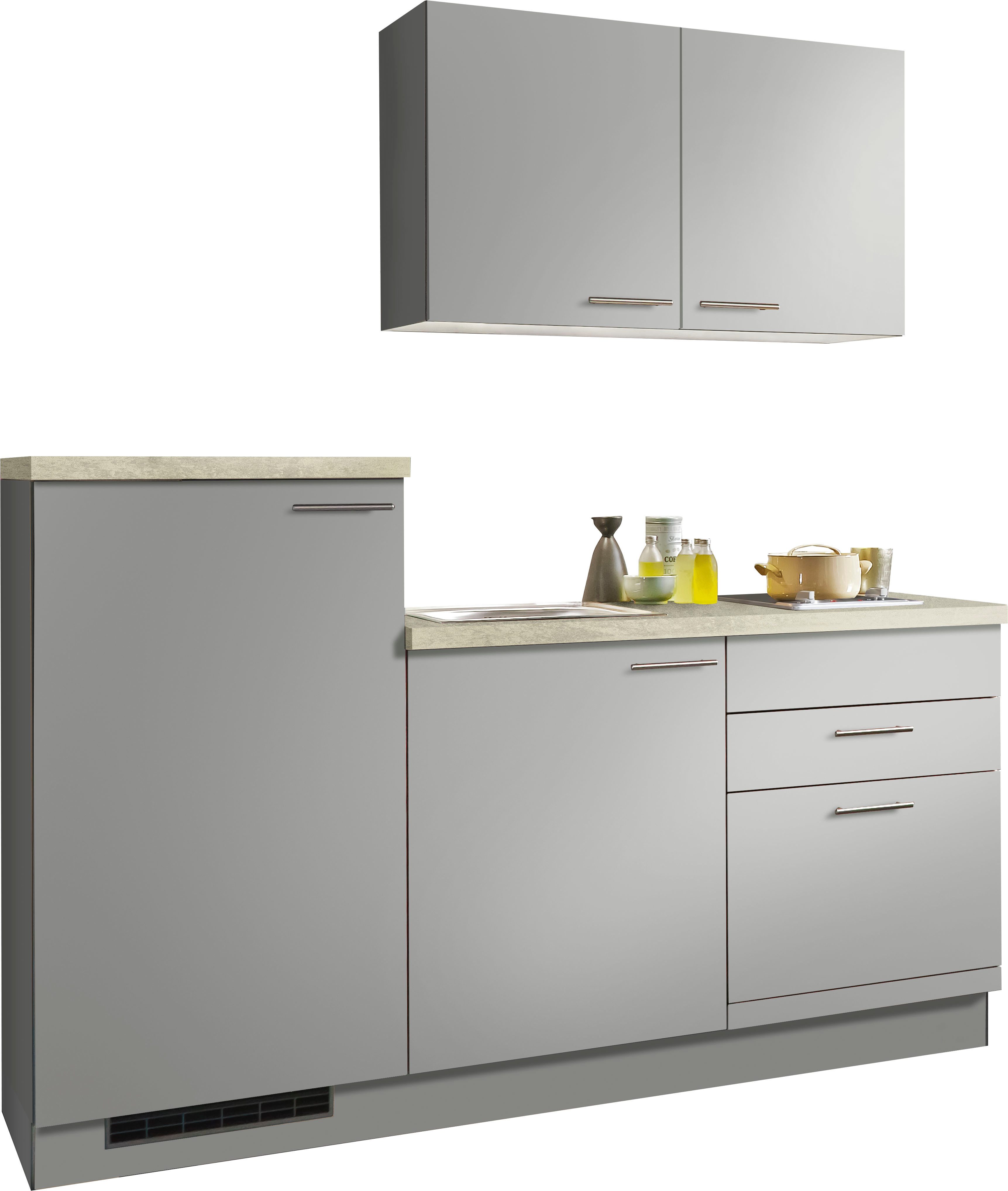 Ausstattung | Durchgehende Arbeitsplatte Höhenverstellbare Füße Türen mit Anschlagdämpfern Türen mit Soft-Close-Funktion inkl. Edelstahl-Einbauspüle, ohne Abtropffläche mit E-Geräten |