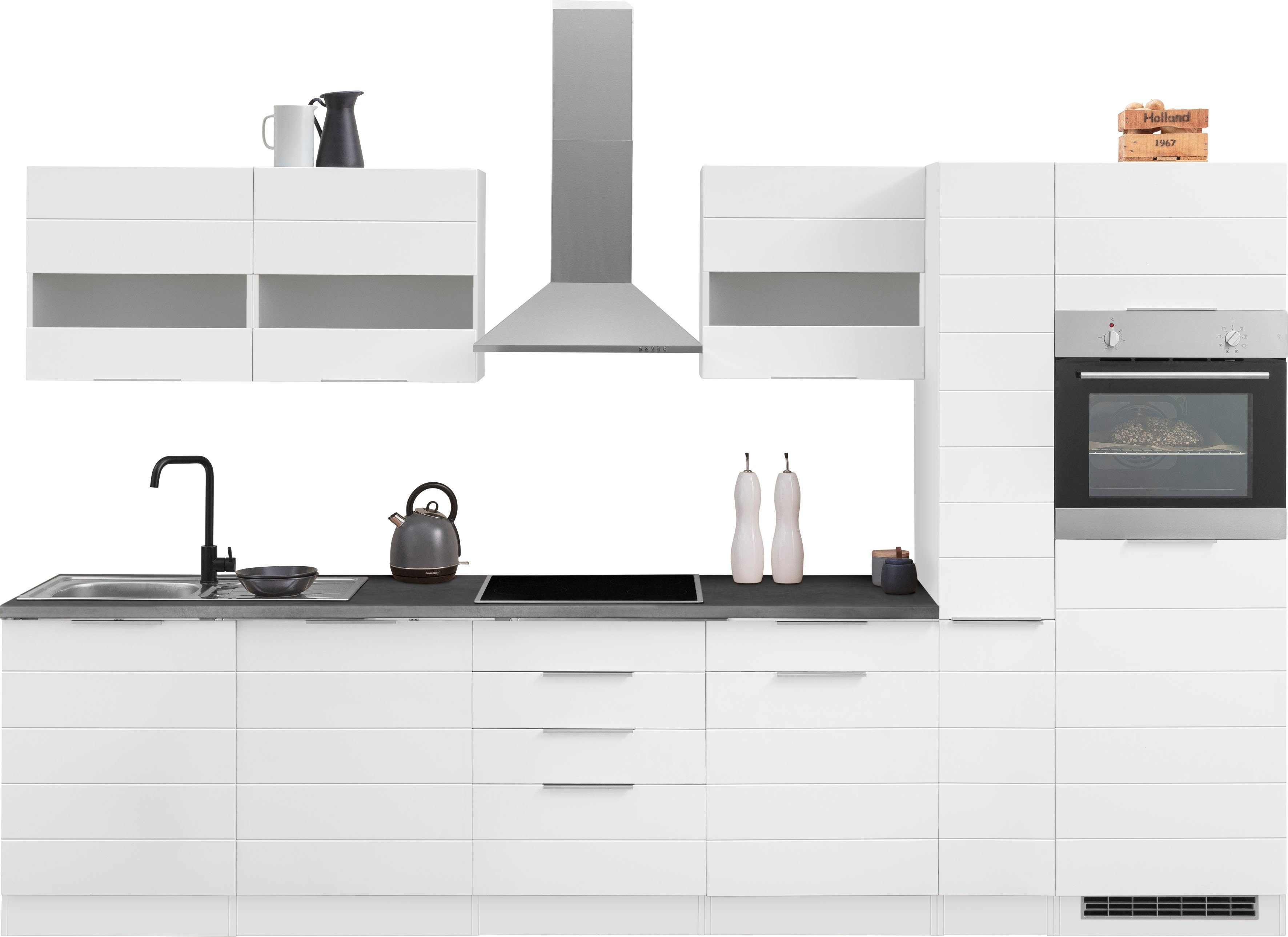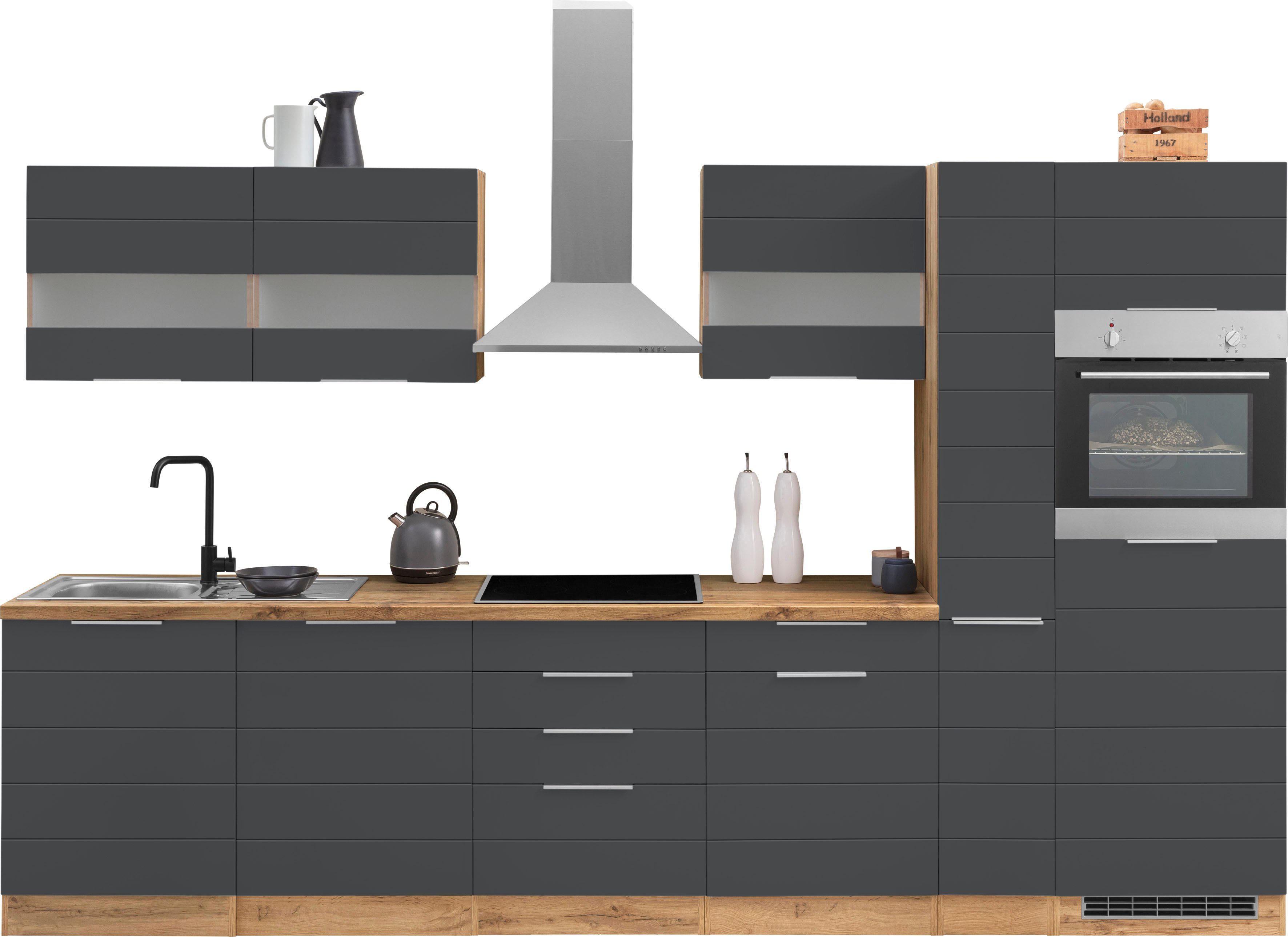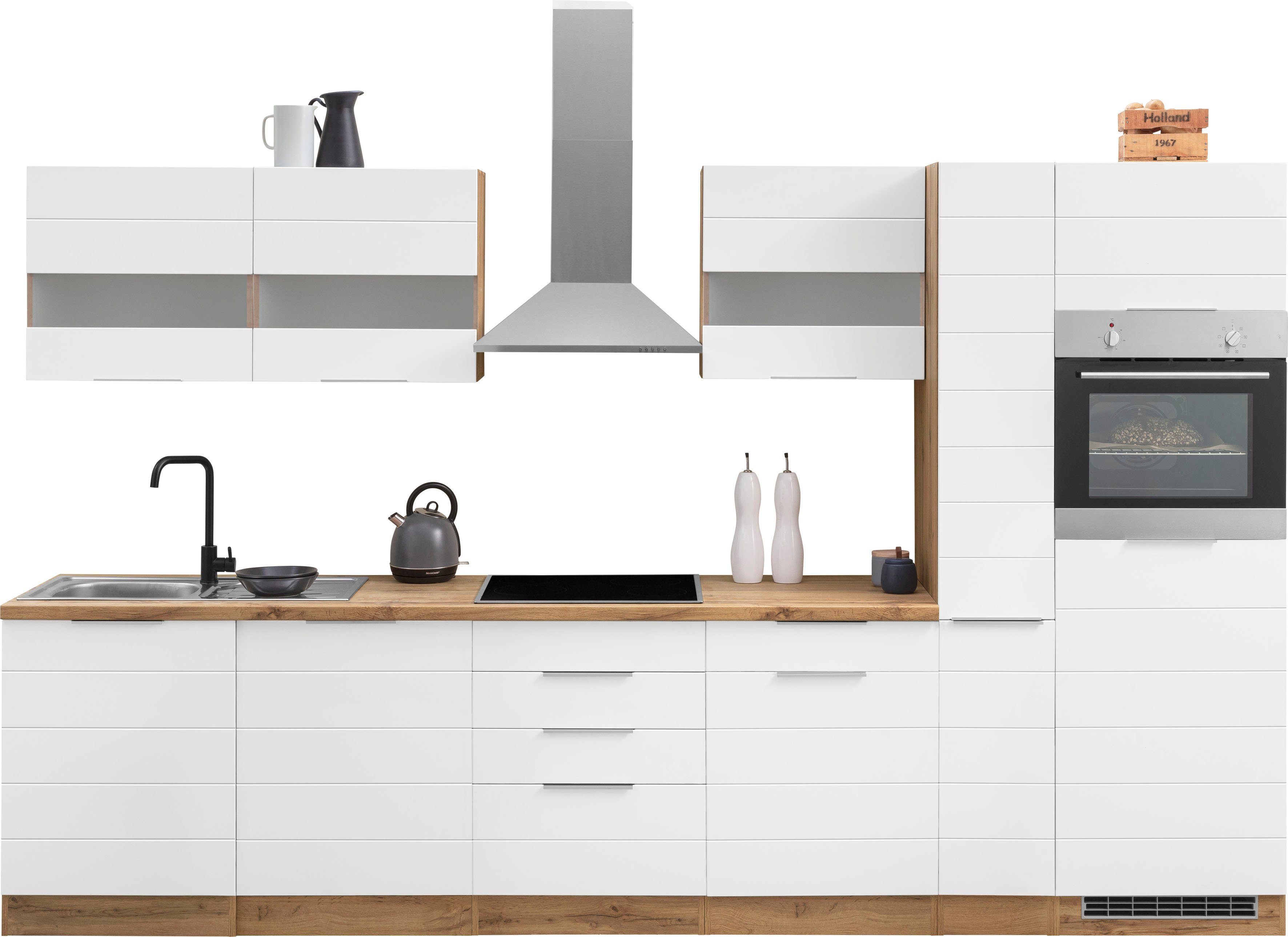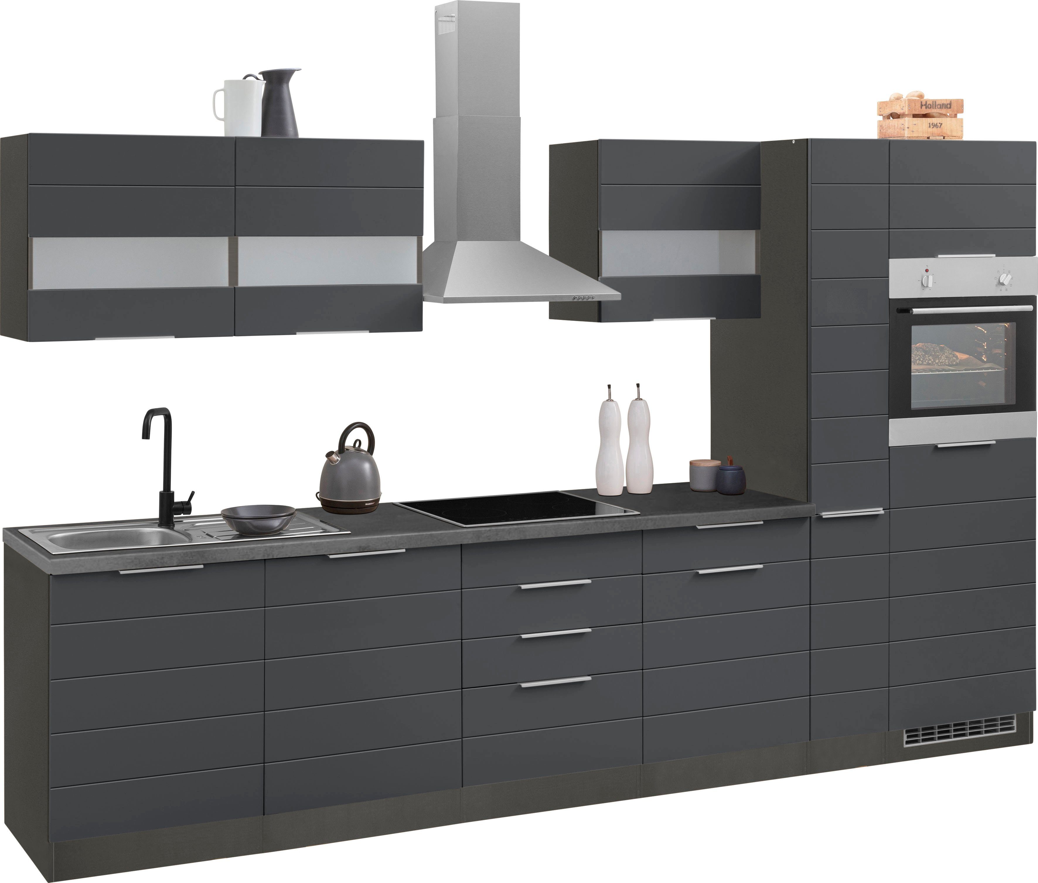 Ausstattung | Durchgehende Arbeitsplatte Einlegeböden höhenverstellbar Griffleiste Metallgriffe Seitenverkehrt stellbar Türen wahlweise rechts/links montierbar inkl. Edelstahl-Einbauspüle, mit Abtropffläche ohne E-Geräte |