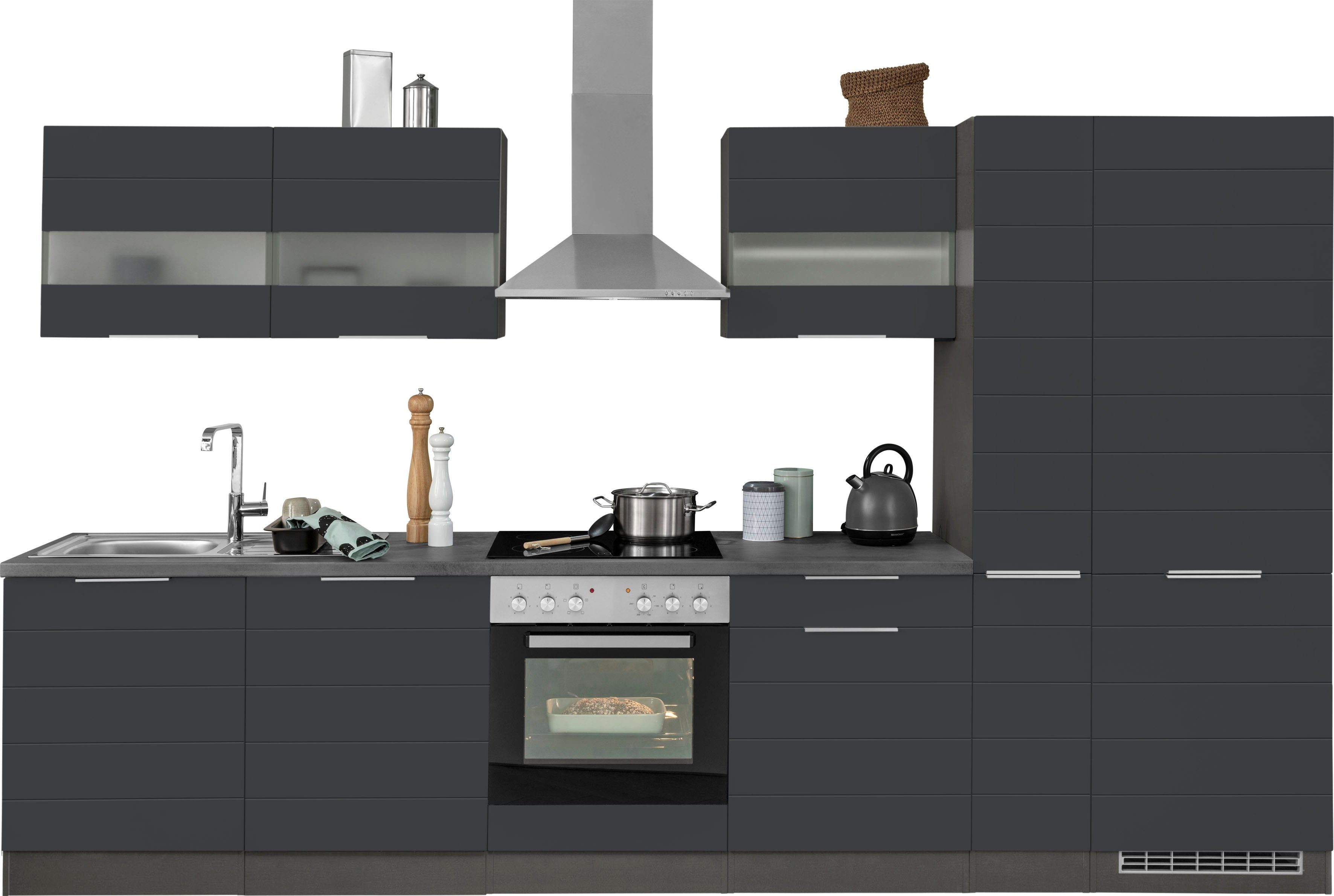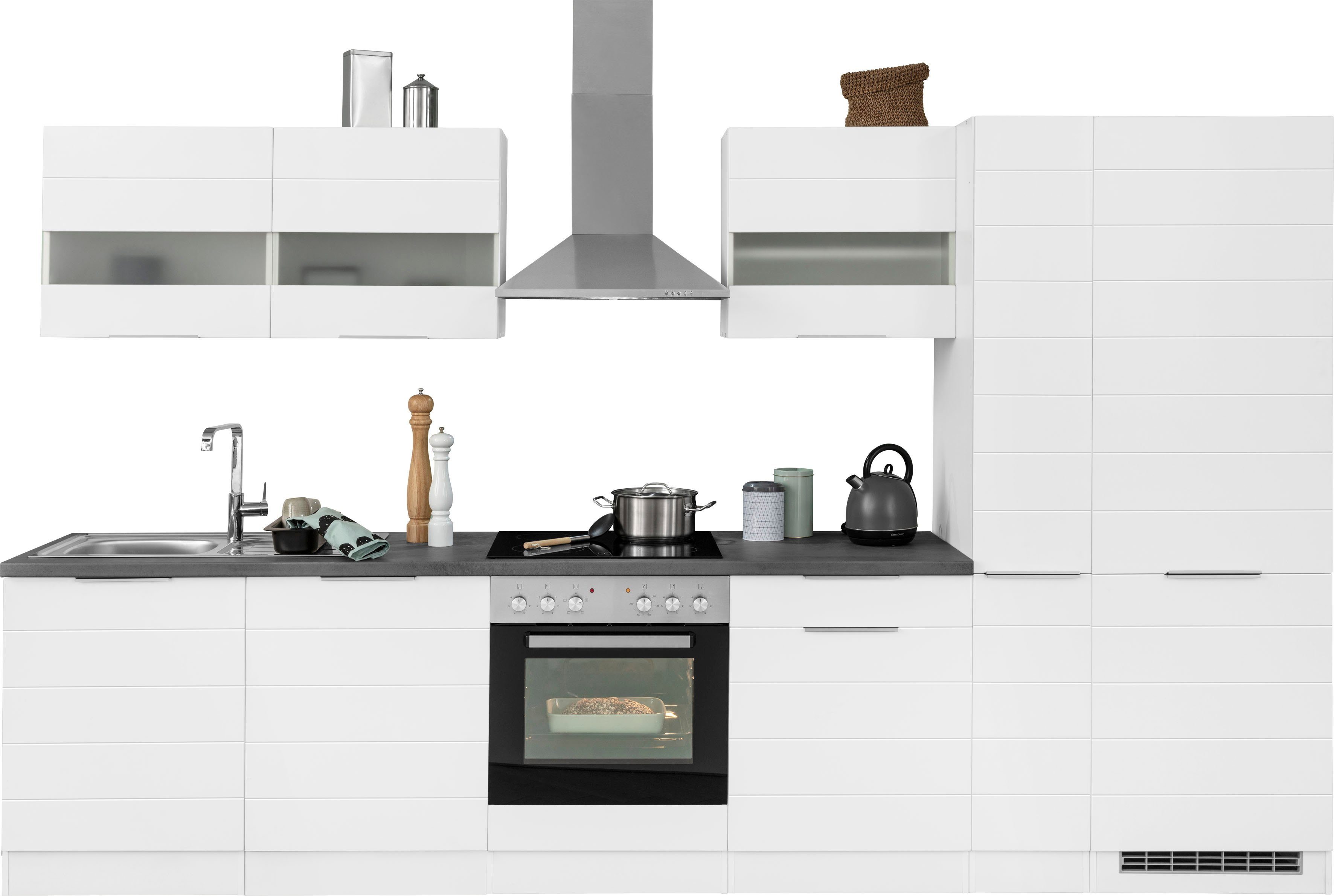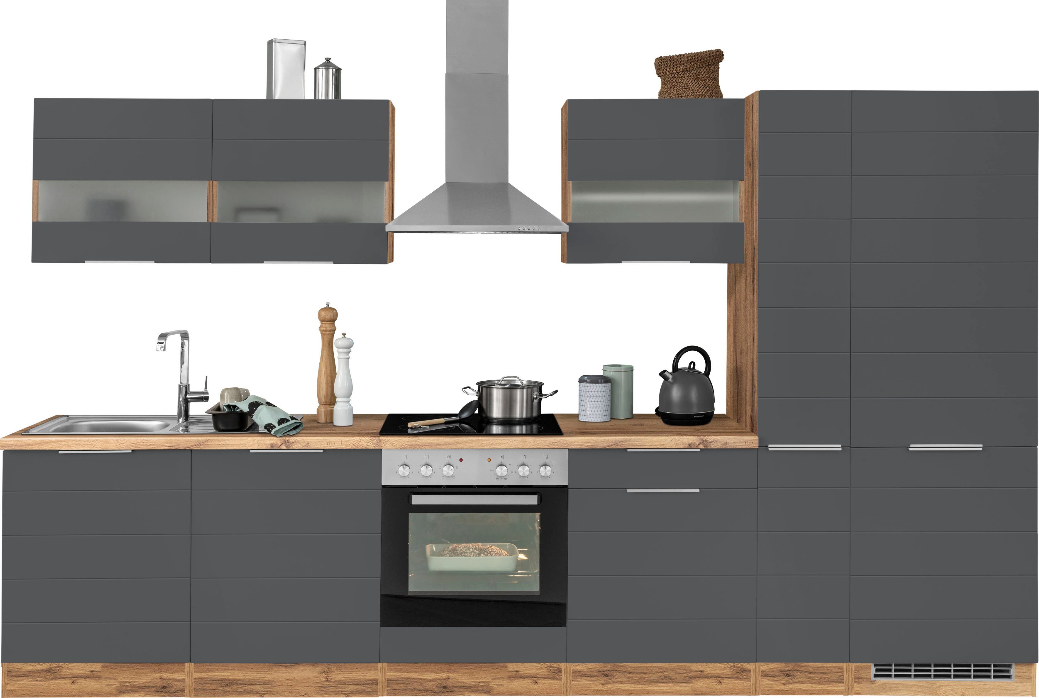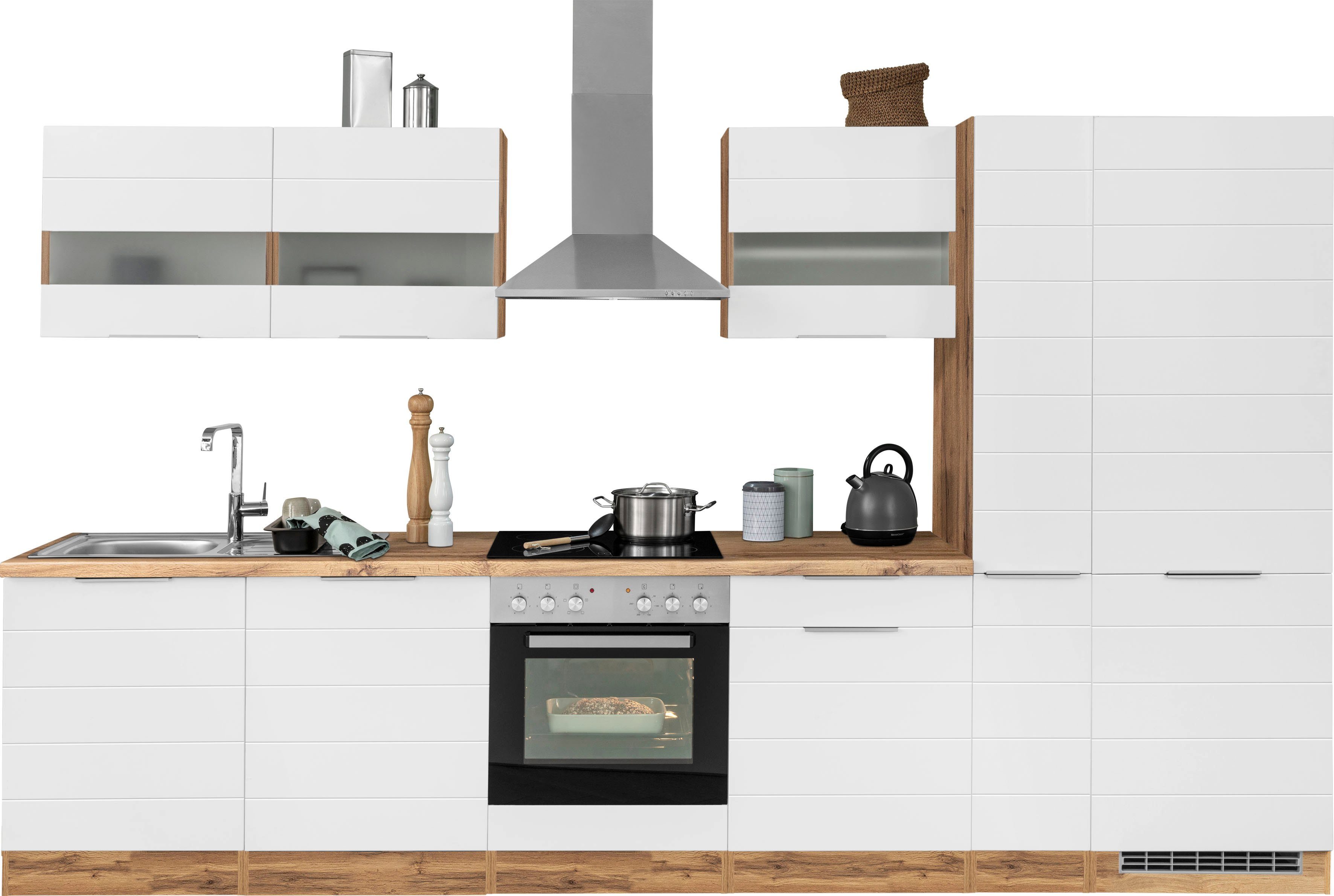Ausstattung | Durchgehende Arbeitsplatte Einlegeböden höhenverstellbar Griffleiste Metallgriffe Seitenverkehrt stellbar Türen wahlweise rechts/links montierbar inkl. Edelstahl-Einbauspüle, mit Abtropffläche ohne E-Geräte |