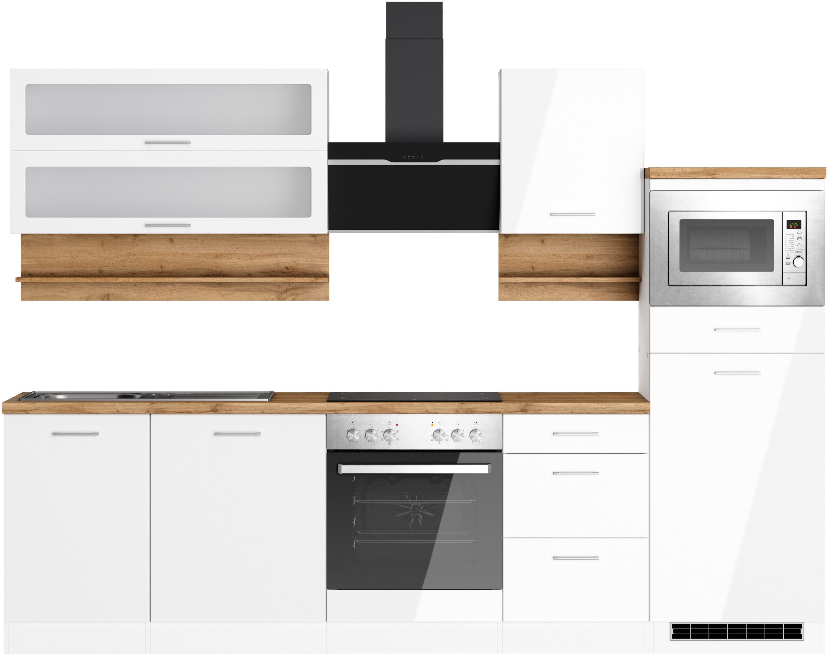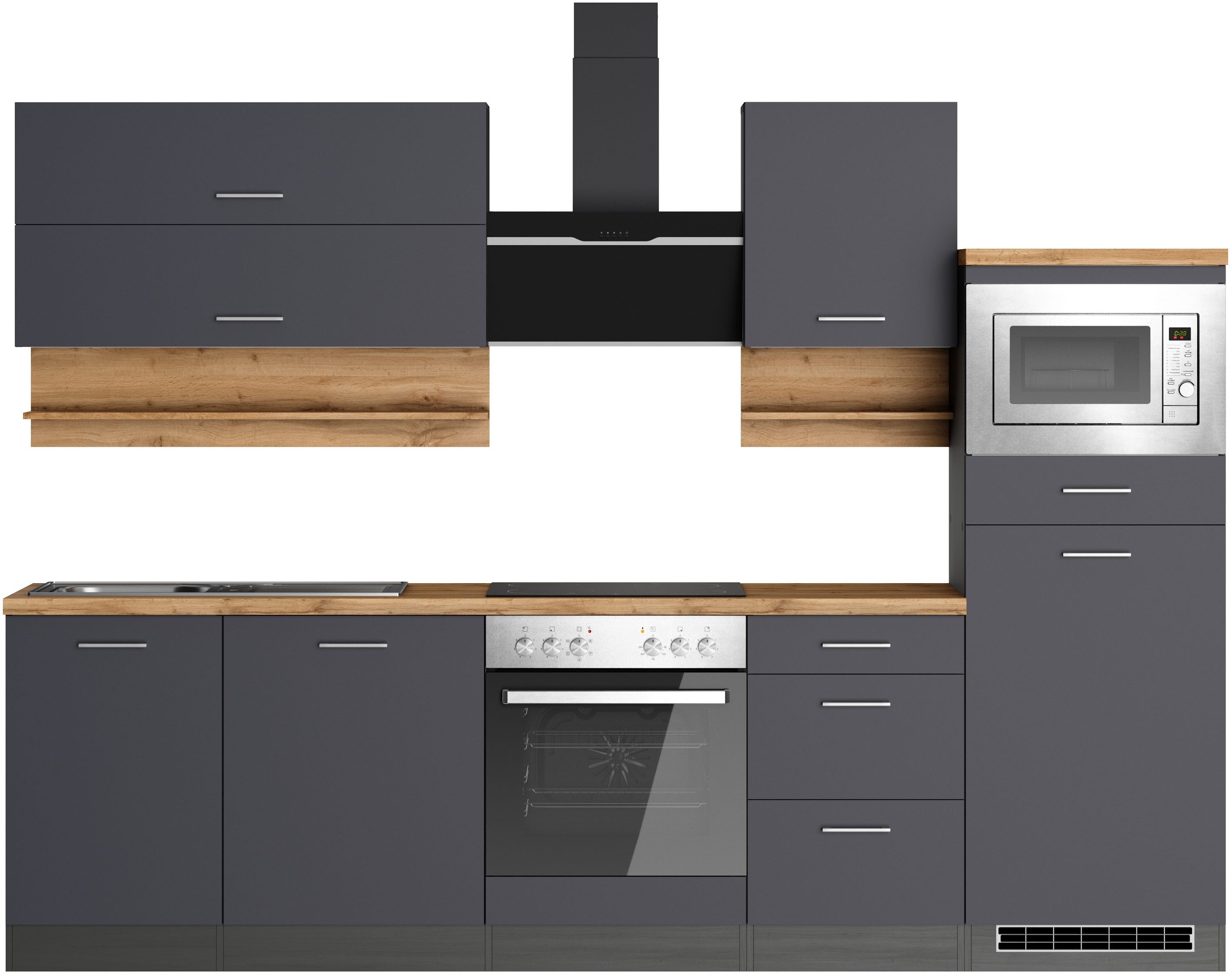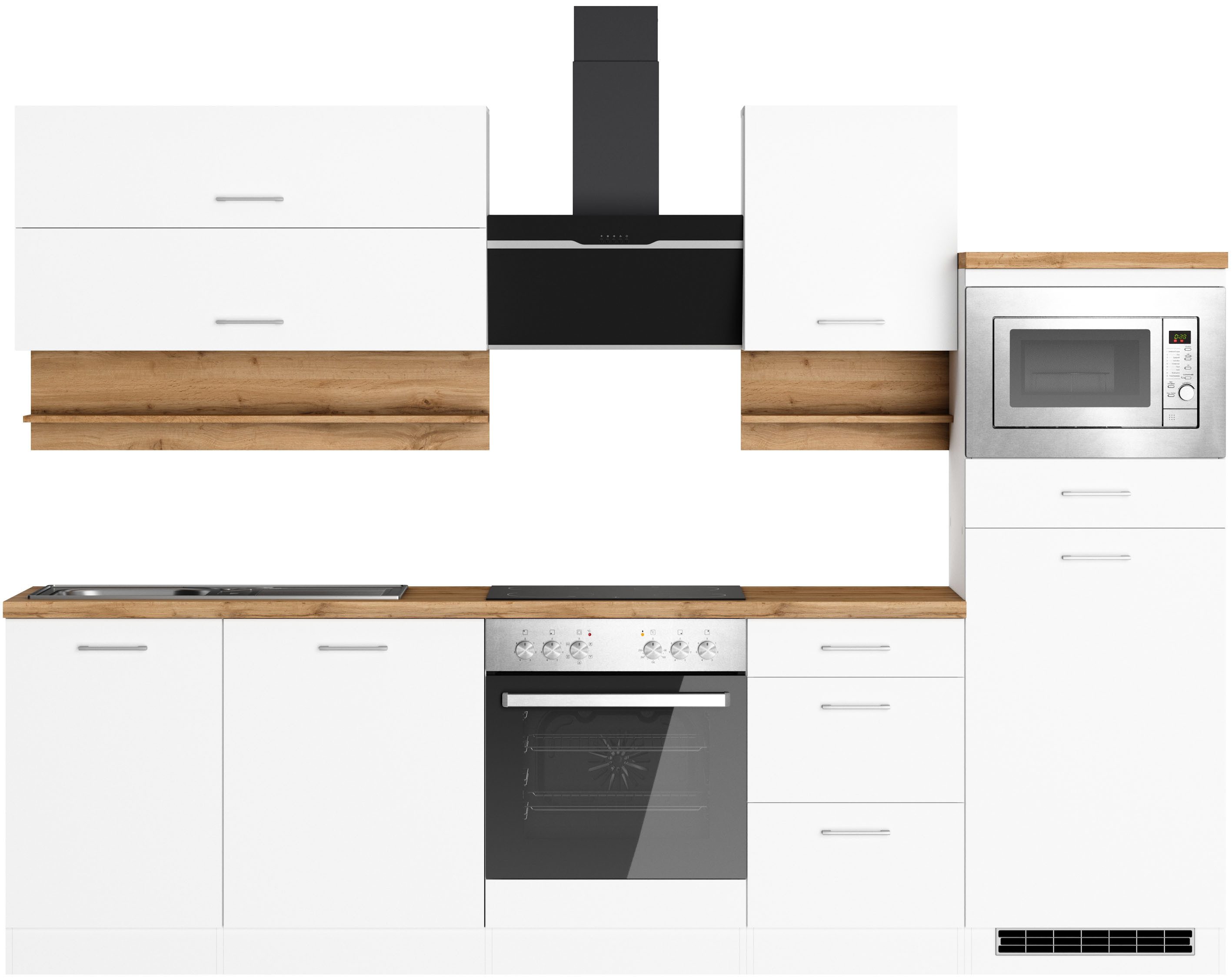 Ausstattung | Durchgehende Arbeitsplatte Einlegeböden höhenverstellbar Laufleisten der Schubkästen aus Metall Stellschrauben in den Unterschränken als Montagehilfe zum Ausgleichen von Unebenheiten: 0-4 cm inkl. Edelstahl-Auflagespüle, mit Abtropffläche ohne E-Geräte |