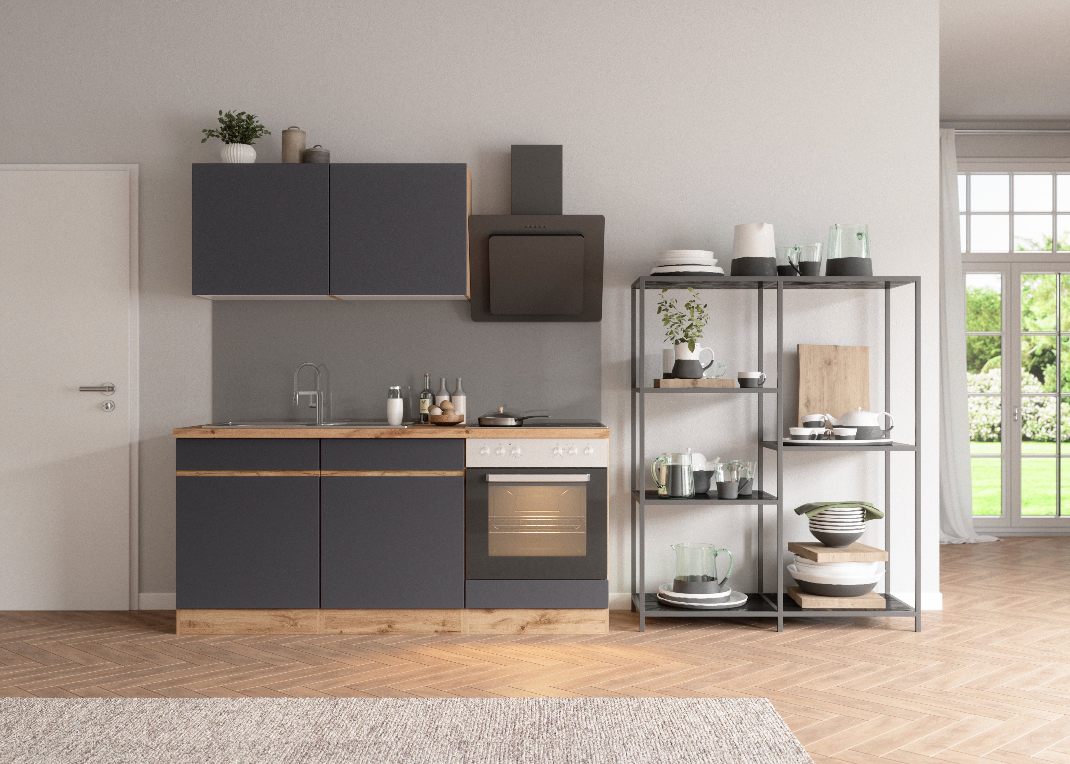 Ausstattung | Durchgehende Arbeitsplatte Einlegeböden höhenverstellbar Seitenverkehrt stellbar Sockelhöhe nicht verstellbar Stellschrauben in den Unterschränken als Montagehilfe zum Ausgleichen von Unebenheiten: 0-4 cm Türen wahlweise rechts/links montierbar inkl. Edelstahl-Auflagespüle, mit Abtropffläche ohne E-Geräte |