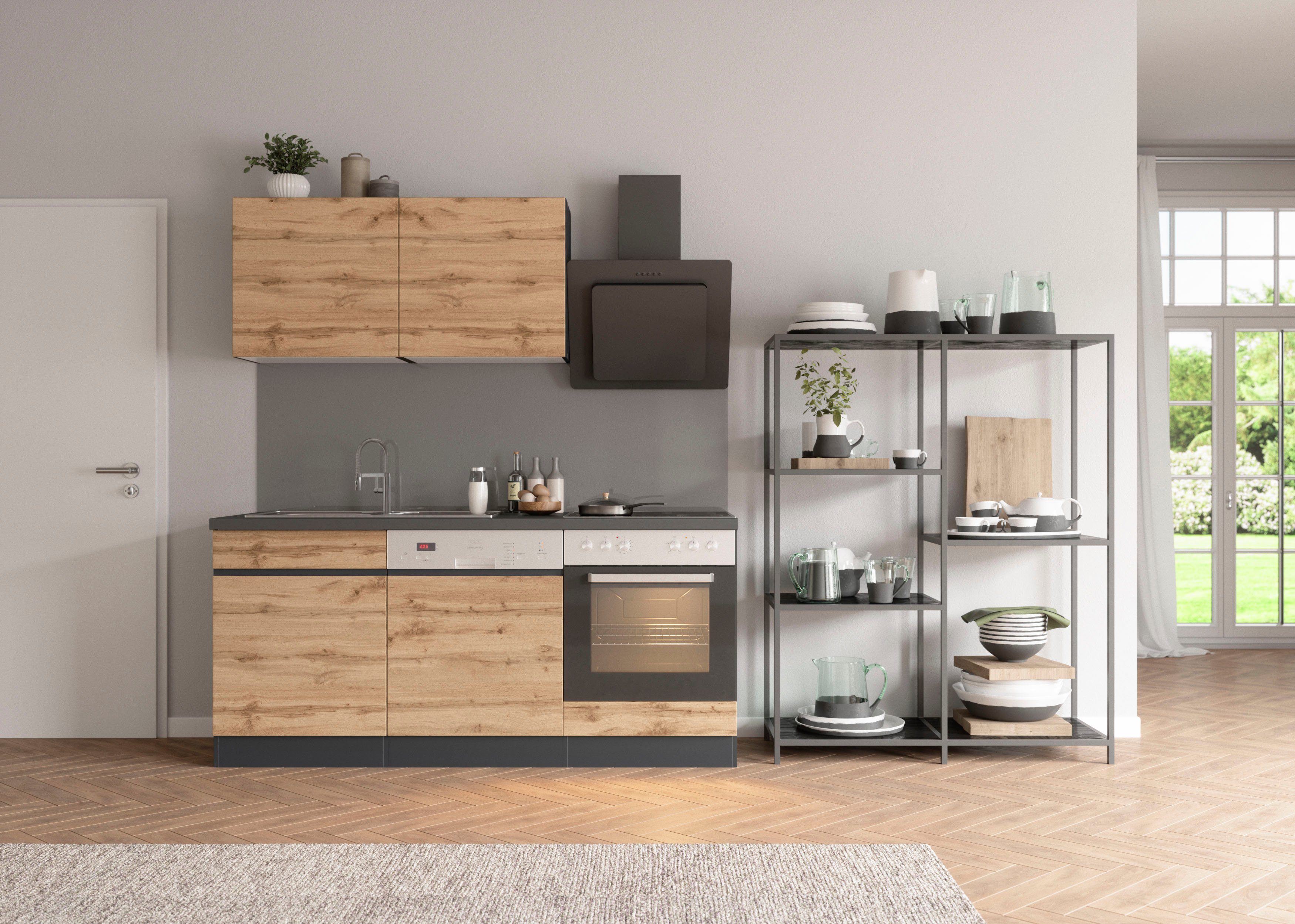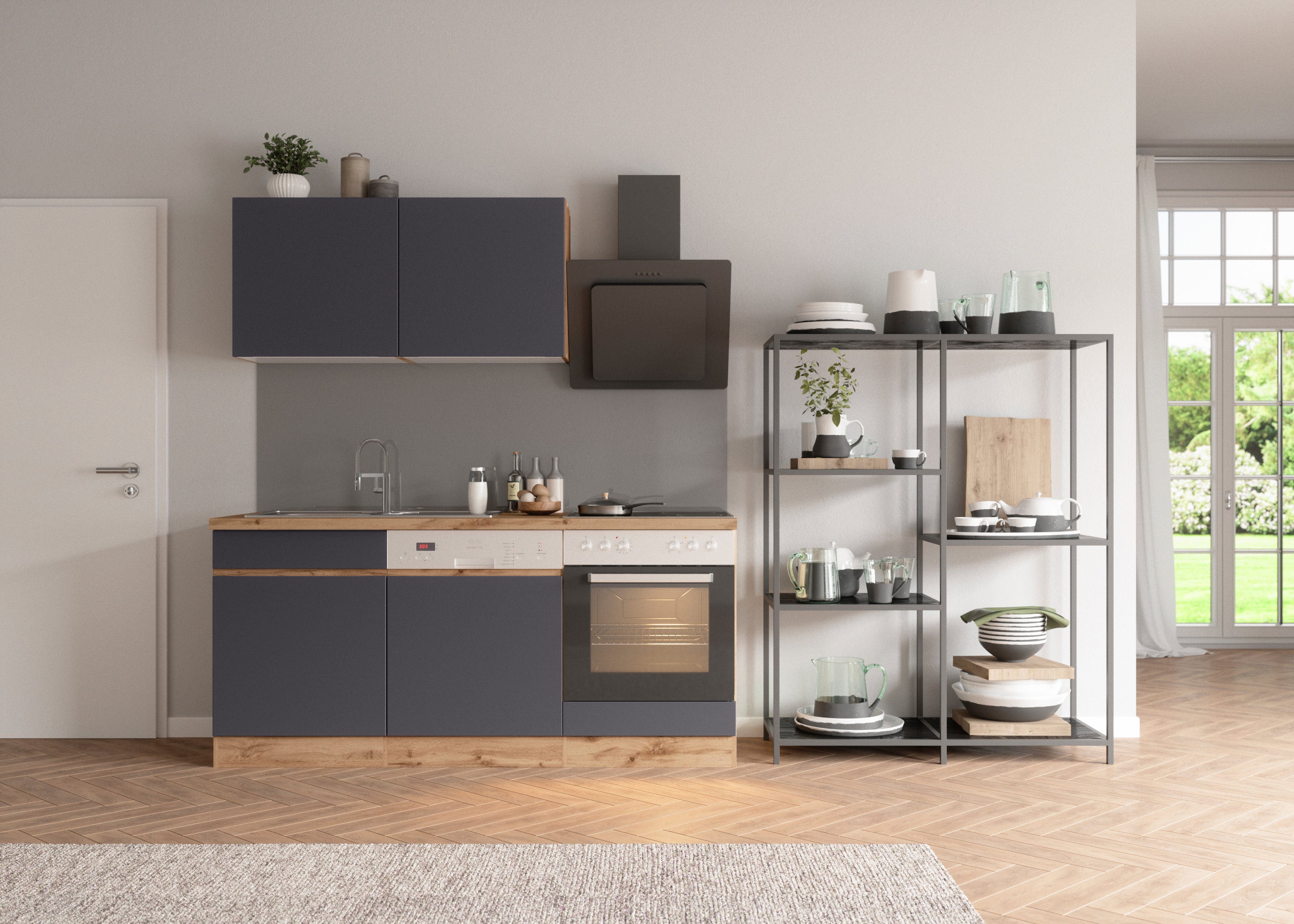 Ausstattung | Durchgehende Arbeitsplatte Einlegeböden höhenverstellbar Seitenverkehrt stellbar Sockelhöhe nicht verstellbar Stellschrauben in den Unterschränken als Montagehilfe zum Ausgleichen von Unebenheiten: 0-4 cm Türen wahlweise rechts/links montierbar inkl. Edelstahl-Auflagespüle, mit Abtropffläche ohne E-Geräte |